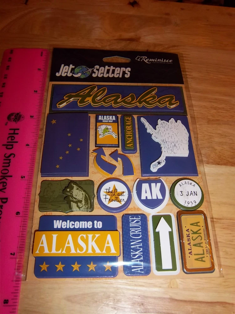 Acid Free 3D Alaska Stickers 15 stickers - there's AK Flag, state map, and more! Acid Free 3D Ideal for Scrap-booking, cards and other crafts We have more scrapbook items available! Click here to check them out - we have header cards, stickers, die cuts and more :) Hello from Alaska ** Any questions about this item, please ask :) ** ** We do combine shipping - if wanting a quote - just ask :) ** * We offer local pick-up (we have a storefront in Fairbanks, Alaska - it's called Alaska Transfers & Design in the Regency Court Mall on College Road) * Click here to check out our other items! We have LOTS of vintage items, Alaska souvenirs, collectibles, novelties and much more listed in our store !! **Customers Buying Multiple items** If you purchase more then 1 item please DO NOT pay for each separately - Please put all the items you want to buy in the cart, then use the " ask the seller for a total " option, so we can send you a new invoice with the postage set correctly for multiple items, it may save you $$ in shipping costs - I am told that option is hard to find on the phone app - no worries, we do refund shipping overages. SHIPPING NOTES: We offer 1 day handling , meaning we mail items within 24 hours of purchase (except on weekends and non mailing holidays of course) , but seeing how we are in North Pole Alaska, items may take 3-5 days longer to arrive at the destination than what eBay's notice quotes. They no longer process mail in Alaska, so an item I mail here takes 1 day to get from North Pole to Anchorage, then usually 1 day to be flown to a processing center, then 1 day to get sorted. So there's a lag time of about 3 days in there that eBay does not take into consideration for Sellers that are in Alaska. So please keep that in mind when buying from us to add those extra travel days to the expected arrival time that eBay sends you. Thank You! **Sales Tax** eBay does collect sales tax for towns & states that have a sales tax - we personally do not see any of that money, it is handled by eBay. **International Buyers** – We ship internationally using eBay's Global Shipping Program **special note on arrival times International mail has taken anywhere from 7 days to a month to arrive, (item can be held up in customs or at anywhere along the line) this is just how the postal system works, we mail things out the same day / next day after the item is paid for and hopefully that helps in getting the item to you as fast as the postal system can get it there. *** Please Note: The photos are taken on a measuring mat or next to a ruler for sizing. Measurements are in 1 inch increments - if you have a question about the measurements, please ask...