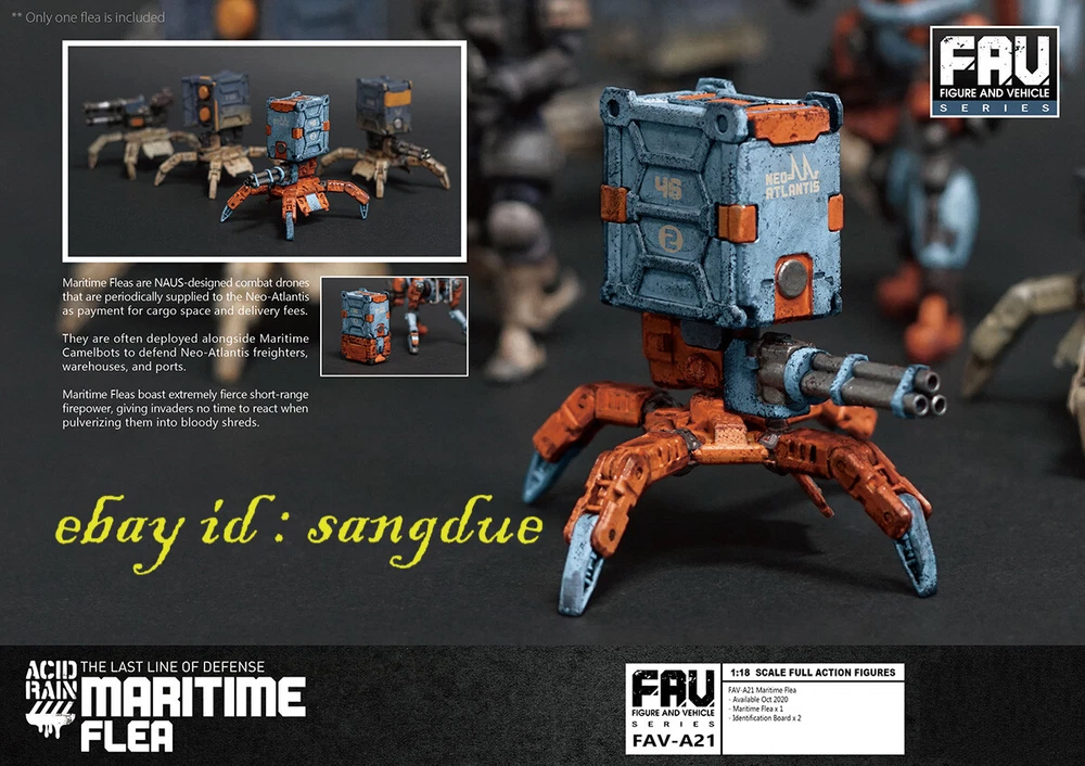 Acid Rain World 1/18 FAV-A21 THE LAST LINE OF DEFENSE Maritime Flea in stock Items Description: Material: PVC Size:1/18 FAV-A21 Maritime Flea Content: - Maritime Flea -Identification Board The Sea Flea is an all-terrain combat drone developed and manufactured by NAUS, which is supplied to the New Atlantis Group in exchange for cargo space quota and deduction for freight service charges. It is often deployed on freighters, warehouses, and harbors with sea camelmen to perform escort duties. The short-range firepower of the sea flea's instantaneous burst is ferocious, and the intruders often turn into a bloody fog before they can respond. Please NOTE: 1. Product size measurement allows for errors of 1-2cm (0.39-0.79 inches). 2. Due to the light and screen difference, the item's color may be slightly different from the picture. 3.Commodity origin: At present, the hand-made model factories on the earth are basically established in China. After foreign brands are developed, they will be produced and processed in China, so the products will be printed with the words "made in china" or "made in China". But don’t worry, folks, all genuine products will be shipped to the market after strict quality inspection by the developer. 4.Regarding the difference between genuine and pirated versions: Although both the genuine hand-made models and the pirated products are from Chinese factories, they are not comparable in quality. However, since the quality inspection of hand-made polishing and coloring is done manually, it is inevitable that there will be defects. If you mind, please do not place an order to buy. +++++++++++++++++++++++++++++++++++++++++++++++++++++++++++++++++++++++++++++++++++++ Payment We accept Payoneer/PayPal/ Google Pay /Visa / Master Card /Amex /Discover Payments If you have any questions about payment. Please feel free to contact me. Shippment We will pack and deliver the goods within 7 days after the order is paid to the shipping company. If you need to change the delivery address, please inform us before payment. We send it all over the world by air mail. In the United States and major European countries, we will use speedpak, a logistics company recommended by eBay, to ship goods within 8 to 12 days. Other countries usually take 8 to 25 days, but sometimes it may take about 30 days to arrive. If you do not receive the package for more than 30 days, please contact us and we will help you solve the problem (reissue or full refund). Return Policy If you have any questions about the transaction, such as defects or dissatisfaction, you can return and replace the goods within 7 days after receiving the goods. We will make our judgment according to the actual situation. In principle, the freight for return shall be borne by the responsible party. Please contact us before leaving any feedback and give us an opportunity. We will try our best to find a solution that satisfies you. About us & Feedback 1. We provide high-quality brand new products and priority customer service. Your satisfaction is what we are keep trying to do. 2. Every customer is important for us, if you are happy with our service and product please give us positive feedback, thank you for your effort ! 3. The star-scores are very important to us, If anything about your transaction did not meet your expectations. Please let us know and give us the opportunity to work out for you before you leave a negative feedback. 4. If any question about you received product, please feel free to contact us via Ebay Message or email, we will reply to you within 12 hours. 5. If you have not received the goods, please contact us in time, If the goods are lost by the logistics company, we will make compensation.