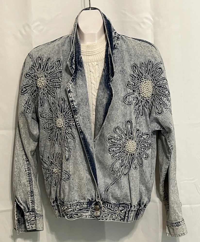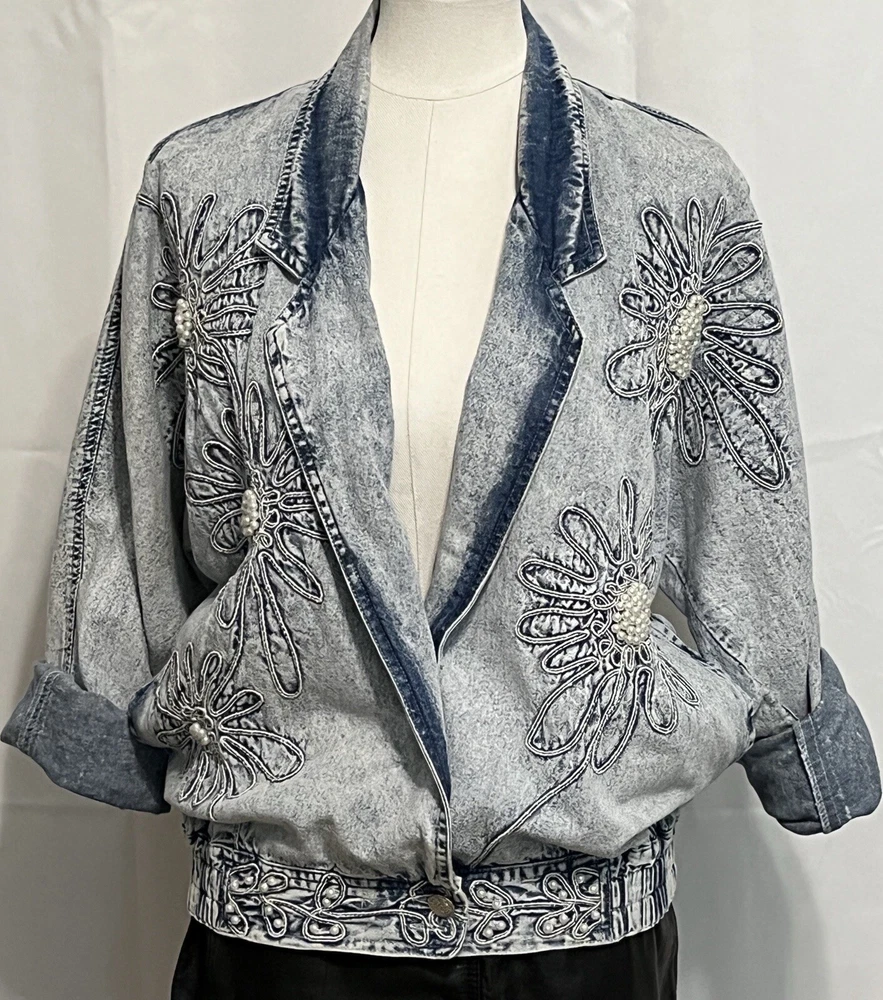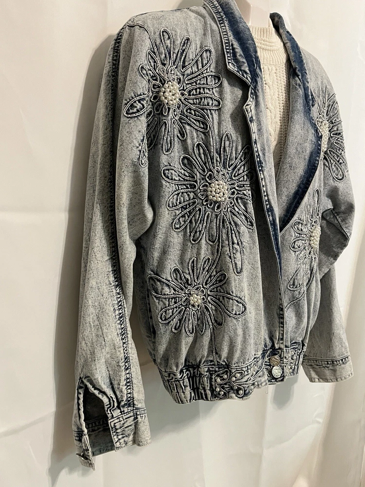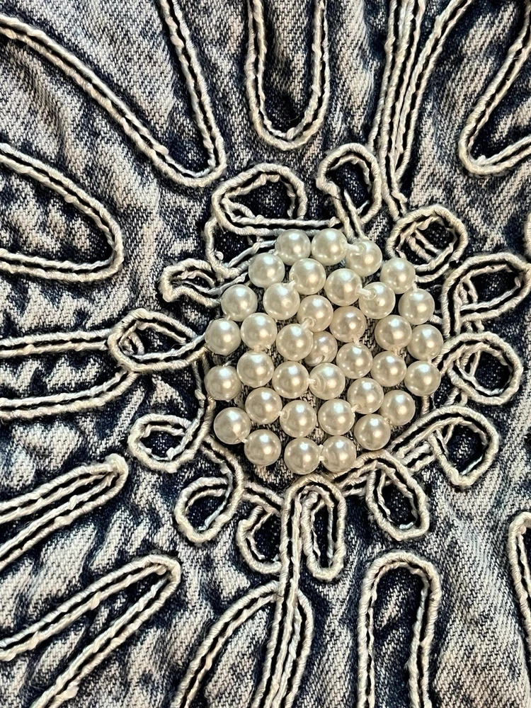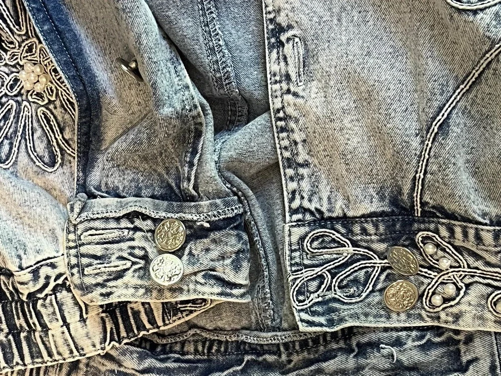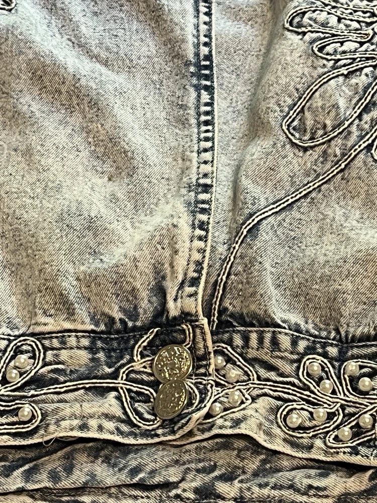 100% cotton, lightweight denim. White “pearl” beads are bright and all present. Jacket is in very good condition, no stains or damage. There are strips of velcro sewn into the shoulder seams, pads not included. Side-seam pockets. Shown with other clothes so you can see how it hangs, not included. Skirt listed separately. Tagged size medium, see all pictures for details. Sleeve from center back collar to cuff about 33 1/2”.