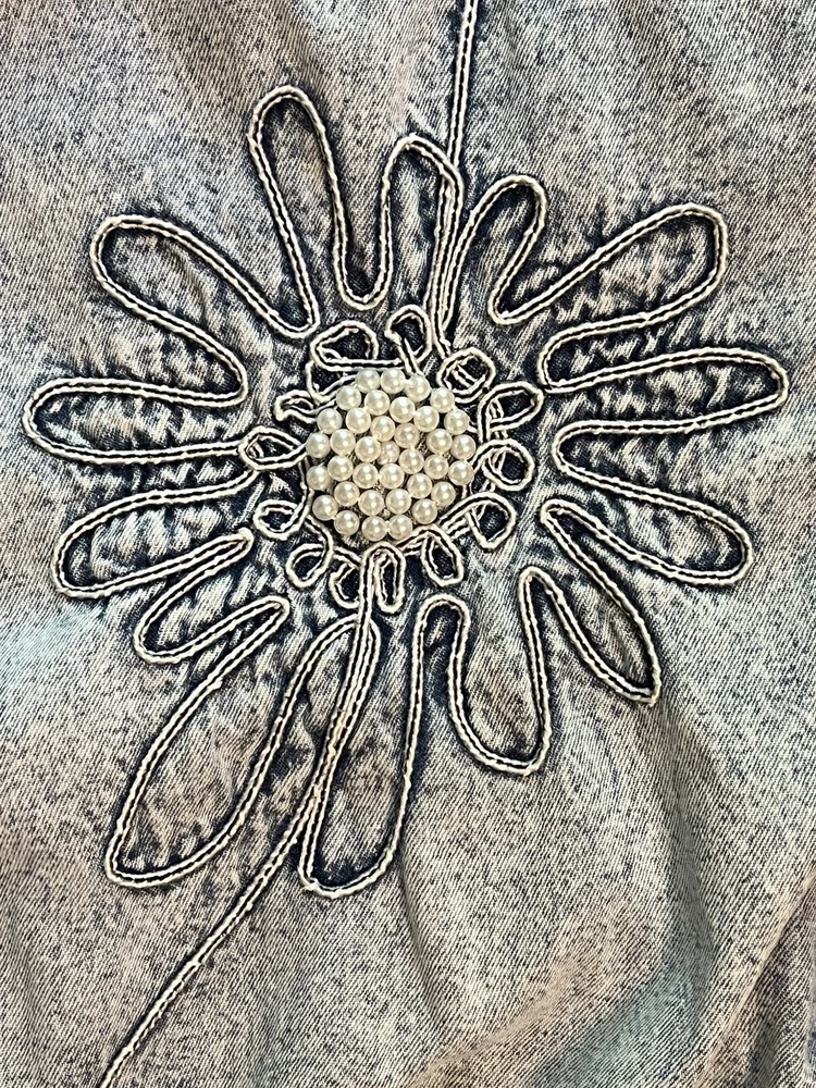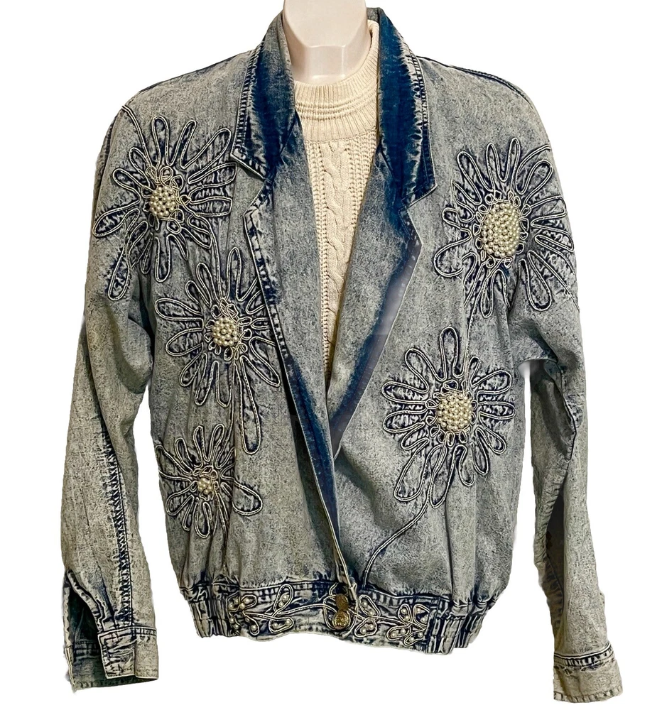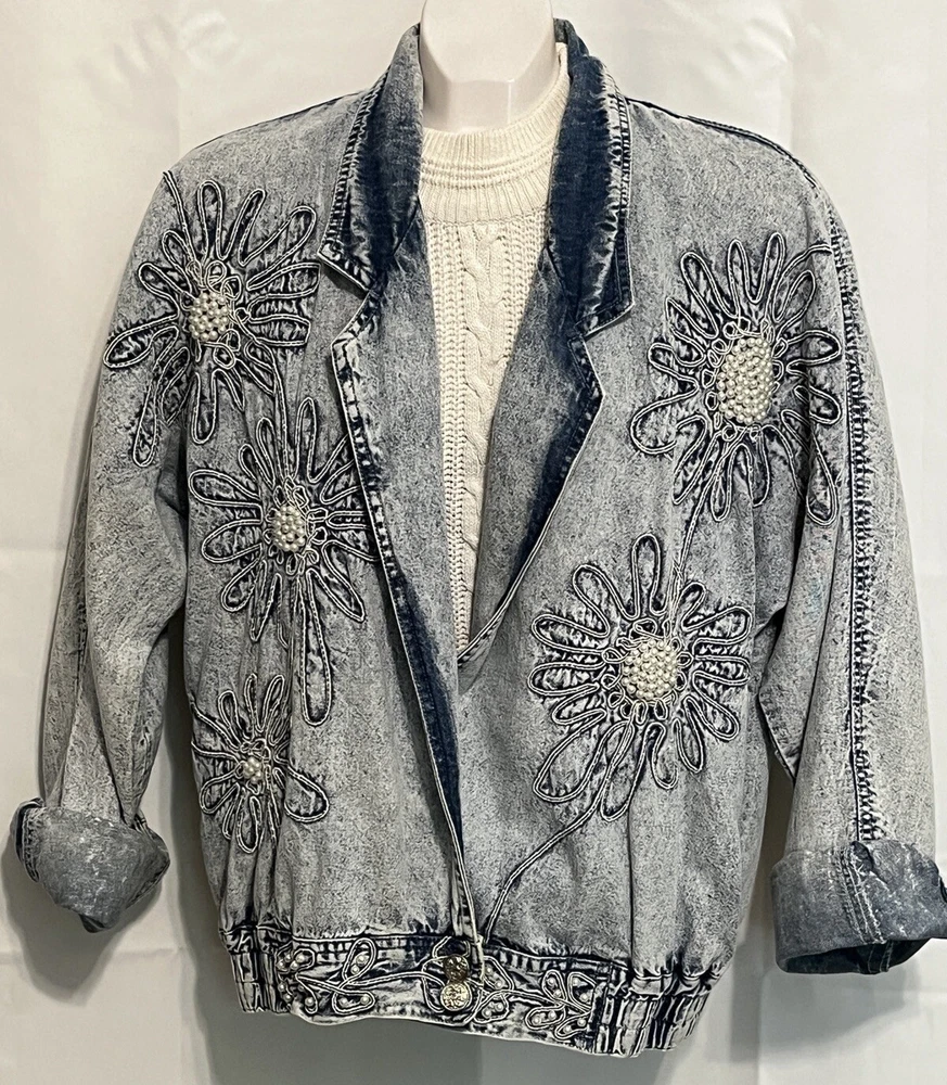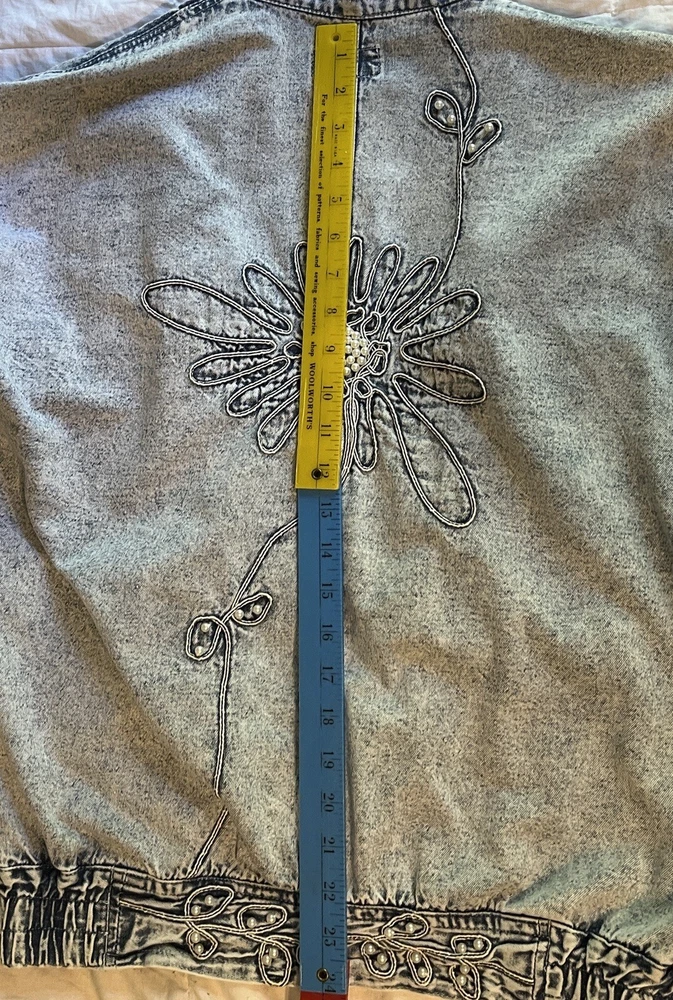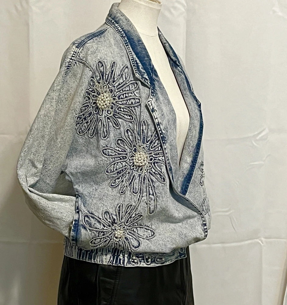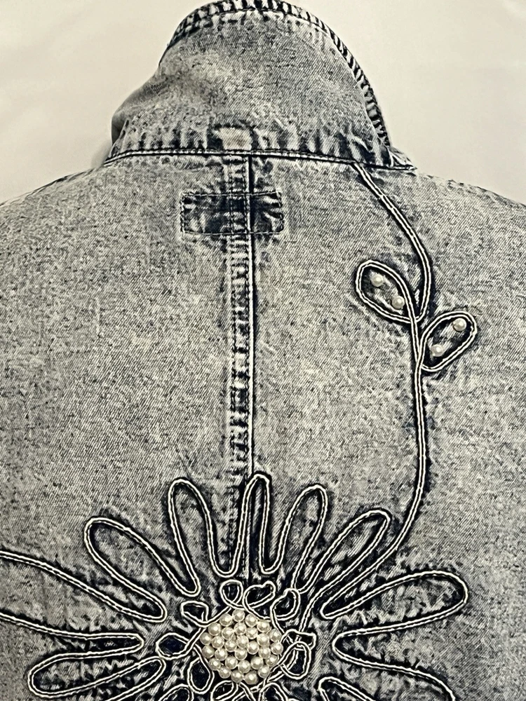 100% cotton, lightweight denim. White “pearl” beads are bright and all present. Jacket is in very good condition, no stains or damage. There are strips of velcro sewn into the shoulder seams, pads not included. Side-seam pockets. Shown with other clothes so you can see how it hangs, not included. Skirt listed separately. Tagged size medium, see all pictures for details. Sleeve from center back collar to cuff about 33 1/2”.