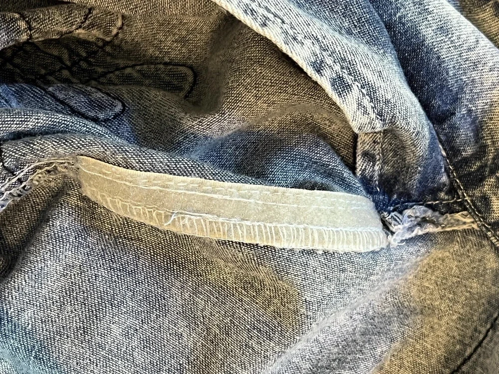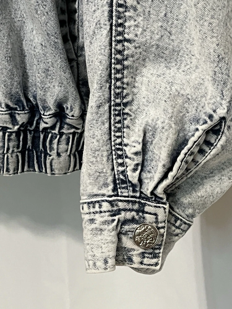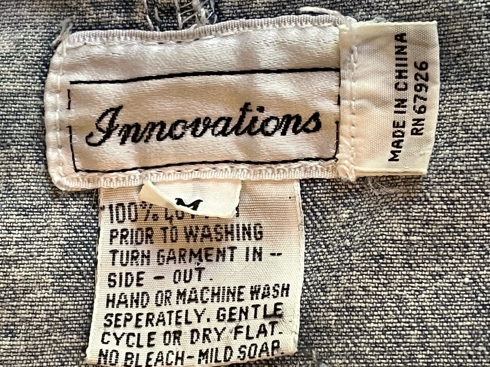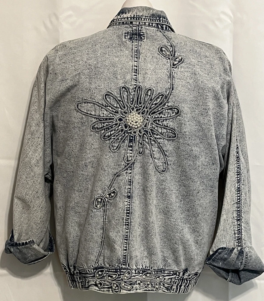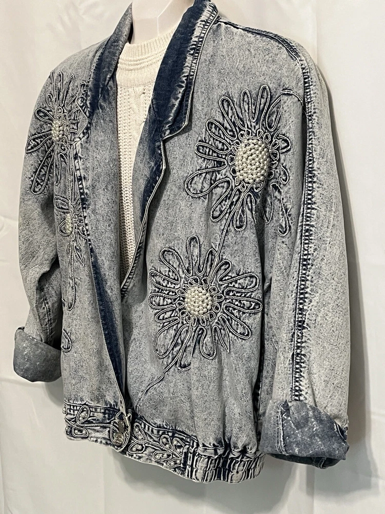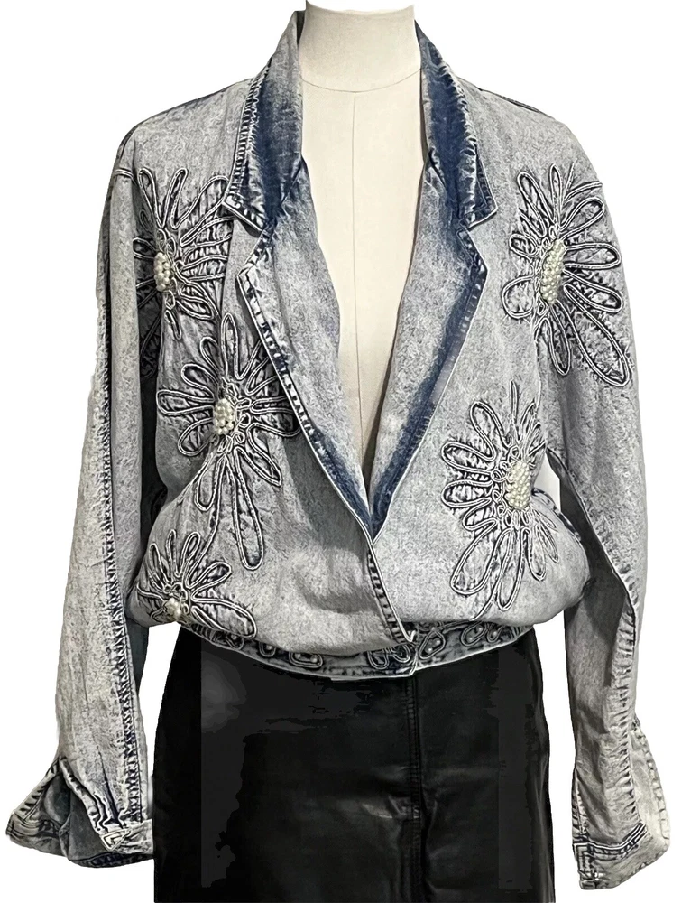 100% cotton, lightweight denim. White “pearl” beads are bright and all present. Jacket is in very good condition, no stains or damage. There are strips of velcro sewn into the shoulder seams, pads not included. Side-seam pockets. Shown with other clothes so you can see how it hangs, not included. Skirt listed separately. Tagged size medium, see all pictures for details. Sleeve from center back collar to cuff about 33 1/2”.