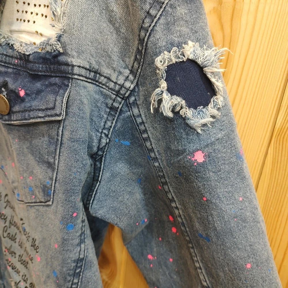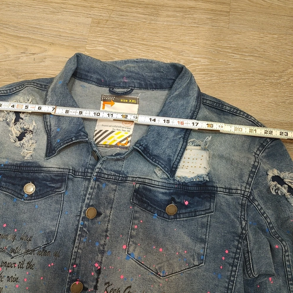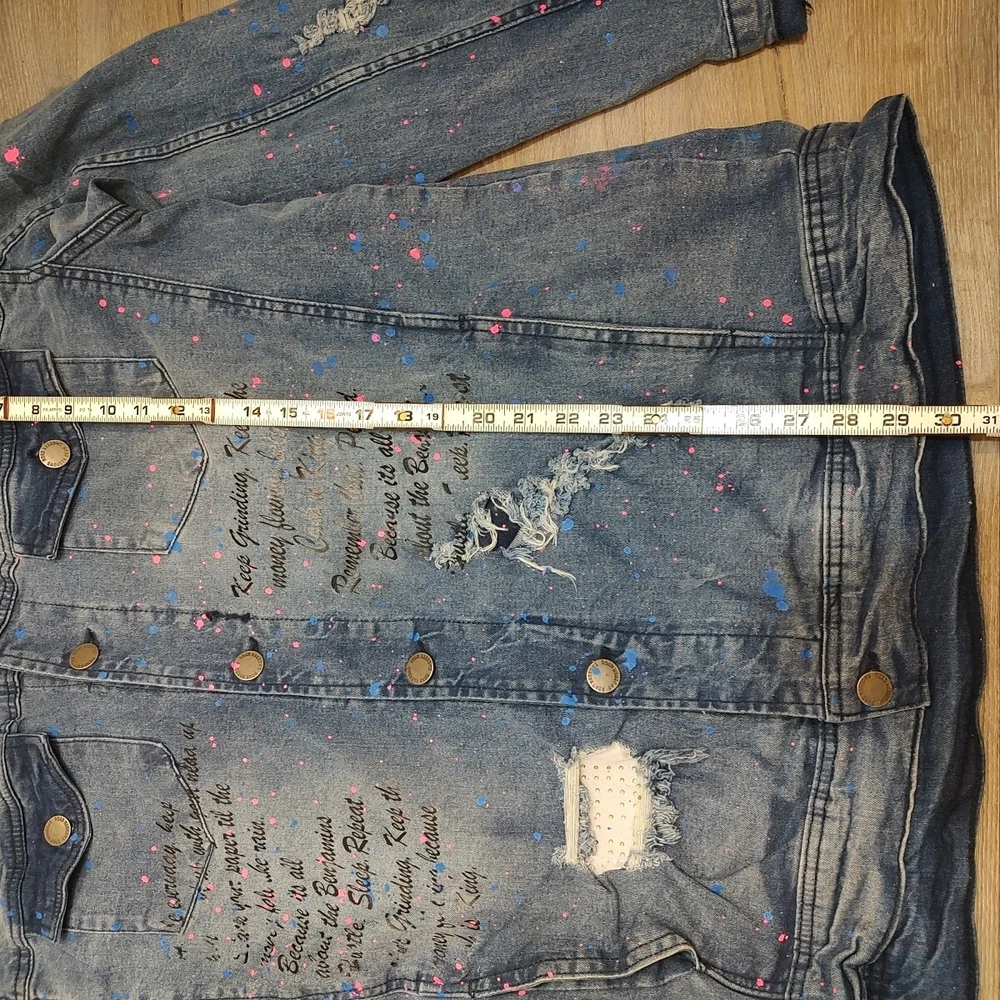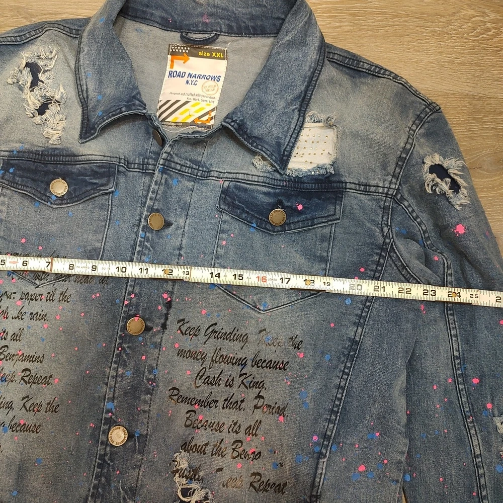 Elevate your style with this stunning denim jacket from Road Narrows Inc. based out of New York City.The jacket features a unique patchwork design with distressed fringe, patches and rhinestone accents, making it a perfect choice for any occasion - from casual to workwear and even parties. The button closure and oversized fit add to the relaxed vibe, while the stretch fabric ensures comfort all year round. This jacket comes in a beautiful acid washed blue color with a paint splatter pattern and is perfect for women who love designer, Christmas, colorful, boutique, college, 80s, city, and 90s themes. The jacket has inner pockets, making it easy to carry your essentials. It is machine washable and can be worn in any season. Get your hands on this stunning jacket today! Shoulder 22" Bust 23" Length 30" Sleeve 22" Jacket is cotton and spandex and is a rare find only sold in boutiques. It does have a lot of distressing and the words are partially gone due to wash and wear but add to the unique style.