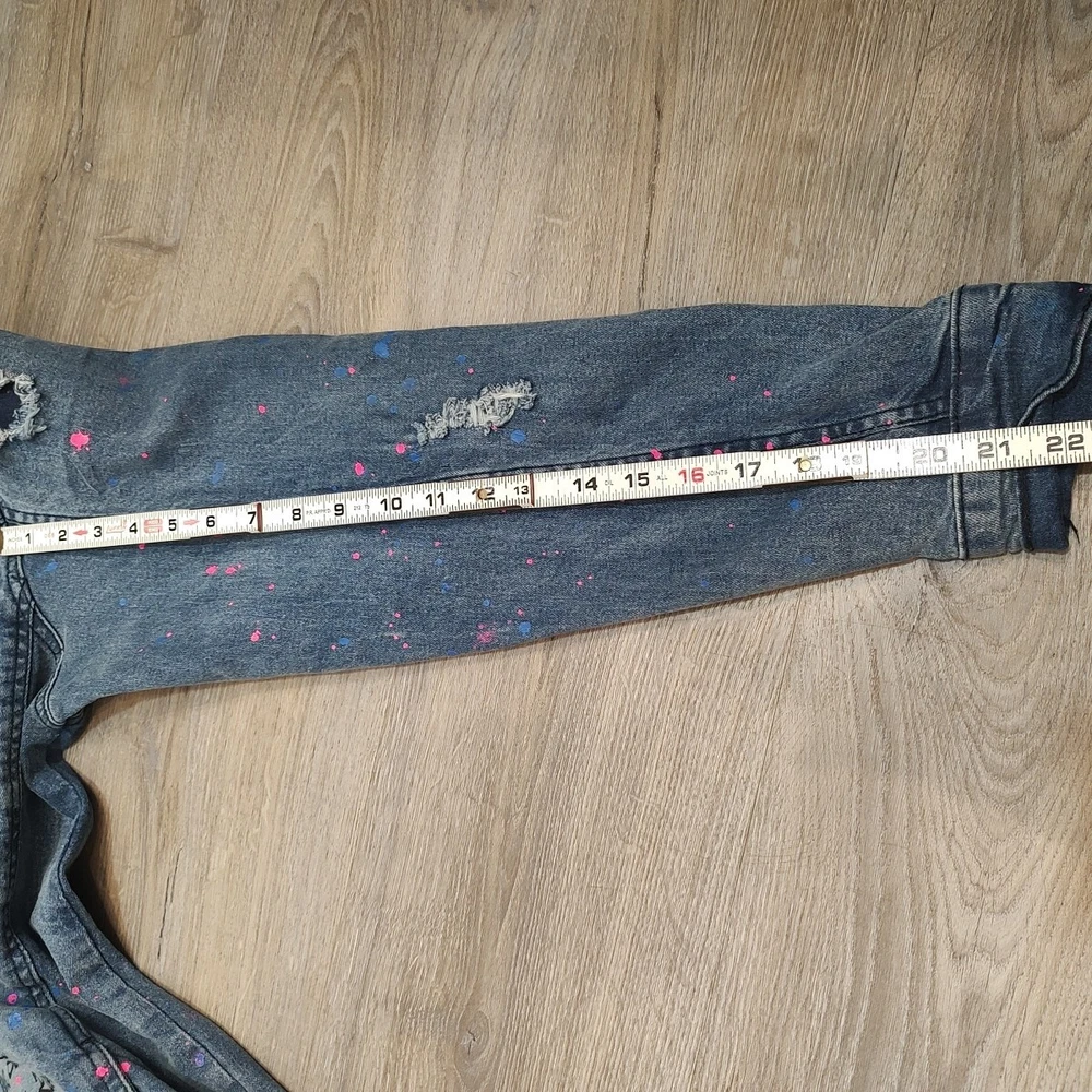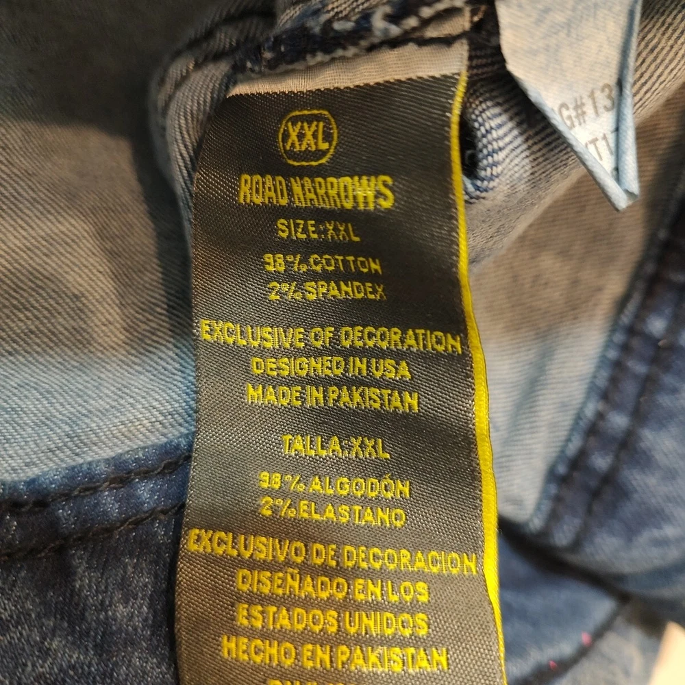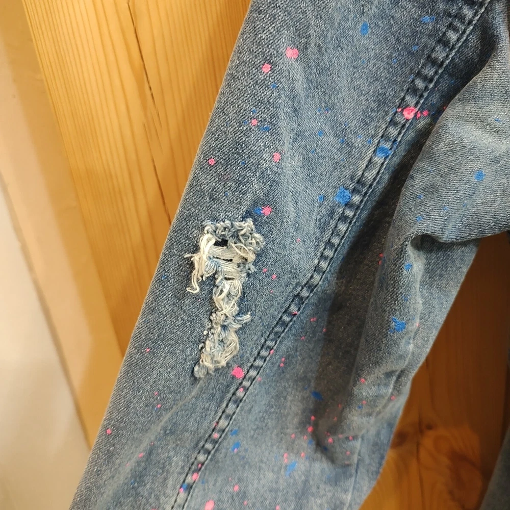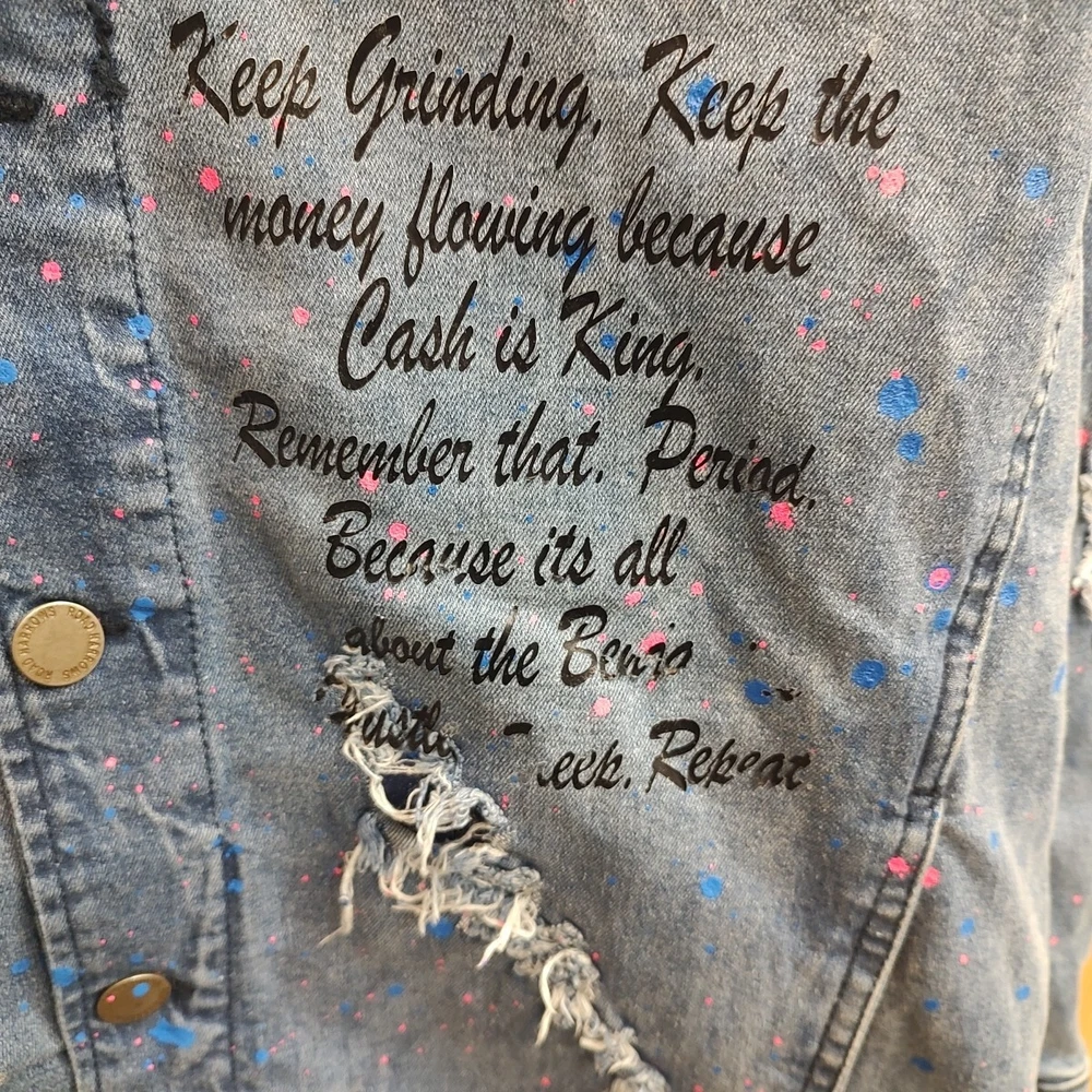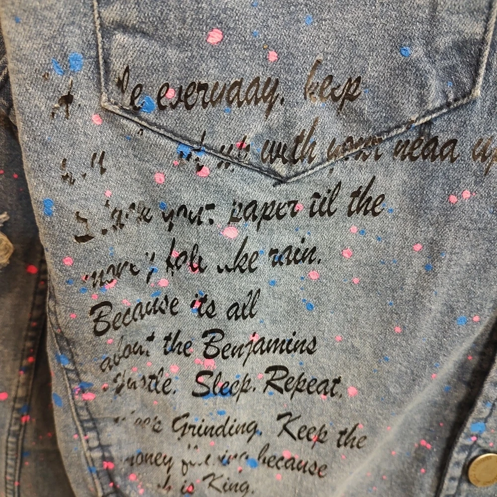 Elevate your style with this stunning denim jacket from Road Narrows Inc. based out of New York City.The jacket features a unique patchwork design with distressed fringe, patches and rhinestone accents, making it a perfect choice for any occasion - from casual to workwear and even parties. The button closure and oversized fit add to the relaxed vibe, while the stretch fabric ensures comfort all year round. This jacket comes in a beautiful acid washed blue color with a paint splatter pattern and is perfect for women who love designer, Christmas, colorful, boutique, college, 80s, city, and 90s themes. The jacket has inner pockets, making it easy to carry your essentials. It is machine washable and can be worn in any season. Get your hands on this stunning jacket today! Shoulder 22" Bust 23" Length 30" Sleeve 22" Jacket is cotton and spandex and is a rare find only sold in boutiques. It does have a lot of distressing and the words are partially gone due to wash and wear but add to the unique style.