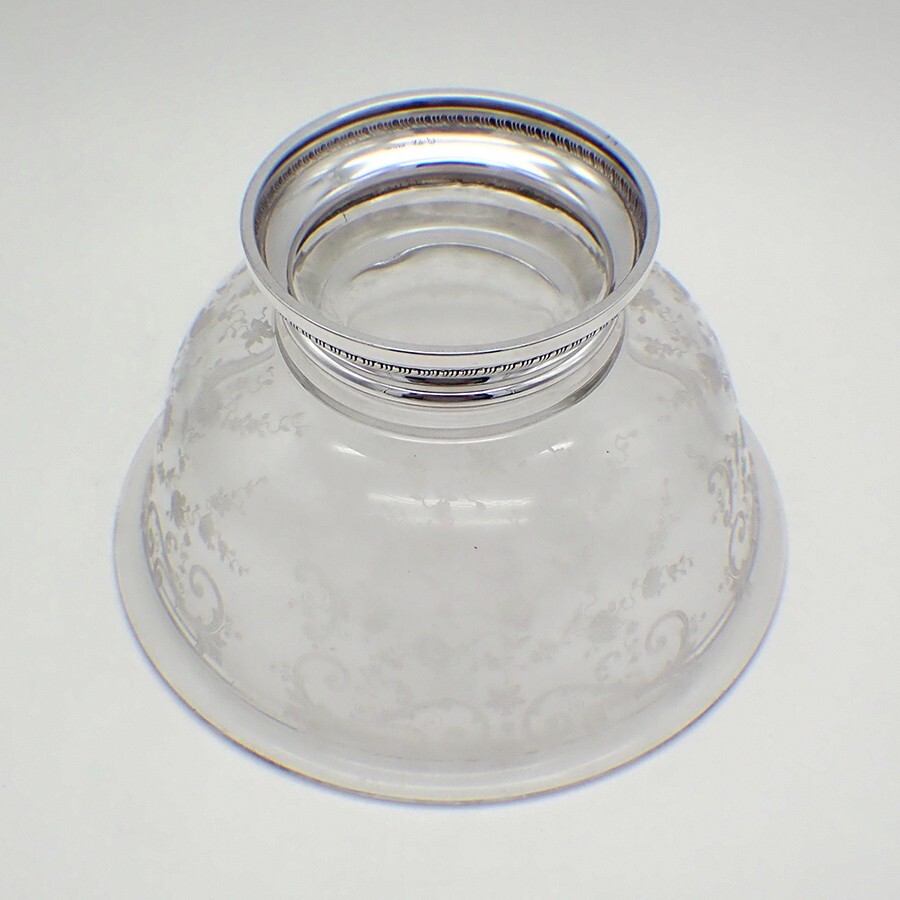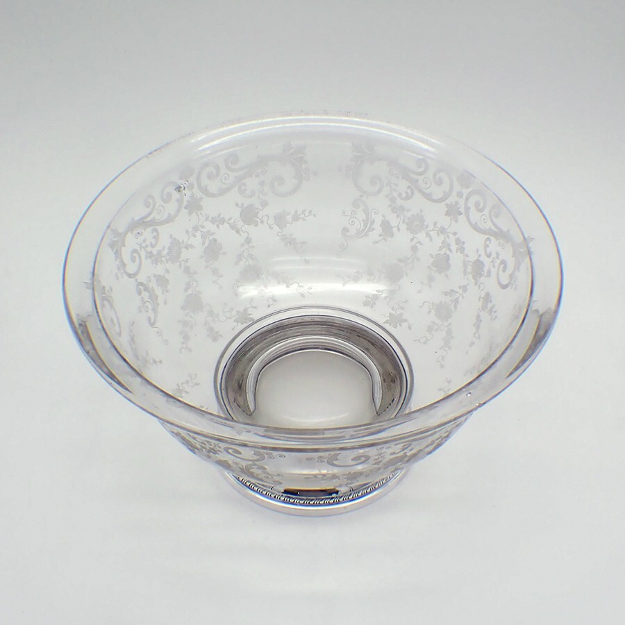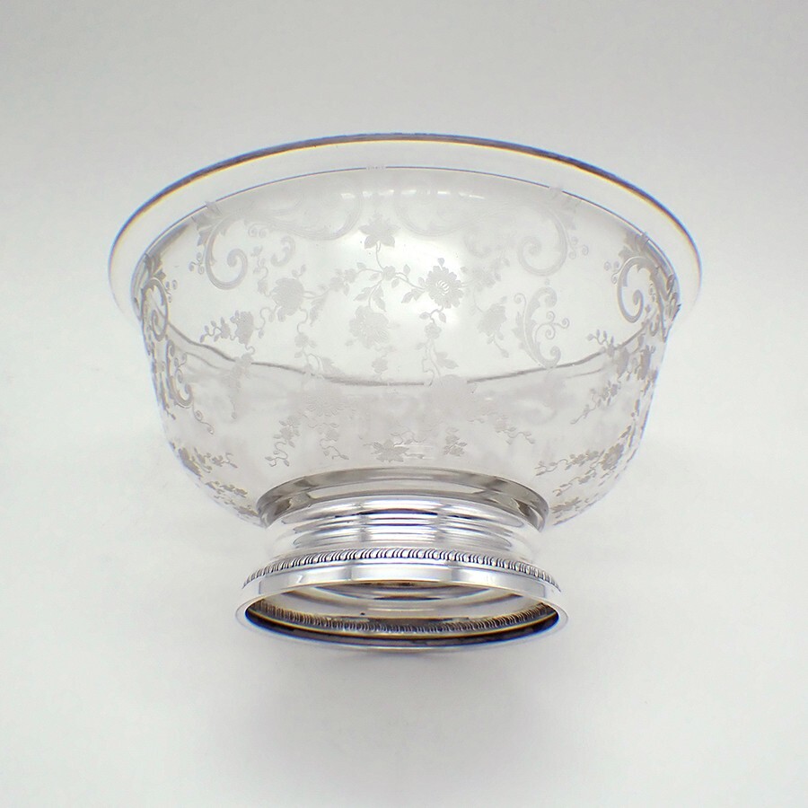 Acid Etched Glass Serving Bowl Gadroon Foot Sterling Silver Vintage American serving bowl, made of glass, featuring acid etched floral & scroll patterns, and sterling silver foot with gadroon rim. Made by Sheffield Silver Co. of Brooklyn, NY post-1920. This beautiful bowl is 9 1/2" in diameter and 5 3/8" tall. The excellent original condition and clear, crisp detail, with no monograms, removals, repairs or alterations, make this an especially attractive offering. [RA5057] Shipping/Handling/Insurance Policy All items are carefully packed and insured, with no handling or packing fees, ever. Please do not attempt to return an item due to shipping damage. Should it occur in spite of our careful packaging, this must be handled through the shipping agent with an insurance claim. We will be happy to assist in this. Always be sure to retain all original packaging if a claim is to be made as the shipping agent may request to examine it. That being said, in over 10 years of internet shipping, we have had only one damage claim. Shipping is usually done within 24 hours of the receipt of a cleared payment. Shipping may delayed for a few days if we are away from home at an Antique Show. Please feel free to contact us with any inquiries about our items or shipping. We will respond within 24 hours. Any shipping over payments will be quickly refunded. Other Information Sales tax applies for California. A valid resale certificate is required for tax exempt sales shipped to California. International buyers are responsible for all customs fees, duties and VAT.