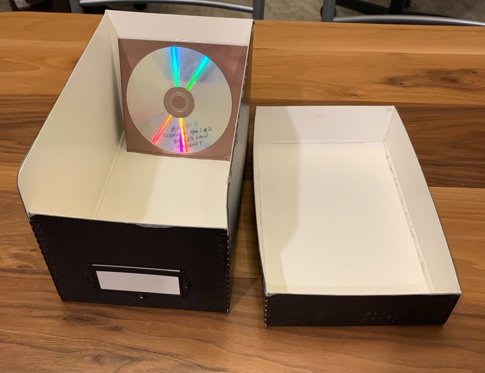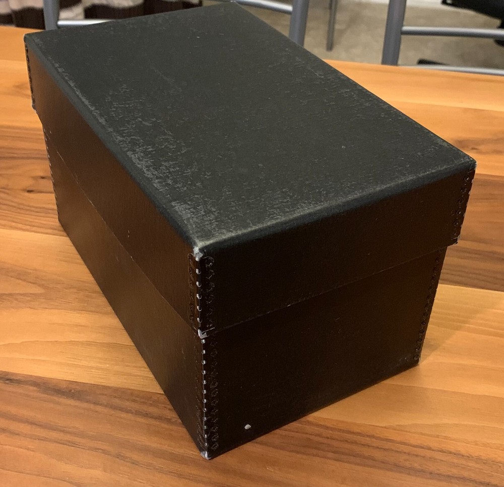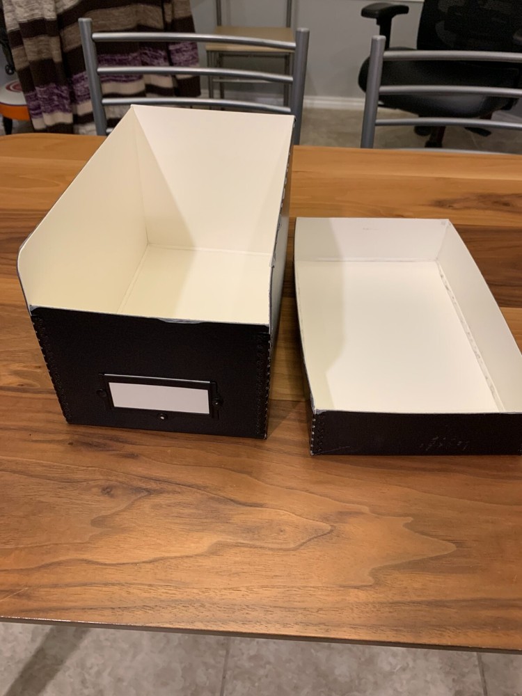 • Drop Front • Metal Edge • Acid-Free • Lignin-Free Designed with the help of archivists, this convenient CD storage box offers easy access with good visibility. It is 10" deep and holds over 150 CDs. In addition, 10 handy dividers are included. Boxes are black outside and white inside with sturdy metal edges and elegant metal label holder. 6"W x 10"L x 6"H. An acid-free box is beneficial because it prevents the deterioration of stored items. Preventing decay caused by exposure to acid, effectively extending the lifespan of valuable materials by minimizing chemical reactions with acidic components that may be present in regular cardboard boxes; essentially protecting your items from damage over time by providing a neutral pH environment for storage. $33 New UniversityProducts.com