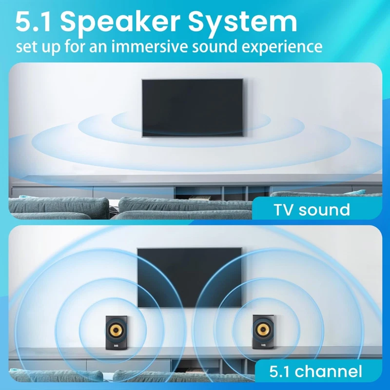 Acoustic Audio AA5170 5.1 Bluetooth Home Theater Speaker System Acoustic Audio AA5170 5.1 Bluetooth Home Theater Speaker System with Powered Subwoofer - 700W Brand: Acoustic Audio by Goldwood | Model: AA5170 | Power Output: 700 Watts Product Overview The Acoustic Audio AA5170 5.1 Bluetooth Home Theater Speaker System is designed to deliver exceptional audio quality for your home entertainment setup. With a powerful 700W output, this system features Bluetooth connectivity, a powered subwoofer, and a Pro Surround function for immersive sound. Enjoy seamless connectivity and high-quality sound for movies, music, gaming, and more. Key Features Bluetooth 5.1 Connectivity: Stream music directly from your phone or other Bluetooth-enabled devices. Pro Surround Function: Converts stereo sound into rich 5.1 surround sound for a cinematic audio experience. Multiple Input Options: Includes RCA, Digital/Optical, AUX inputs, USB drive, and SD card slots for versatile connectivity. High-Quality Audio: Powered subwoofer and 5 wired satellite speakers deliver deep bass and clear sound. Easy Plug and Play Setup: Simple to connect to any TV, gaming console, PC, or audio device with standard inputs. Full Function Remote: Convenient control over your system from anywhere in the room. FM Tuner: Listen to your favorite FM radio stations with the built-in FM tuner. System Specifications Feature Details Power Output 700 Watts Speaker Type 5 Satellite Speakers + 1 Powered Subwoofer Subwoofer Size 12.3" x 6.7" x 13.1" Satellite Speakers Size 6.7" x 4.1" x 4" each Frequency Response 20Hz - 20kHz Connectivity Bluetooth, RCA, AUX, Digital/Optical, USB, SD Card Compatibility TV, Laptop, PC, MP3, Gaming Consoles, Smartphones, Tablets Input Voltage 110V Dimensions (Subwoofer) 12.3" x 6.7" x 13.1" Dimensions (Satellite Speakers) 6.7" x 4.1" x 4" Weight 20 Pounds What’s Included 1 Powered Subwoofer Speaker 5 Passive Wired Satellite Speakers Full Function Remote Control Digital/Optical Cable RCA to RCA Cable RCA Antenna Cable 3.5mm to RCA Cable Instruction Manual System Requirements Standard 110V US Grounded Wall Plug Compatible with devices featuring 3.5mm headphone jack, Digital/Optical, RCA Stereo, or 6 Channel RCA Outputs. Compatible with TVs, home entertainment systems, laptops, PCs, DVD players, MP3 players, and gaming consoles. Why Choose the Acoustic Audio AA5170? Powerful 700W output for superior sound quality. Bluetooth capability for easy wireless streaming. Comprehensive compatibility with a wide range of devices. Pro Surround function for immersive 5.1 sound from any stereo source. Convenient remote control for easy operation. Built-in FM tuner for added functionality. Images Product Images: Conclusion Upgrade your home theater system with the Acoustic Audio AA5170 5.1 Bluetooth Speaker System. Featuring a powerful 700W output, easy connectivity, and immersive surround sound, this system is perfect for movies, music, gaming, and more. With a built-in FM tuner and Bluetooth streaming, it offers exceptional versatility. Enhance your entertainment experience today!