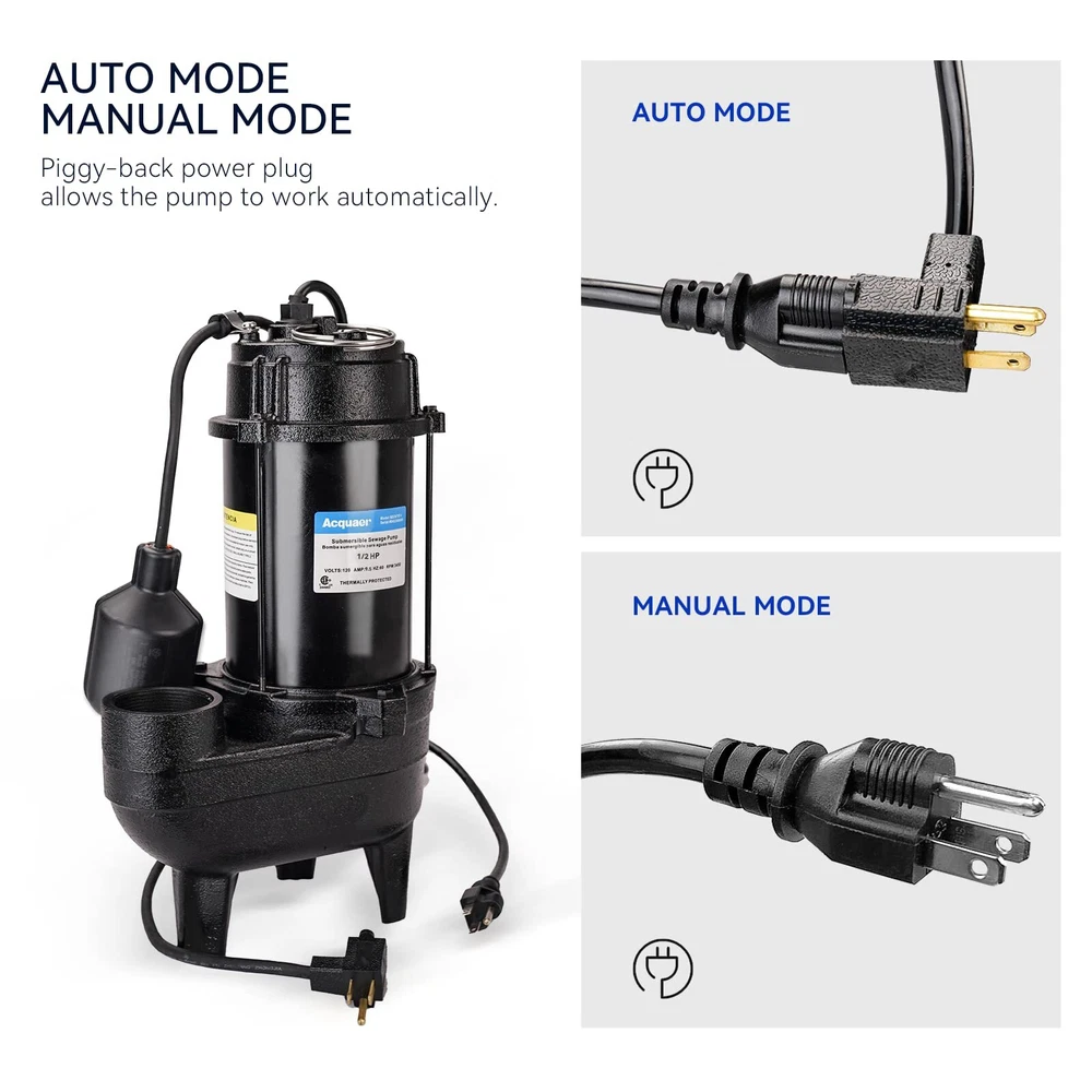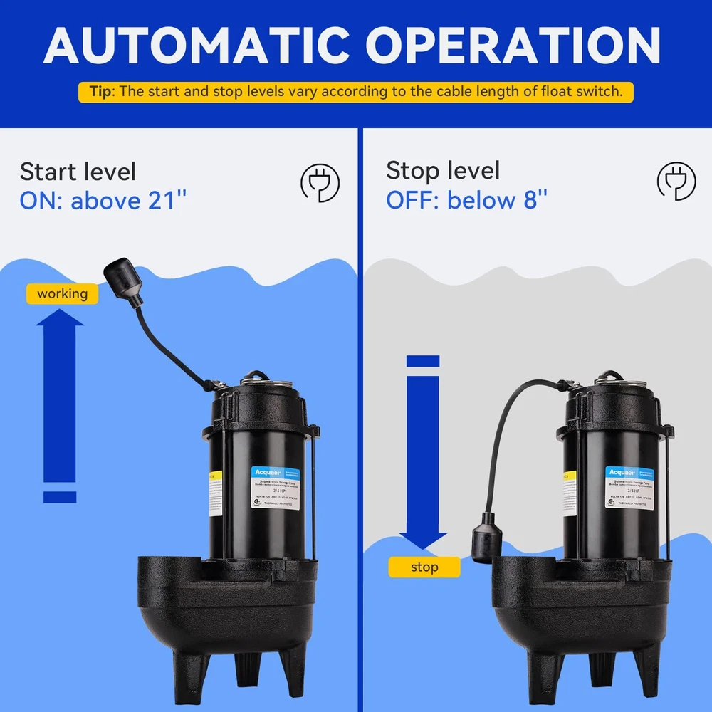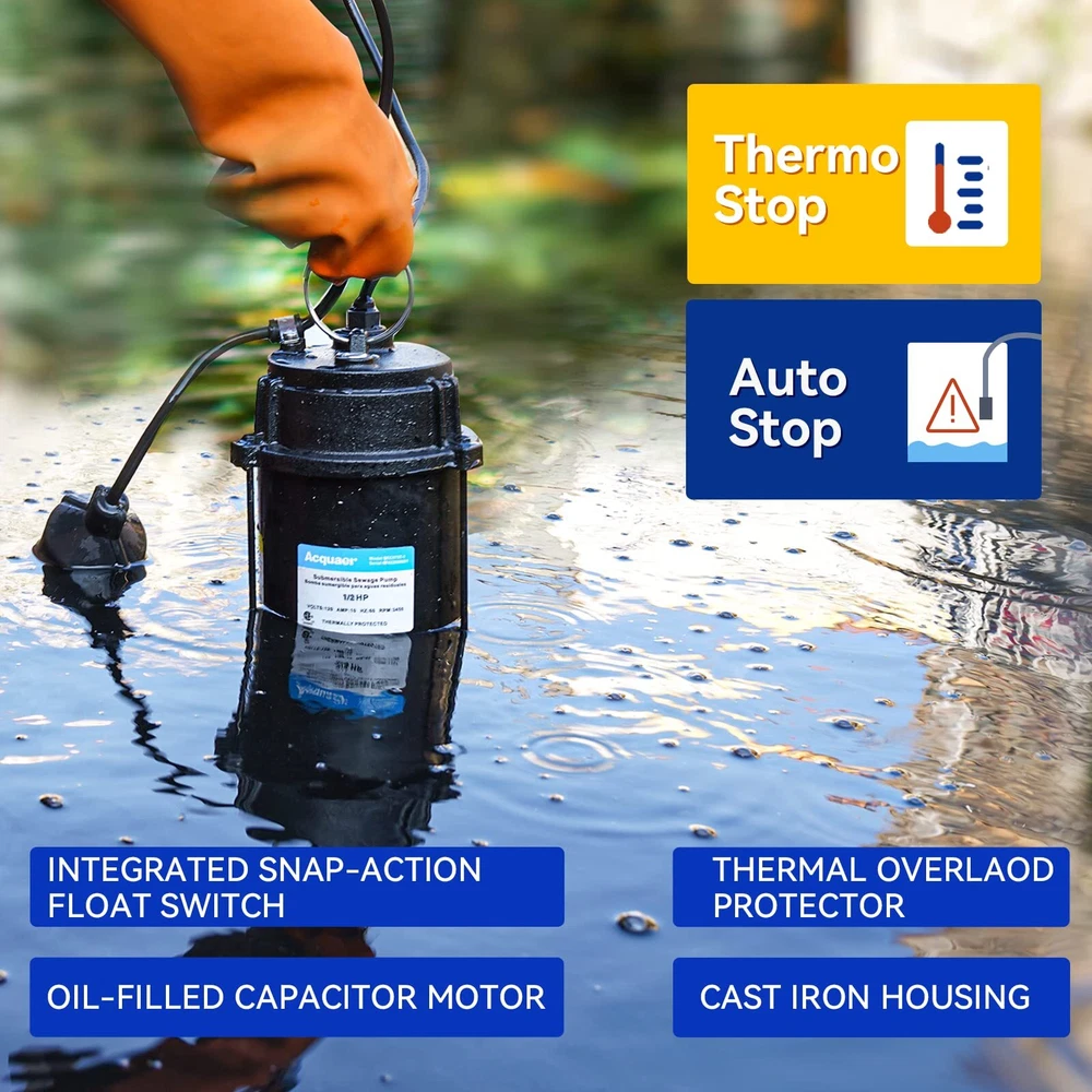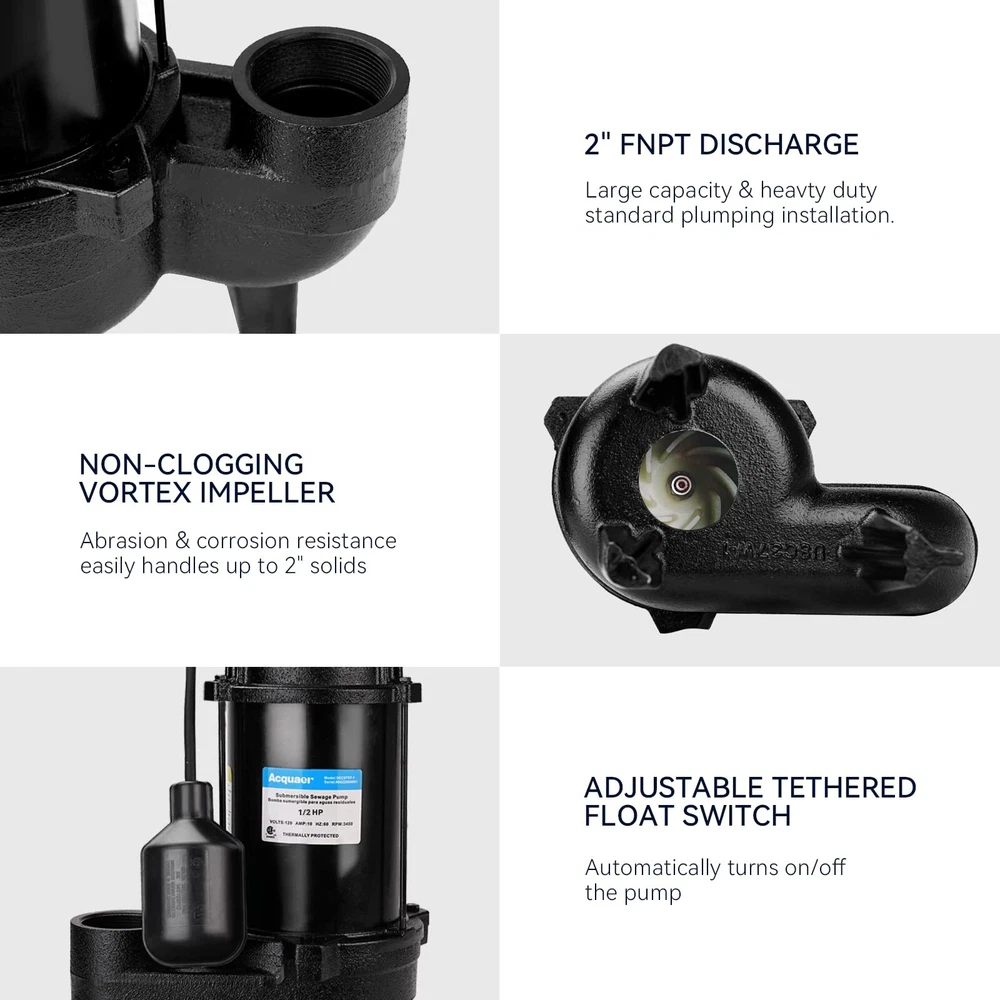 Acquaer 1/2HP Submersible Sewage/Effluent Pump, 6000 GPH, Cast Iron, Automatic Tethered Float Switch, 115V Sump Pump for Sump Basin, Residential Sewage, Basement, 2'' NPT Discharge Great Performance: 1/2 HP submersible sewage ejector pump features efficient an oil-filled split capacitor motor with high flow. It can pump up to 6000 GPH or lift water up to 27ft vertically, perfect for residential sewage systems. It can work in harsh environments and offer long service life. Prohibited to use in septic tanks Auto/Manual Operation: Adjustable mechanical float switch automatically turns on/off the pump depending on water level in sump basin or septic pit. Standard 10' power cord with piggy-back plug allow automatic operation of this electric sewage pump. DO NOT lift the pump by the power cord or it will be damaged permanently Durable and Clog-resistant Design: This heavy-duty dirty water pump is equipped with rugged cast iron casing, reinforced engineered non-clogging vortex impeller and 2'' NPT discharge, capable of passing 2" diameter solids. As a waterproof effluent pump, it's ideal for basements or below grade installations Overheat Protection: Built-in automatic thermal overload protection will prevent the motor from overheating and burning. When the pump is dry running, it will shut off automatically to protect the motor. Fully immerse the pump before startup and prevent it from freezing in cold winter Wide Applications: Designed for residential and commercial sewage & dewatering, such as sewage system, waste water drainage, sewer and basement flooding. 100% factory tested. It comes with a 2-year warranty to keep your water system stable and worry-free. Acquaer customer service provides the professional advice on installation and maintenance Shipping We offer FREE shipping on all orders! We use a selection of shipping services such as UPS, FedEx, USPS etc. We only ship to the lower 48 states, no APO/FPO addresses or PO Boxes allowed. Local pickups and combined shipping options are not provided at this time. Return You can return a product for up to 30 days from the date you purchased it. Any product you return must be in the same condition you received it and in the original packaging. Please keep the receipt. Payment We accept payment by any of the following methods: PayPal Please pay as soon as possible after winning an auction, as that will allow us to post your item to you sooner! Feedback Customer satisfaction is very important to us. If you have any problem with your order, please contact us and we will do our best to make you satisfied. Contact Us If you have any queries, please contact us via ebay. We usually respond within 24 hours on weekdays. Please visit our eBay store to check out other items for sale! Thank you for shopping at our store.