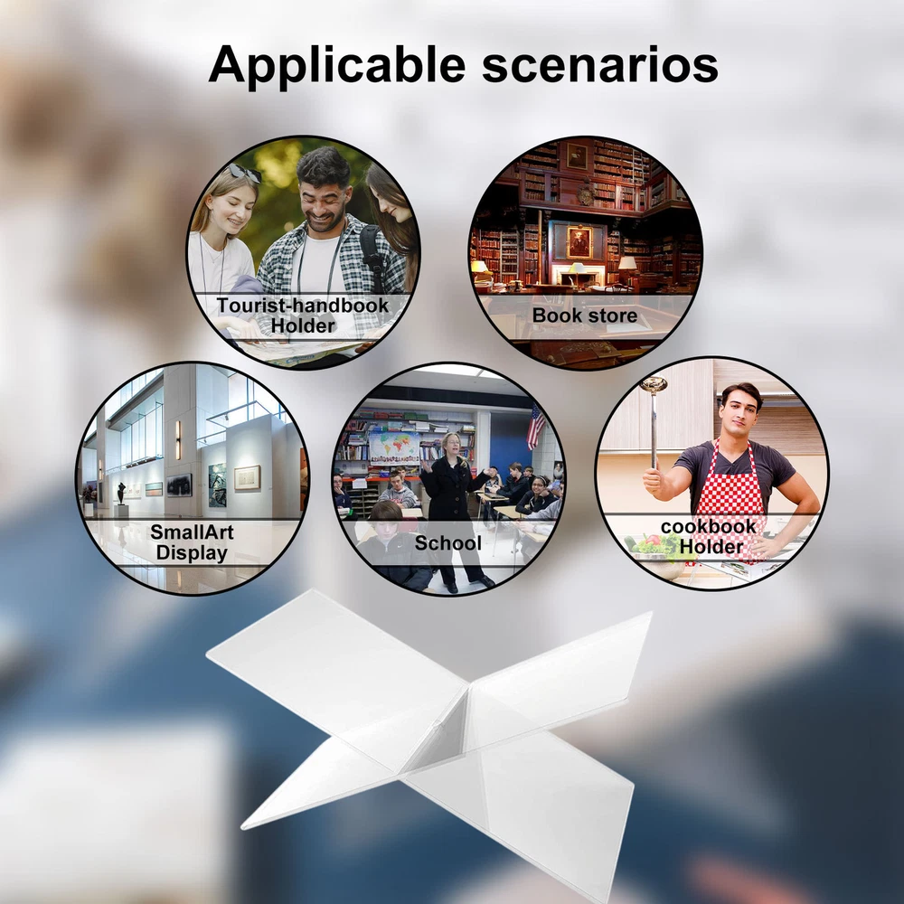Bullet Points: 【Suitable for Reading】Solid, elegant, and widely most books, the Acrylic Book Stand is designed to keep your books stable and not easy to fall off, perfect for organizing and displaying. 【Excellent in Quality】Fashionable, elegant, and perfect for home decoration, the Clear Book Holder is made from high-quality and transparent acrylic material, designed with a thickness size of about 4mm. 【Easy Assembling】The Book Shelf for Reading is easy to carry for outdoor activities, adopting an easy-assembly design, which can be installed and aligned with the right position easily. 【Easily Clean】Made from smooth and durable acrylic material, the Reading Book Easel is easy to maintain and clean, convenient to get cleaned with dry cloth or wet sponge, wipes. 【Versatile Design】Perfect for customer lounges, receptions, offices, shops, at home in the kitchen, study, bedroom, living room, etc., the Book Display Stand is designed with multiple functions, suitable for books, Bibles, cookbooks, sheet music, and magazines. Description: The Acrylic Book Holder Stand is made from high-quality material, which is solid, stable, and durable, perfect for organizing all kinds of books. Specification: Name: X-Shaped Book Stand Material: acrylic Color: transparent Large: about 28*15.5*15.5cm/11*6.1*6.1inch Small: about 19*11*11cm/7.48*4.33*4.33inch Packing List: Acrylic Book Stand*1