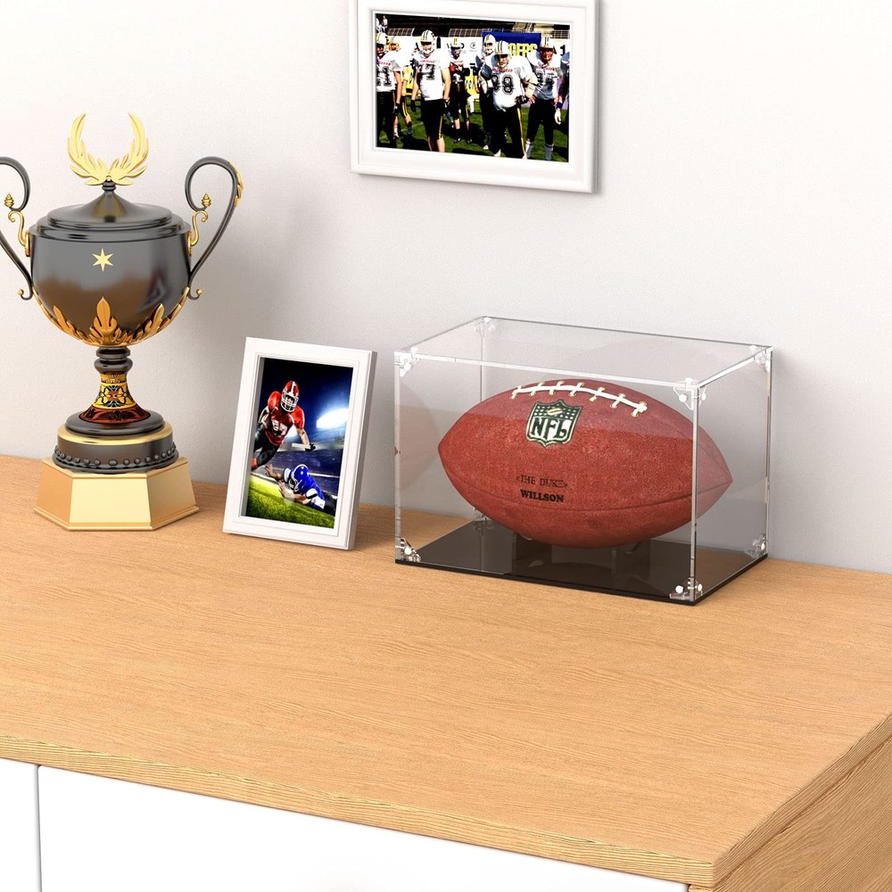 Not:Assembly is required.Instruction is come with the package. It is a good quality acrylic football display cover with a black plastic base. There was a small inserted pedestal in the bottom of the case to “cup” the bottom of the football, to prevent it from rolling around in the case and to keep the football in the correct position for display. Very optically clear with no distortion and the glass is UV protective in case your footballs are displayed near a window. Displays a football and keeps of clean from dust. Keeps the football protected from UVs It is light and easy to use to display a football. This was a perfect fit for my autographed full size football. It will do the trick of keeping the dust and finger prints off the balls when sharing with friends and other fans. It was easly to pull apart and put back together. Nice tight fit. Assembly Required-- You have better watch the video before assembly.It will make you assembly go quickly and easily. Clear To Display -- Made of acrylic,create a clear display visual to viewer.The the signatures on the football could stand out due to the bottom of the case being black.Great display case to show off your collection. Well Protection For Football-- The cube case is sturdy and the football fit built-in cradle perfectly.It keep football safe and sound inside.Also it well protect dust and fingerprint from kids. Fit All Size -- The interior size is 12×7.2×8 inch(L×W×H).football box is big plus to fit for all size of football,including Seniors footballs,basic football,standard football,college football. Nice Gift -- The football case can be nice birthday or festival present to your kids to protect and display their autographed football.