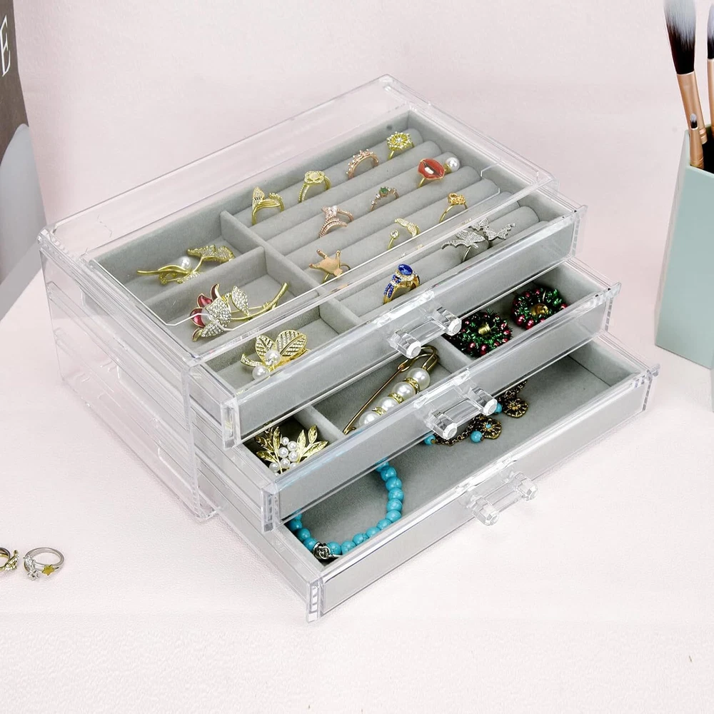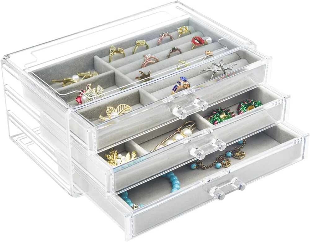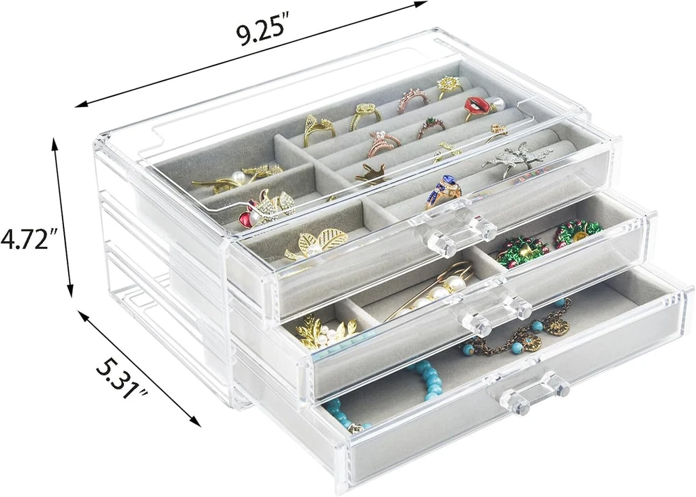 Acrylic Jewelry Box 3 Drawers, Velvet Jewellery Organizer, Earring Rings Gray Product Details Color: Gray Brand: Weiai Material: Plastic Style: Modern Special Feature: Jewelry Box with 3 Drawers Recommended Uses For Product: Earrings Rings Necklaces Bracelets Product Dimensions: 5.31"D x 9.25"W x 4.72"H Target Audience: Women Shape: Rectangular Occasion: Mother's Day, New Year, Birthday, Thanksgiving, Valentine's Day Mounting Type: surface mounted Finish Type: Polished Inner Material: Velvet Closure Type: Drawer Number of Drawers: 3 Item Weight: 2.4 Pounds Number of Compartments: 16 Number of Items: 1 Manufacturer: Chunze Part Number: 5841506875 Item Weight: 2.35 pounds Item model number: 5841506875 Is Discontinued By Manufacturer: No Finish: Polished Item Package Quantity: 1 Number Of Pieces: 1 Special Features: Jewelry Box with 3 Drawers Batteries Included?: No Batteries Required?: No Color: Gray Brand: Weiai Material: Plastic Style: Modern Special Feature: Jewelry Box with 3 Drawers Recommended Uses For Product: Earrings Rings Necklaces Bracelets Product Dimensions: 5.31"D x 9.25"W x 4.72"H Target Audience: Women Shape: Rectangular Occasion: Mother's Day, New Year, Birthday, Thanksgiving, Valentine's Day CLEAR DESIGN: Jewelry organizer is made with a crystal-clear material, the product's dimension: 9.25″ x 5.31″ x 4.72″ 3 DIFFERENT DRAWERS: The first layer is 7 slots and 3 compartments, the second has 6 compartments of different sizes, the third layer doesn't have any dividers. You can rearrange the drawers according to your needs. VELVET LINING: When you place your items inside of jewelry box, you’ll find that there's velvet lining inserts that work to keep the interior of the organizer free from scratches and damage DRAWER HANDLES: The molded handles are a breeze to grasp and pull that allow you to access your rings, earrings, necklaces, cufflinks, and brooches effortlessly ORDERLY STORAGE: Keeps clutter away on the vanity, counter top, dresser, work desk by keeping everything in one place. Keep your jewelry clean all the time