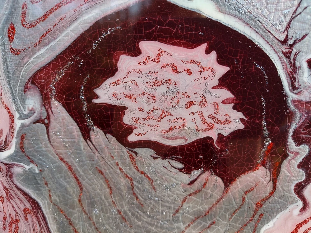 The piece is painted with high quality acrylic paint, and pouring mediums on canvas 16" x 20". You can hang it at any direction. I signed it on the back only. The sides are painted, no need to frame. The colors are pink, silver, whire, cherry. Embellished with silver and dark red glitter. It looks like roses bouquet. This painting is unique original artwork that I will not be able to re-create. One and only! All artwork is handmade by me and may have minor inclusions, texture,etc. that add to its individuality This is covered with epoxy resin for maximum shine and durability THIS IS NOT A PRINT. All materials non-toxic therefore produce no VOCs or fumes. Great way to add color and life to any space