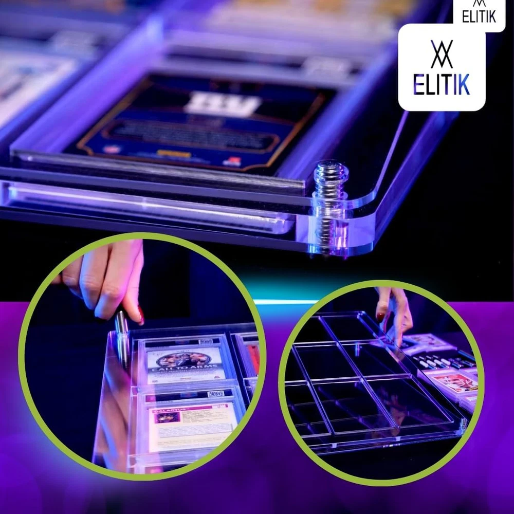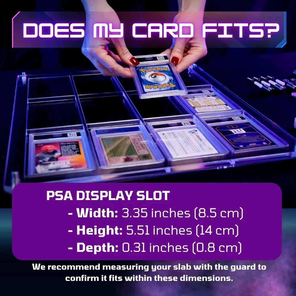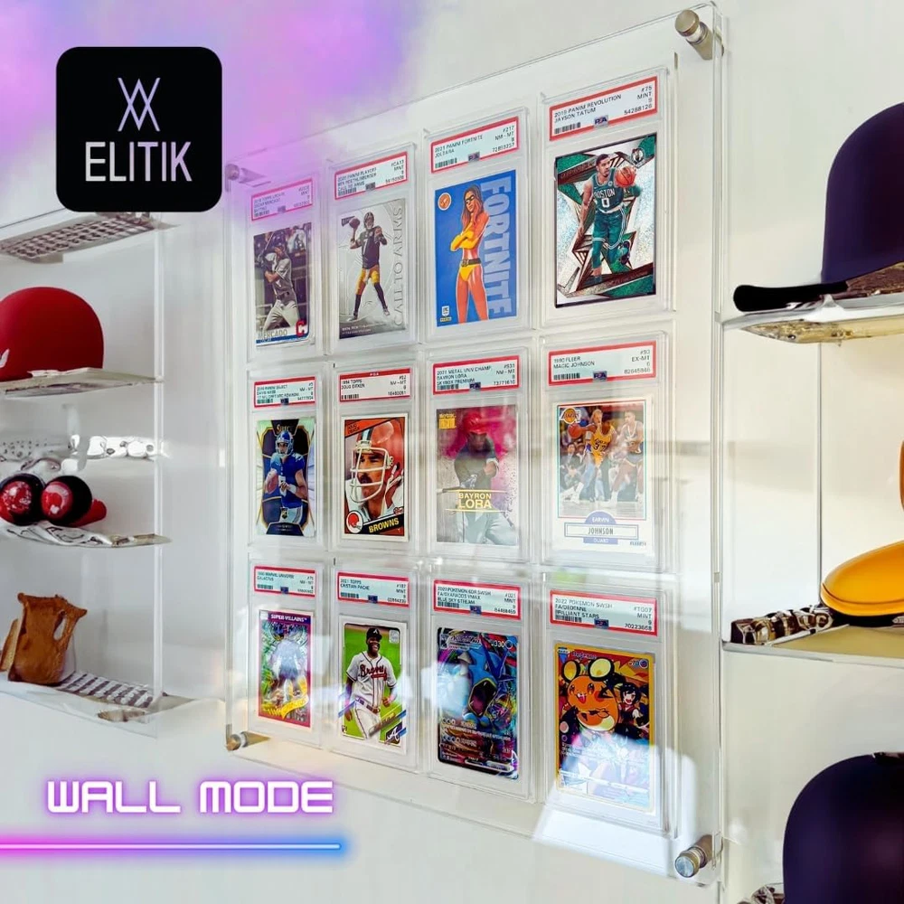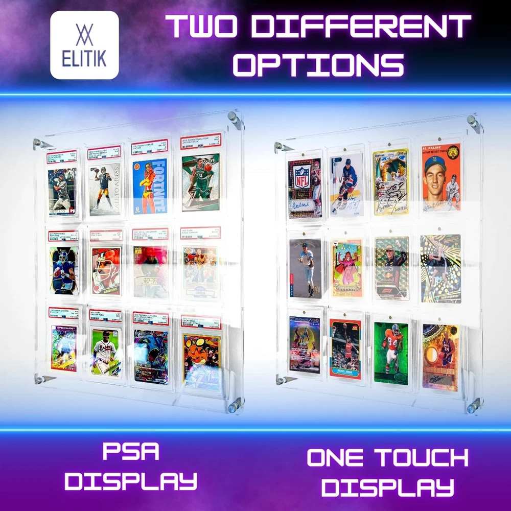 ??? Best card frame to show off your collector cards ???- Sport cards collection display case is made of high quality 98% UV protection acrylic glass. This baseball card display case can well protect your cherished memorabilia or collectibles. The frame outer size is 15,7in X 18,7in X 1,57in, Compartment size for the slabs is 3,34in X 5,5in X 0,31in. NOTE: Cards and slabs are not included. ??? All-in-one wall display case mount and desktop display??? - You can use our graded card display case as a desktop showcase or hang it on the wall. Enjoy dual functionality with our graded card case ??? proudly display on your desk or easily mount it on your wall for maximum versatility. ??? Acrylic Desing??? - Our versatile acrylic card display frame serves as an elegant desk collection showcase or a sophisticated sports card display case for treasured baseball cards packs memorabilia. Unlike others made of wood, which can impart a dark and old-fashioned appearance to your cards, our transparent acrylic trading card display frame design allows your collection to shine in all its glory. ??? Versatile trading card frame options??? - Our card stands for sports cards effortlessly accommodates both horizontal and vertical trading card frames, securely fastening to tabletops. It also transforms into a stylish baseball card storage, serving as a protective slab case for graded cards. Experience the ultimate in multifaceted acrylic card display. ??? Card Protection??? - Elitik's trading card display is crafted from Grade-A acrylic, boasting 92% transparency and 98% UV protection. This card stand safeguard your pokemon slabs from yellowing over time, ensuring an ULTRA-CLEAR view of your cards. This is a perfect card collector gifts. ???Slot Size Comparison: ONE TOUCH vs. PSA Display???To ensure proper fit, we recommend measuring your card or case before purchasing. - The slot for the ONE TOUCH display measures 11.7 cm x 8.2 cm x 0.8 cm (4.61 in x 3.23 in x 0.31 in), designed specifically for magnetic ONE TOUCH cases. - The slot for the PSA display measures 14 cm x 8.5 cm x 0.8 cm (5.51 in x 3.35 in x 0.31 in), tailored to fit PSA-graded slabs.