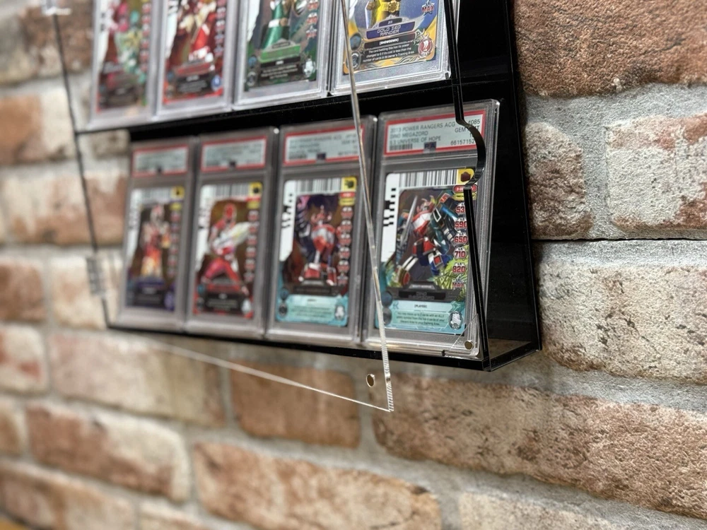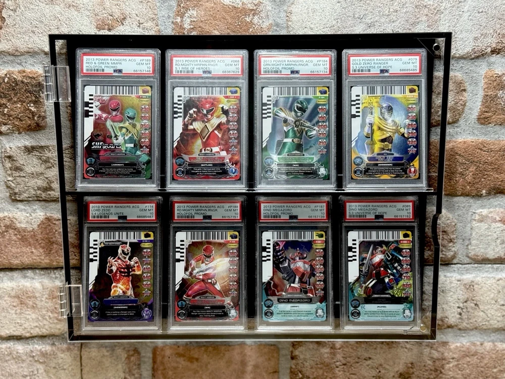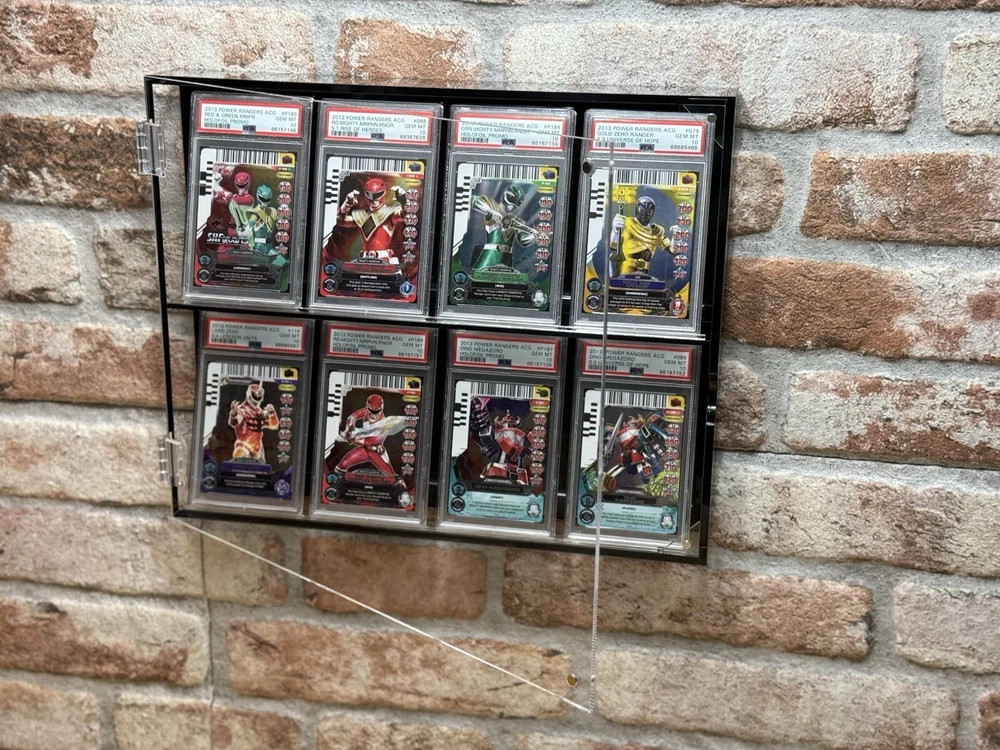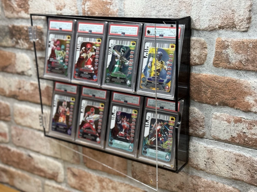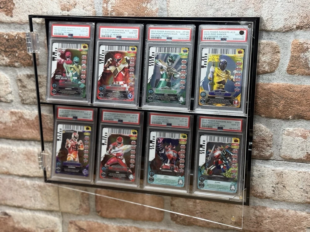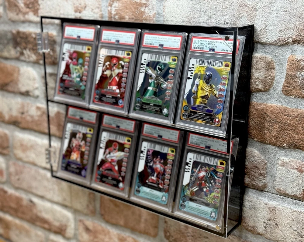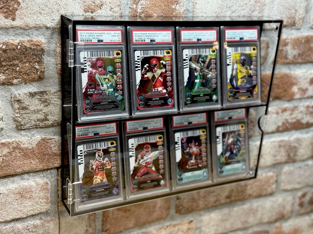 Display your collection in this sleek clear acrylic case that holds 8 graded cards from either PSA, CGC, Beckett or SGC. The case swings open and closes stays sealed with the help of magnets. All sides are viewable as case is clear on all sides and has a nice black background. NOTE: Cards in pictures are for display purposes only and not included with purchase.