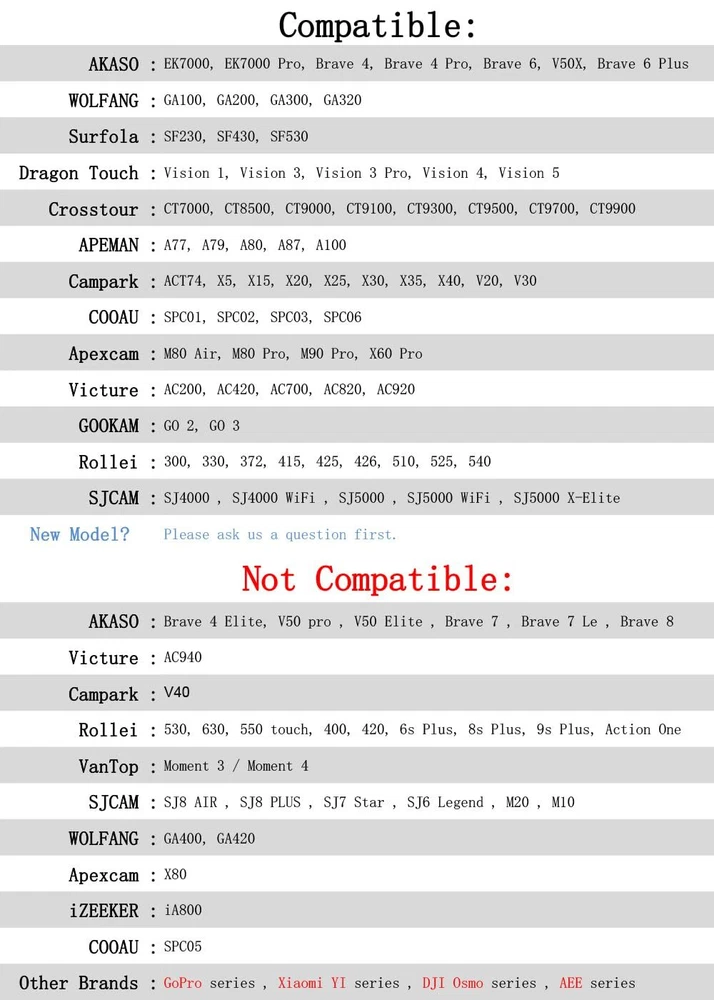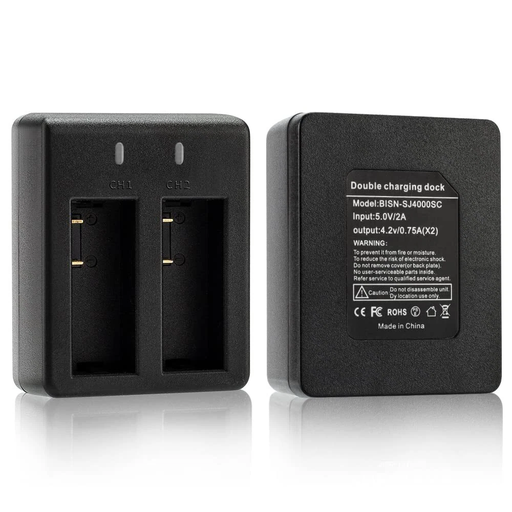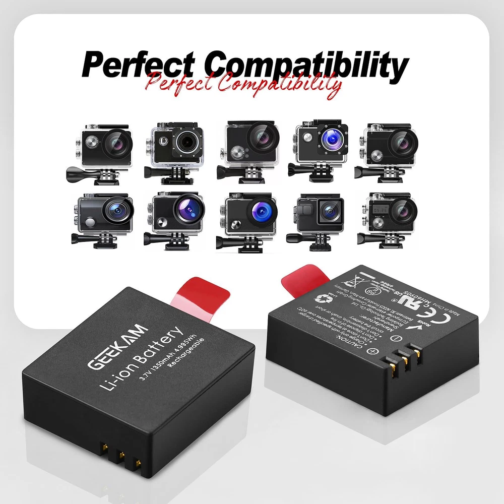 【Higher capacity】This action camera 1350mAh battery pack is a must-have accessories for your sports camera. Its capacity is 30% higher than that of a 900mAh battery, which means your action camera's recording time is extended by 30%. We have prepared 3 x 1350mAh batteries for you, so you never miss any fantastic moments. 【Fast Charging】This action camera battery charger design is convenient to charge 2 batteries at the same time, saves charging time efficiently.The battery charger RED light shows that the battery is charging, BLUE light shows that the battery is full charged or no battery in charging. 【Easy to Use】We made a number mark on the top of the battery so that you can easily distinguish which battery is charged. This saves you the time to replace the battery of the action camera, so that you can take wonderful moments faster. 【Wide Compatibility】Compatible with AKASO EK7000/Dragon Touch/Campark/Crosstour/APEMAN/EKEN/DBPOWER/BOIFUN/Davola/JEEMARK/TENKER/COOAU/GeeKam/Apexcam/BOIFUN/Lightdow/SJ4000/PG1050/PG900/S009R,please check the Product Description for the detailed model. 【NOT Compatible Models】Not Compatible AKASO V50 pro / V50 Elite / Brave 7 Le / Brave 7 / Brave 8 ; Not Compatible Victure AC940 / AC960; Not Compatible Campark V40; Not Compatible SJCAM SJ8 AIR / SJ8 PLUS / SJ7 Star / SJ6 Legend / M20 / M10; Not Compatible GoPro series / YI series / DJI series. (Warm Tip: Please run out of all the battery power before charging for the first time)
