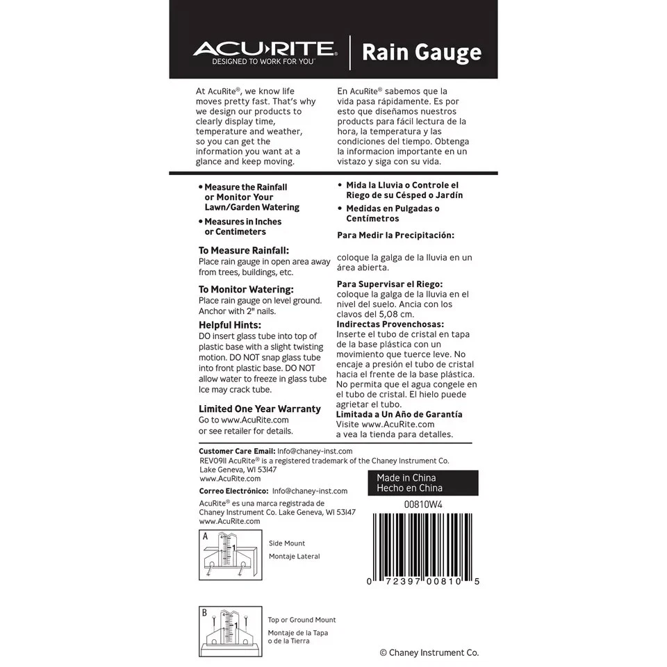 This AcuRite 5-inch rain gauge is a must-have for any homeowner or gardener. It features a clear glass design that allows for easy reading of rainfall measurements. The gauge is manufactured by a trusted brand, AcuRite, and is made of high-quality materials, including glass. This rain gauge is perfect for keeping track of rainfall in your area and is ideal for use in gardening and outdoor activities. Its compact design makes it easy to install and use, while its durable construction ensures that it will last for years to come. Add this AcuRite rain gauge to your collection today and start enjoying the convenience of accurate rainfall measurements!