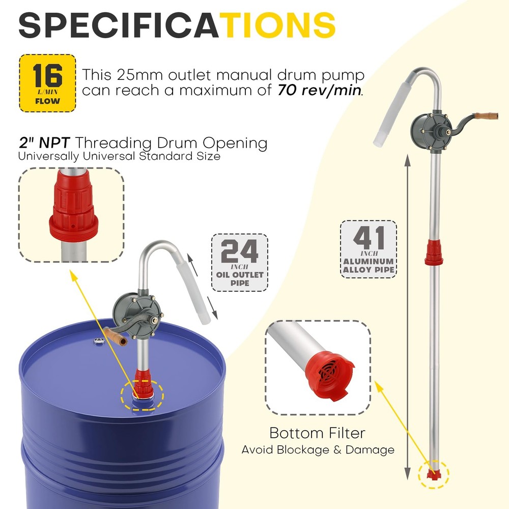 Acymner Aluminum Rotary Hand Barrel Pump | 5 to 55 Gallon Drum Red, Blue Description Features: Durable Aluminum Construction: Crafted from high-quality aluminum alloy, our 55 gallon drum pump is built to last. It's corrosion-resistant, lightweight, and designed for long-term use. Carry it with ease thanks to its sturdy construction. Versatile Drum Compatibility: Our hand pump fits a wide range of gallon drums, including 5, 15, 30, and 55 gallons. The barrel pump comes with adjustable aluminum pipes, making it suitable for various drum depths. The red-threaded connection ensures a secure fit. Effortless Manual Operation: Experience smooth and hassle-free pumping with our ergonomic hand-crank design. No electricity needed – pump with ease at your convenience, whether at home, in your business, or on the farm. This 25mm outlet manual drum pump can reach a maximum of 70 rev/min. Flow(L/min):16 Effective Seal: Our barrel pump 55 gallon features a three-piece segmented suction tube, allowing you to effortlessly adjust the tube's length to match your specific needs. This design not only makes storage and transport convenient but also ensures a robust connection with its threaded suction tube, effectively preventing any oil leakage. Wide Applications: The drum pump finds extensive applications in handling diesel and kerosene but should be avoided for use with corrosive liquids, chemical substances, gasoline, water, and similar materials. Product Details: Handling We will ship all orders within 3 business day of payment. Delivery We Do Not Ship Outside of the Continental US. Return Policy All items qualify for returns within 30 days of receipt. Buyer is responsible for return shipping on any item that is not damaged. Feedback We take our reputation seriously, we buy and sell online, so we understand the value of trust. If you are unsatisfied with your order, please contact us and we will work with you to resolve it to your satisfaction.