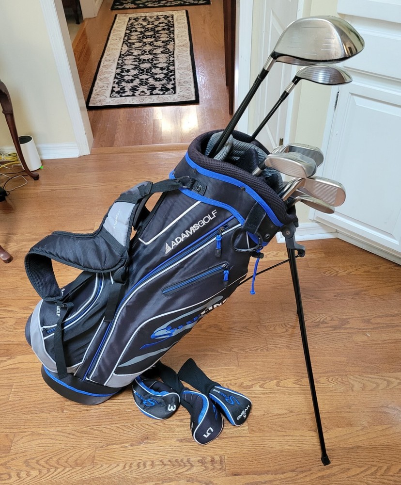 Overall good condition. This set includes Adams Speedline Driver, 3 wood, 5 wood, 5 hybrid, 6,7,8,9,SW, Callaway putter, matching stand golf bag. No pitching wedge. The driver has 2 dents on the top of the club but does not affect the performance. Right handed. Graphite Shafts for driver, woods and hybrid. Steel shafts for irons and putter. Good grips on all clubs. Please review each picture thoroughly. You will receive the exact golf set pictured. Shipped fast with tracking using UPS ground or FedEx. Only shipped to mainland US (48 states). No p.o. boxes. Thanks for shopping!