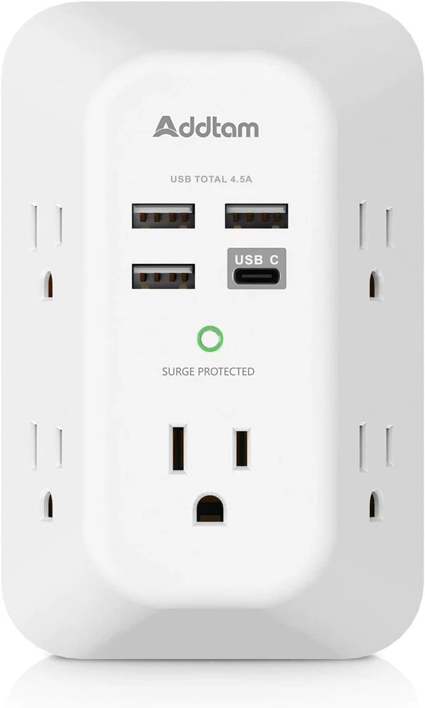 USB Wall Charger Surge Protector 5 Outlet Extender with 4 USB Charging Ports (1 USB C Outlet) 3 Sided 1800J Power Strip Multi Plug Outlets Wall Adapter Spaced for Home Travel Office ETL Listed Description Item model number AD5004 Style 1C3A Color white Product Dimensions 5.51 x 1.57 x 0.5 inches Country of Origin China Compatible Devices ac Connector Type USB Type C Item Weight 9.6 ounces Item Dimensions LxWxH 5.51 x 1.57 x 0.5 inches Brand Addtam Manufacturer Addtam Number of Outlets 5 Features USB Charger Plug Type United States USB Wall Charger Surge Protector 5 Outlet Extender with 4 USB Charging Ports (1 USB C Outlet) 3 Sided 1800J Power Strip Multi Plug Outlets Wall Adapter Spaced for Home Travel Office ETL Listed 【9 IN 1 Function USB Wall Outlet】- Fit duplex outlet perfectly, just plug in to use. Please NOTE: For some outlets, the white plastic prong can be cut off before using. You get 5 AC outlet splitter (3 sides) with wide space in between; 4 USB charger ports; 1800 joules surge protector protect electronics by improving your power quality 【USB- C Fast & Smart Charge】- 4 USB ports total 4.5 A, each USB A port features 2.4A Max output. USB C charging port features 3A MAX. Built- with smart technology, detecting charging devices and deliver optimal charging speed automatically, compatible with most USB devices. NOTE: The UCB-C port doesn't support any other devices which need 14~22V charging voltage 【1800J Surge Protector Outlet】- 3 complementary Surge Protection Circuits, TVS(transient voltage suppressor) MOV(metal oxide varistor) GDT(gas discharge tube), with response speed less than 1Ns, and minimum energy-absorbing capacity of 1800 Joules, much more quickly and reliably than the traditional MOV surge protector circuit. ("SURGE PROTECTED" indicator light on to show your devices are protected) 【Super Safety】- ETL Certificates. This power strip has overload protection, short-circuit protection, over current protection, over-voltage protection and overheating protection. It will automatically cut power to protect connected devices when voltage surge is overwhelming. Combined with fire-resistant casing- keeping you and your devices completely safe 【Wide Space】- With 3-sided Power Strip design, 5 AC outlets with long space in between, larger than a standard socket- Making it easier to use for all kinds of equipment and without blocking each other Product Description Smart 4-USB Charging Ports Smart 3 USB-A and 1 USB-C Charging Ports: 5V 4.5A shared rating; High-speed USB ports automatically detect charging devices and deliver optimal charging speed, up to 3.1A per port. it can charge 4 portable devices simultaneously. 5 AC Outlets The extended 5 outlets fit 5 standard plugs simultaneously. 3 sides with wide space in between. (125V/15A) Fast Smart USB Charging Ports High-speed USB ports automatically detect charging devices and deliver optimal charging speed, USB-C up to 3.1A per port, it can charge 4 portable devices simultaneously. 1800 Joules Surge Protection This power splitter comes with a surge protector which can absorb excess voltage to provide superior protection for desktop computers, mobile phones, and other electronics appliances from voltage fluctuations, surges, and spikes. Wall Mountable Designed Simple and secure installation. The integrate stabilizing post, makes wall mount outlets more secure and convenient. Please NOTE : For some outlet, the white plastic prong can be cut off before using Surge Protector LED Indicates Keeps Devices Safe from Surges and Spikes. When bad weather knocks out your home’s power or an unexpected surge or spike occurs, Addtam protector is your first line of defense. This safety-regulated, flat wall tap built-in LED light that indicates when your devices are protected and wiring properly grounded. Wide Space Wide space: 5 AC outlets built-in 1800 Joules surge protector with long space in between, larger than standard socket. Larger spacing makes it easier to use for all kinds of equipment. Perfect for Any Place This Mini Wall Outlet with 5 outlet & 4 USB ports can meet most applications, such as nightstand/home/office/travel. Number of Outlets 5 5 6 12 USB Charging Ports 3 USB A + 1 USB C 3 USB A + 1 USB C 2 USB A 2 USB A + 1 USB C Surge Protection(Joules) Yes (1800 J) Yes (1800 J) Yes (490J) Yes (490 J) Size / inches 3.5*5.4*1.7 in 3.5*5.4*1.7 in 3.5*5.3*0.9 in 3.5*6.0*1.5 in Special Feature 3 Side/ Wide Space 3 Side/ Wide Space Sensor Night Light 3 Side/Phone Holder