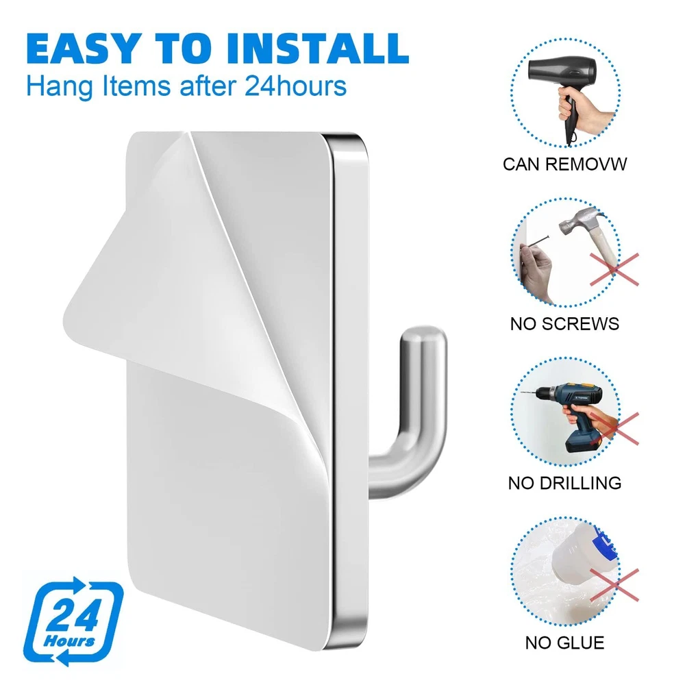 ACMYCH Adhesive Hooks, Waterproof Stainless Steel Hooks,Towel Hooks-4 Packs Easy to Install:Totally a hassle-free installation. Installation without tools and screw. It is do not need to drill holes on the wall, just stick on the wall(suit for different space). Functional and Modern looking:Stylish silver adhesive hooks, beautiful and fashionable, compatible with any other modern designed home decor. Help you save more space and keep your room tidy. Rustproof and Waterproof: Made of Upgraded SUS-304 Brushed Stainless Steel, High Load-Bearing Capacity, Better Protect Against Corrosion & Rust. Ensuring Quality and Longevity Widely Application For Home:Self adhesive hooks could easily stick to glass, wood, metal, ceramics, tile and so on. Suitable for holding towels, hats, clothes, bathrobes, keys, umbrellas. Best Services:If you're not completely satisfied, we will give you a 100% refund. It is our intention to offer the BEST customer service on Amazon. SHIPPING Domestic Buyers - We have confidence in our products, but if you are not fully satisfied please contact us within 30 days of purchase and you will get full refund. - We ship within 3 business days of payment, usually sooner - We offer FREE shipping on all orders! - We only ship to the lower 48 states, no APO/FPO addresses or PO Boxes allowed International buyers – please note: Import duties, taxes, and charges aren't included in the item price or postage cost. These charges are the buyer's responsibility. - Please check with your country's customs office to determine what these additional costs will be prior to bidding or buying. * Order Cancellation Policy ** You can return a product for up to 30 days from the date you purchased it. 1. The seller reserves the right to cancel the special case only due to eBay cancellation fee. 2. The decision of seller is the final. 3. The seller will respond to the cancellation request within 2 business days. Please wait for the result of cancellation. 4. In case the cancellation is not completed by some reasons, the buyer can follow the options below to get the refund. 4.1 The buyer can reject the item when it arrives. 4.2 The buyer can send the item back to the seller within 30 days If the buyer receives item (USA Shipment ONLY). The seller will provide the FREE return label to the buyer when the buyer opens " Return Item" case on eBay by using the reason as "Change my mind" ONLY. 5. When buyer has placed the order. The order will be processed and completed by automatic warehouse system within 5 minutes. In case that buyer sends the cancellation request after 5 minutes of placing the order, the request will be rejected. **Sending direct message to cancel the order is not allowed for every case.* Return Policy For the return case - If buyer would like to return the items for refund or replacement, please CONTACT SELLER to receive the free return label from seller. The refund or replacement will be processed with the tracking number of return label which is provided by seller only. The other ways of return which are not approved by seller will not be processed for the refund or replacement.