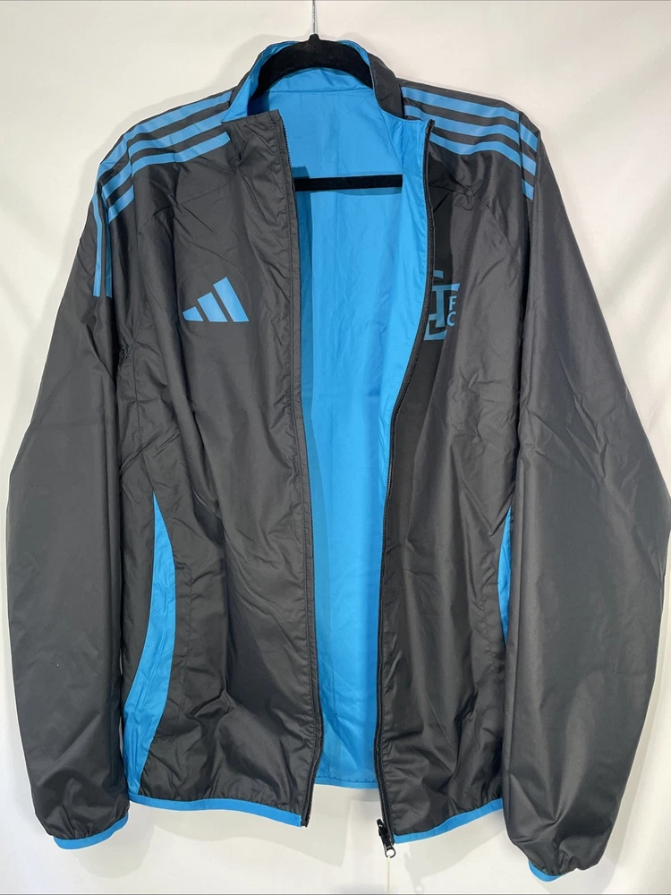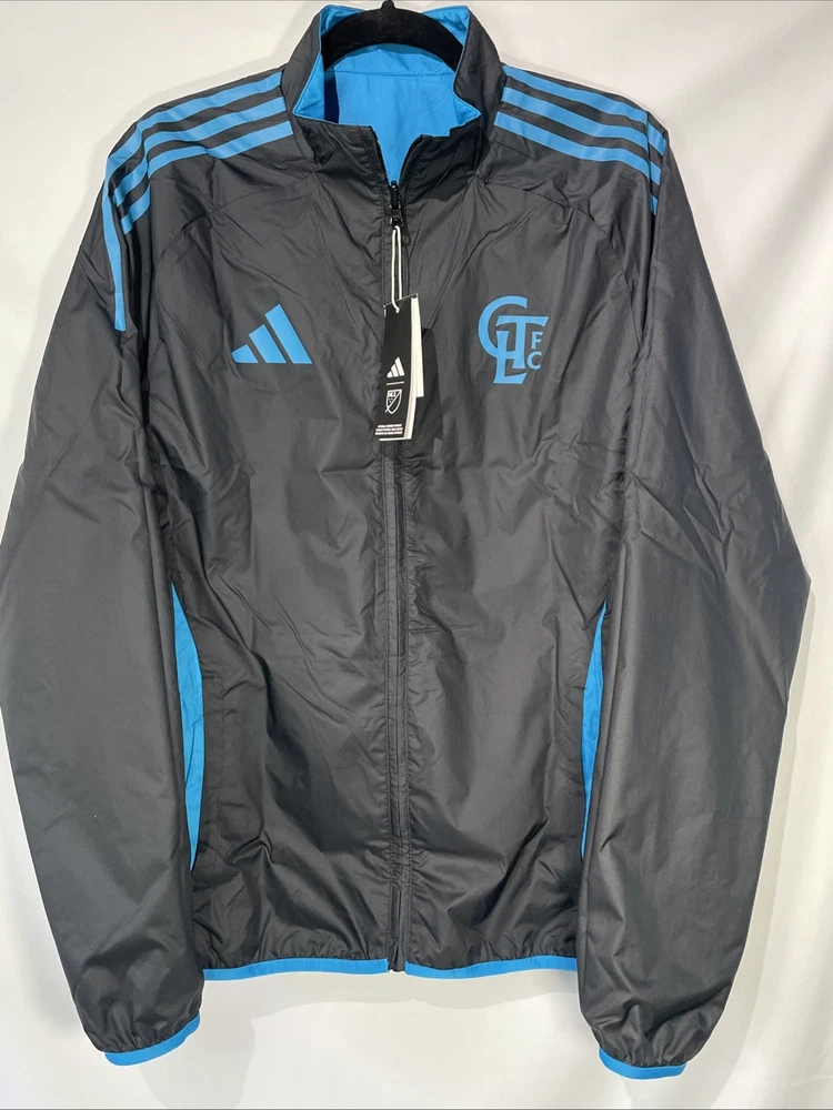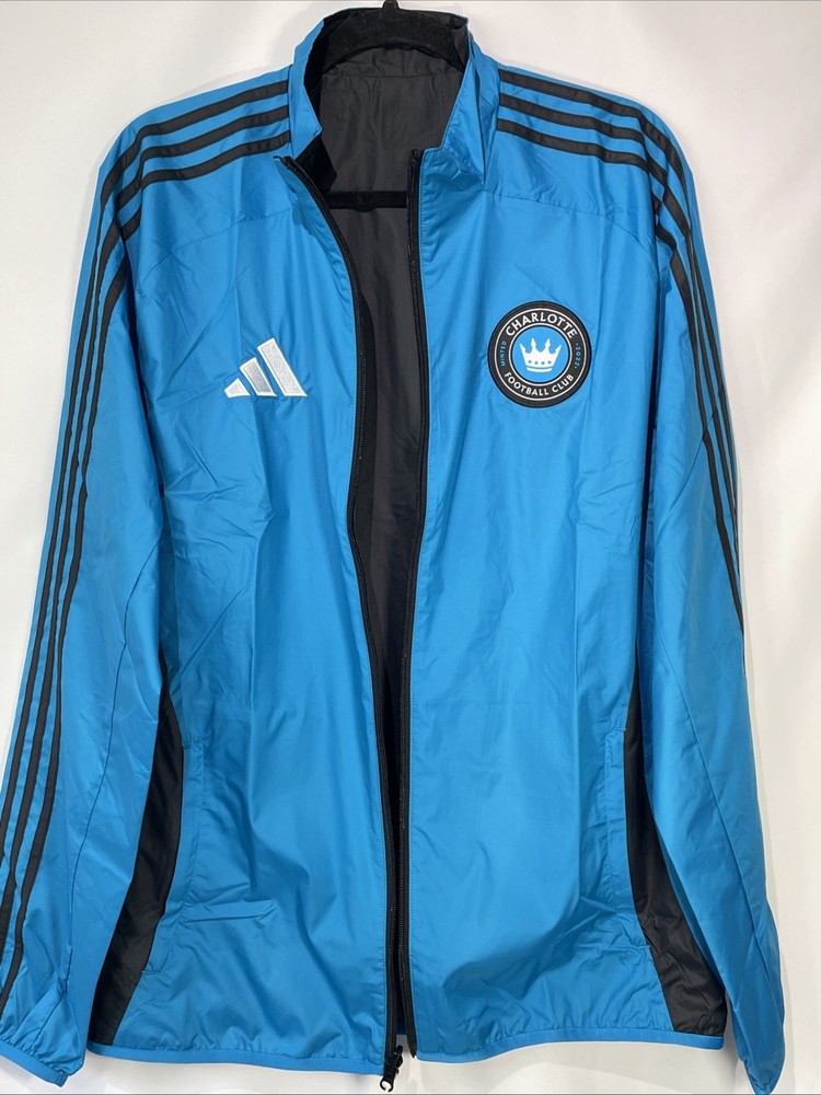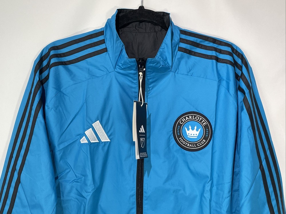 The Adidas Charlotte FC Reversible Anthem Jacket in Black/Blue is a stylish and officially licensed Major League Soccer (MLS) fan apparel designed for men in size medium. This jacket features the Charlotte FC team logo, making it a perfect choice for supporters of the team. Crafted by Adidas, this high-quality jacket is perfect for soccer fans looking to show their team pride during MLS events and tournaments, this product is a must-have for any Charlotte FC fan looking to stay warm and stylish while cheering on their favorite team.