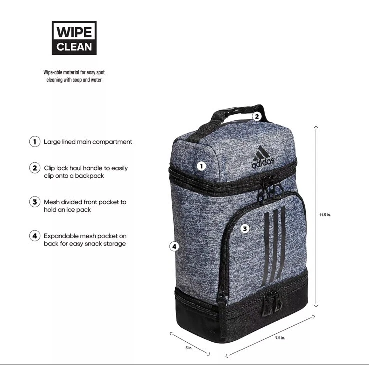 Shape:RectangularMaterial:100% PolyesterTheme:SportsBrand:adidasPersonalize:NoLid Type:HandleItem Width:7.5 inCountry/Region of Manufacture:JerseyDepartment:BoysFeatures:Easy Clean, Easy to Clean, With HandlePattern:SolidUPC:888254188268Item Depth:4.5 inColor:Graygtin13:888254188268Style:SportyModel:888254188268Type:Lunch BagNumber of Compartments:3Item Height:11.5 inNumber of Items in Set:1