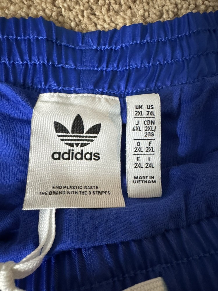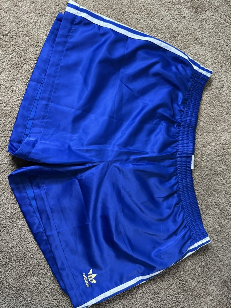 The Adidas Men’s Original Sprinter Shorts in size 2XL are a stylish and functional addition to any man's activewear collection. Featuring a solid blue color with France-inspired stripes, these shorts have a drawstring closure for a customizable and secure fit. Made from polyamide microfiber material, these athletic shorts are machine washable for easy care. Perfect for activities like gym training, cross training, and running, these 5-inch inseam shorts offer a regular fit with an elastic waist for comfort and flexibility. Displaying the iconic Adidas branding, these classic style shorts are a versatile and trendy choice for warmer seasons.