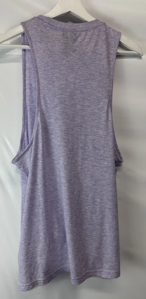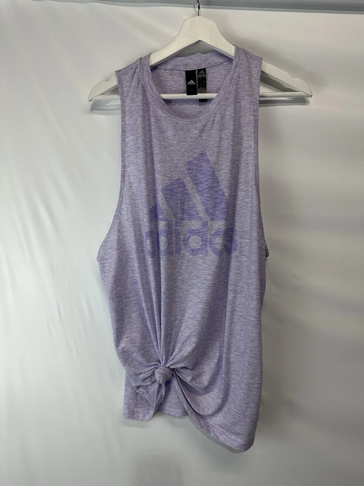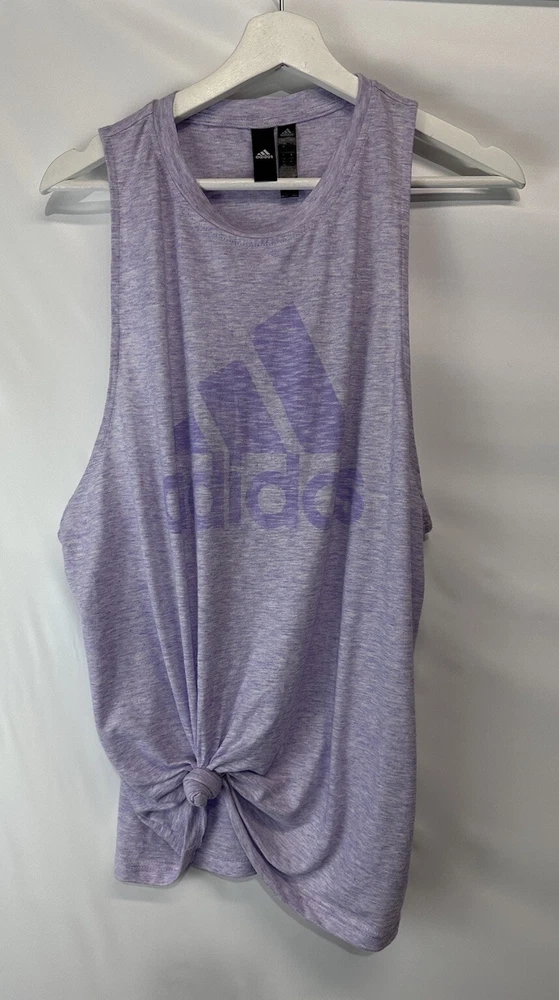 MEASUREMENTS length-29” bust-24” unstretched This Adidas Logo Athletic Top is the perfect addition to your casual wardrobe. The marled purple color and tie front closure add a touch of style to this basic sleeveless tee. Made with breathable and stretchy cotton material, this top is machine washable for easy care. Designed with an athletic fit, this top is perfect for any sports occasion, whether you're hitting the gym or going for a run. The crew neck and size L make it suitable for women of all sizes. With its versatile design, this top is a must-have for any sports enthusiast.