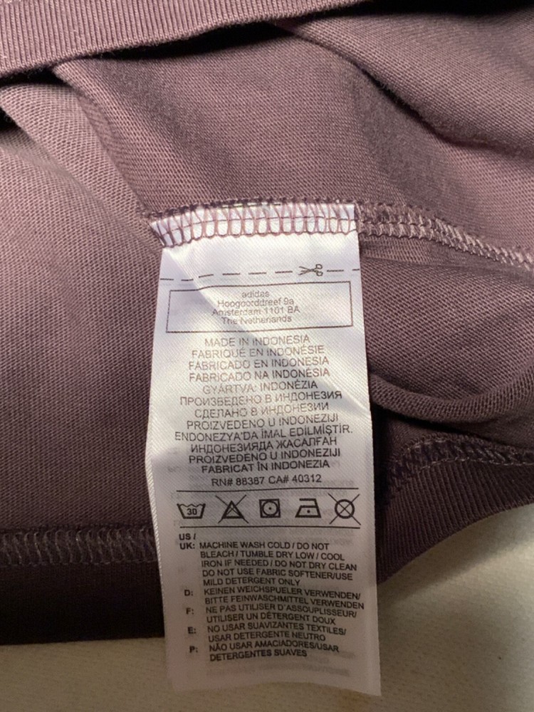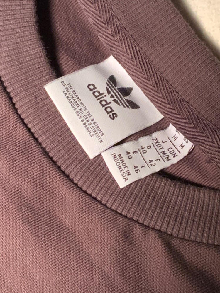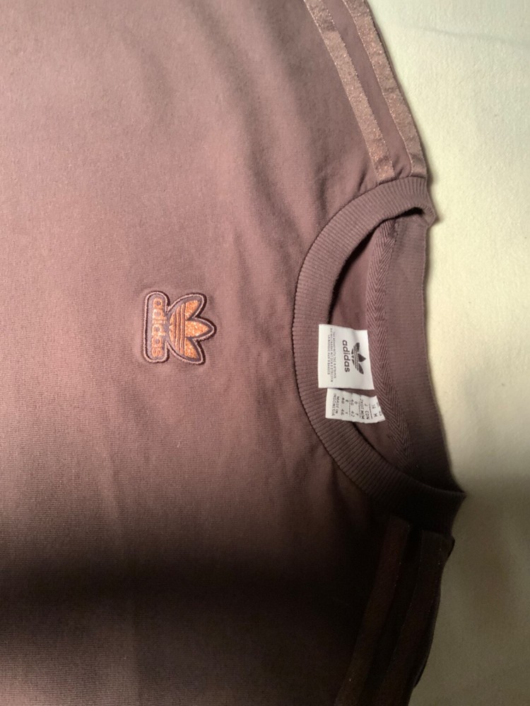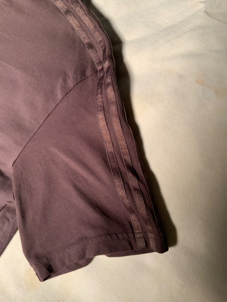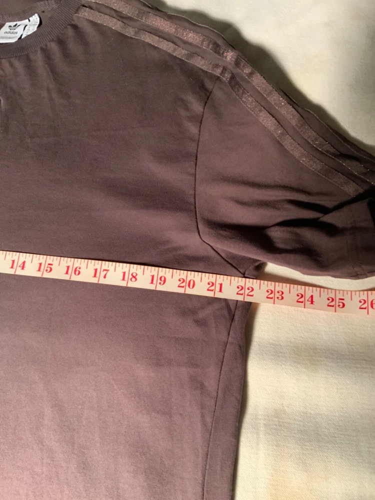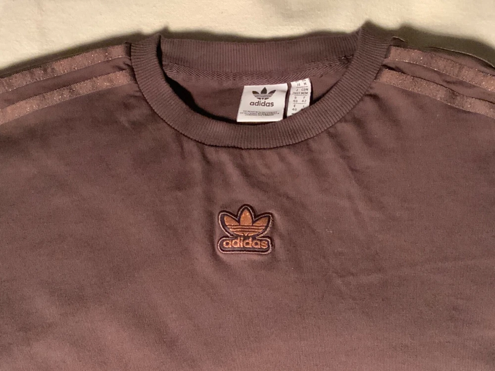 if you like Adidas t shirt this is one you should own because this one has metallic strips and symbol on the t shirt this is a size medium and this is a dark brown color great shirt for you... this has the Adidas symbol right in the middle of the shirt...