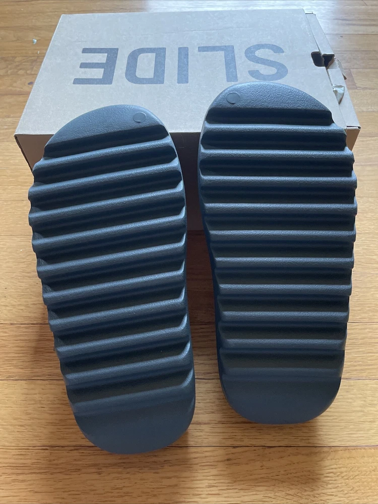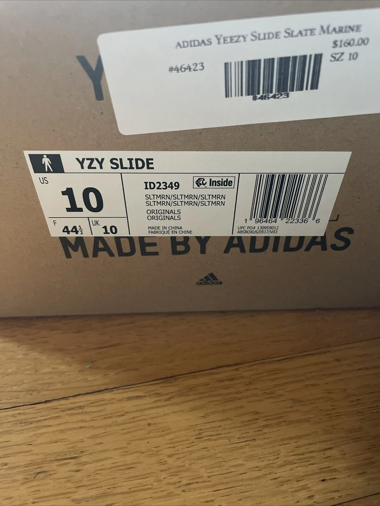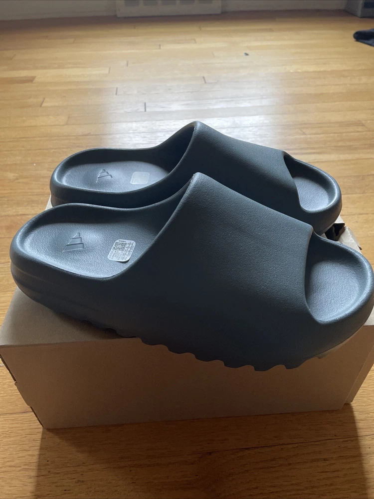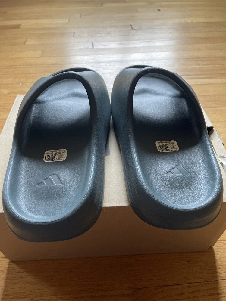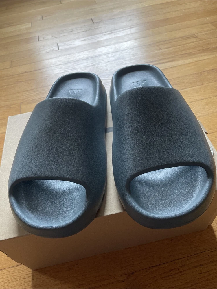 This is a pair of Adidas Yeezy Slide sneakers for men in the color Slate Marine. They have a slip-on closure and are made with a rubber upper and lining material. The shoes are designed for comfort and breathability, with a foam insole and a solid pattern. The outsole is also made of rubber and the shoe shaft style is low top. These Yeezy Slides are perfect for gym and training, walking, beach, and school activities. They are available in a US shoe size 10 and a UK shoe size 10, with a standard shoe width. The shoes were manufactured in China in 2022 and have a style code of ID2349.