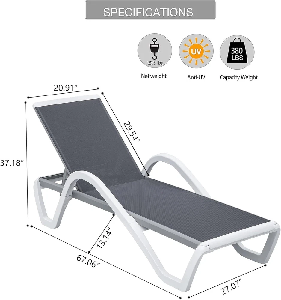 Specifications Place of Origin #originPlace# Main Color Gray Main Material Aluminum Dangerous Goods #dangerFlag# Dimensions & Weights Assembled Length (in.) 67.06 Assembled Width (in.) 27.07 Assembled Height (in.) 37.18 Weight (lbs) 25.13 Product Features 【STURDY ALUMINUM FRAME】:Rust-resistant powder-coated Grey aluminum frame and white plastic triangular structure legs. The modern lounge chair support with max weight 350lbs. 【DURABLE TEXTLIENE MESH】:With UV-resistant Textilene for outdoor long lasting use, this patio chaise lounge is breathable, waterproof, quick drying and high strength support. 【ADJUSTABLE POSITION&LAY FLAT】:This pool lounge chair with 5 adjustable positions which can adjust the backrest to suit for your body. Perfect for read a book or enjoy sun bathing. 【EASY MOVE AND STORAGE】:The legs of the patio lounge chair with 2 wheels to facilitate your movement. In addition, the plastic chaise lounge is easy to assemble, lightweight for stacking but heavy enough not to blow away in a storm. 【UPGRADED ARMREST DESIGN】:Comes with armrests, this lounge chair pool gives support when you up and down, also help relax your arm when you lay down. Description All weather Mesh Fabric The aluminum chaise lounge is made of premium textilene. Just shake off water from a light rain, as the textilene is water repellent and quick dry. Just wipe with a damp cloth. Upgraded Armrest Designed This outdoor chaise folds completely flat for sunning your back and armrests. Added armrest gives you support for up and down, release the pressure for your arm. Study Aluminum Frame Rust-resistant powder-coated aluminum frame, it is sturdy enough to support 350 lbs. Lightweight for stacking but heavy enough not to blow away in a storm. Humanized Design With anti-skid thick legs and two back wheels design, This outdoor liv