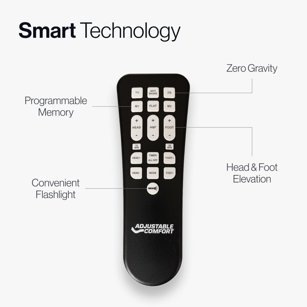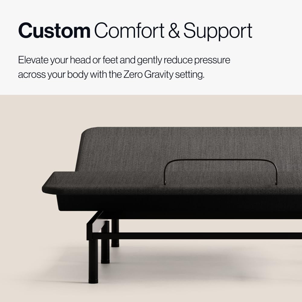 ORDER 2 TWIN XL'S TO MAKE A SPLIT KING - If you sleep with a partner, our Split King size allows you to adjust each sleeper’s side separately with Twin XL bases so you can both your best rest. TECHNOLOGY VIA WIRELESS REMOTE - It’s easy to control and modernize your sleep experience. Use the wireless remote to create and save custom positions. DURABLE ZERO CLEARANCE FRAME - Our Zero Clearance design means no mechanics extend beyond the frame and can be used on an existing platform frame or directly on the floor. Our frame is also constructed with sturdy metal and holds up to 850lbs when distributed evenly across the head and foot sections. EASY ASSEMBLY - While our Adjustable Bed Frame is super high-tech, setting it up is so simple. There are no tools necessary and everything you need (even batteries!) is BENEFITS BEYOND SLEEP - If you struggle with mobility issues, sleep apnea, heartburn, acid reflux, poor circulation, or any ailment where it’s better to sleep in a more upright position, this frame is your perfect match.