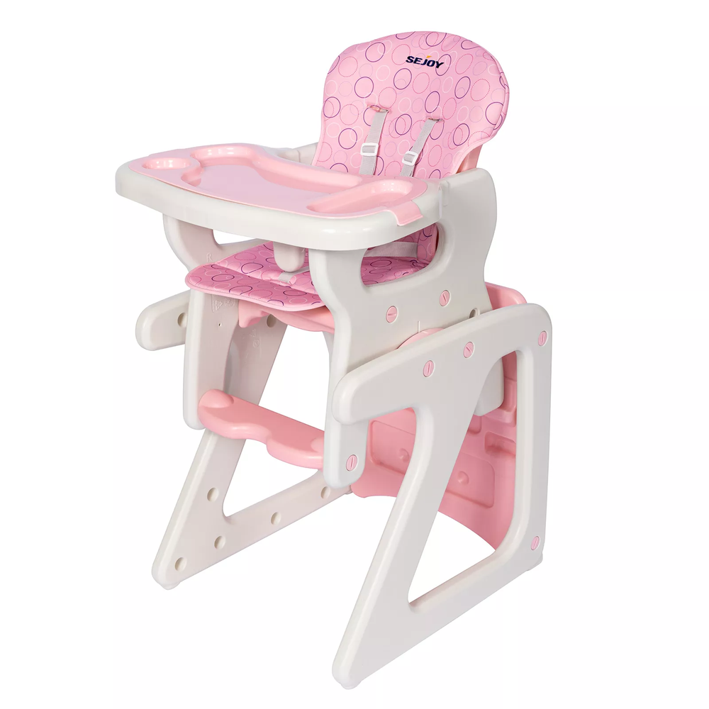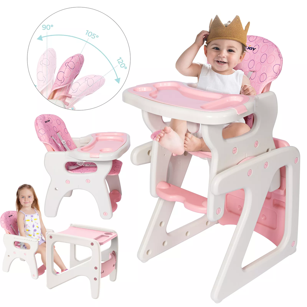 eBay Product Description Sejoy 3-in-1 baby high chair has a multi-function design that it is not only a highchair, but also can be converted into a booster chair or table and chair set. This multi-function baby high chair is suitable for ages from 6 months to 6 years old. It has a user-friendly design, the seat back can be adjusted in 3 positions, and the distance between the tray and the seat back can be adjusted to 3 different sizes to meet the needs of different age groups. Tray is dishwasher-safe and can be removed with one hand to make it easy for feedings, Keep baby safe and comfortable.With a sturdy and durable material that baby high chair ensures safety and ease of use. 3-in-1 Design Removable Double Trays 5-Point Harness Belt Adjustable Backrest in 3 Angles Removable & Washable Cushion Wide Base & Anti-Tip Support Feet Stable Structure Safe Material Easy to install Package Includes: 1 x 3 in 1 Baby High Chair 1 x Instruction Specifications: Material: PP, PE, Sponge Color:Pink Suitable for age : from 6 months to 6 years Product Dimension:19.7×21.7×40.2 in (L×W×H) Chair Size:14.6×17.7×26.4 in (L×W×H) Table Size:19.7×21.7×21.7 in (L×W×H) Product Weight :16.53 lbs Features:Adjustable Height, Removable Tray, Seat Cushion, With 5-Point Harness Belt, Removable & Washable, Stable Structure, With Anti-Fall Safety Baffle, Easy to Assemble Convertible baby high chair, can be used as kids table and chair set, or toddler booster seat. Removable top tray with cup holders and cutlery holder, ideal for easy to clean food debris Keep baby safe and comfortable with 5-point safety restraint system 3 position adjustable front tray, 3 position, reclining, adjustable seat The cushions are soft, skin-friendly and washable to protect your baby's skin from harm Clean with a damp cloth and mild soap Assembly required