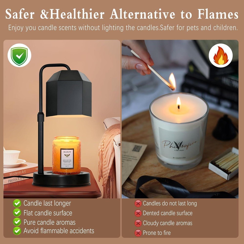 Absolutely love this candle warmer lamp! It melts wax evenly without burning, so my favorite scents last way longer—no wasted candles. The dimmable feature and adjustable height let me control the fragrance intensity perfectly. Plus, the sleek black metal design looks elegant as home decor. Super easy to use with the timer, and it works with all my jar candles. A total game-changer for anyone who loves cozy vibes without the flame hassle!