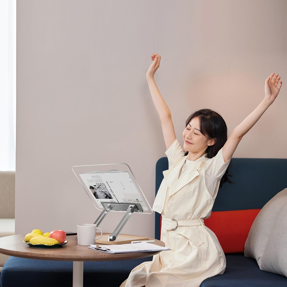Adjustable Acrylic Book Stand for Reading, Book Holder with Pen Slot, Foldable Desktop Riser for, Laptop, Recipe, Textbook - Hands-Free,Cookbook Stand, Clear Design with Page Clips Aesthetic and Durable: Enhance your space with our acrylic book stand. The thick acrylic design offers durability and a modern look, while the wooden base adds natural warmth and complements the clear acrylic material.