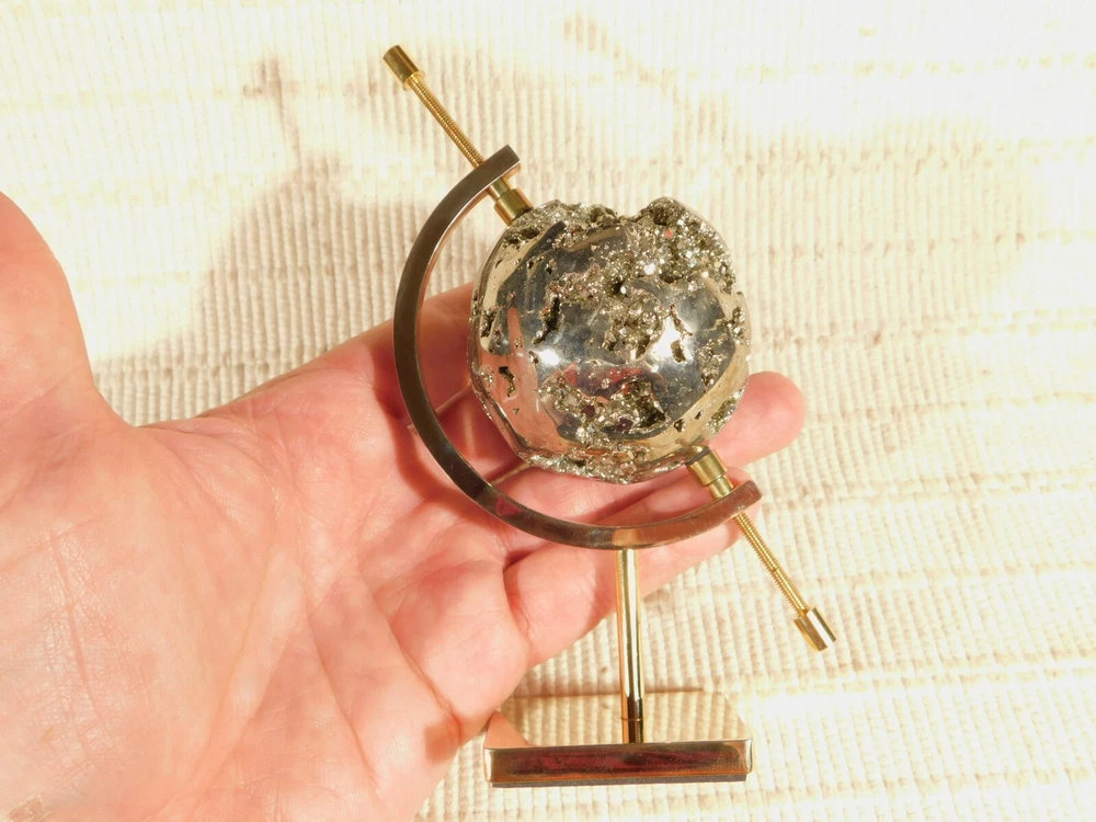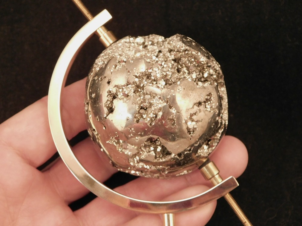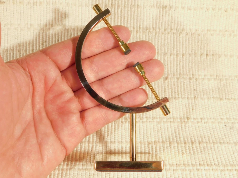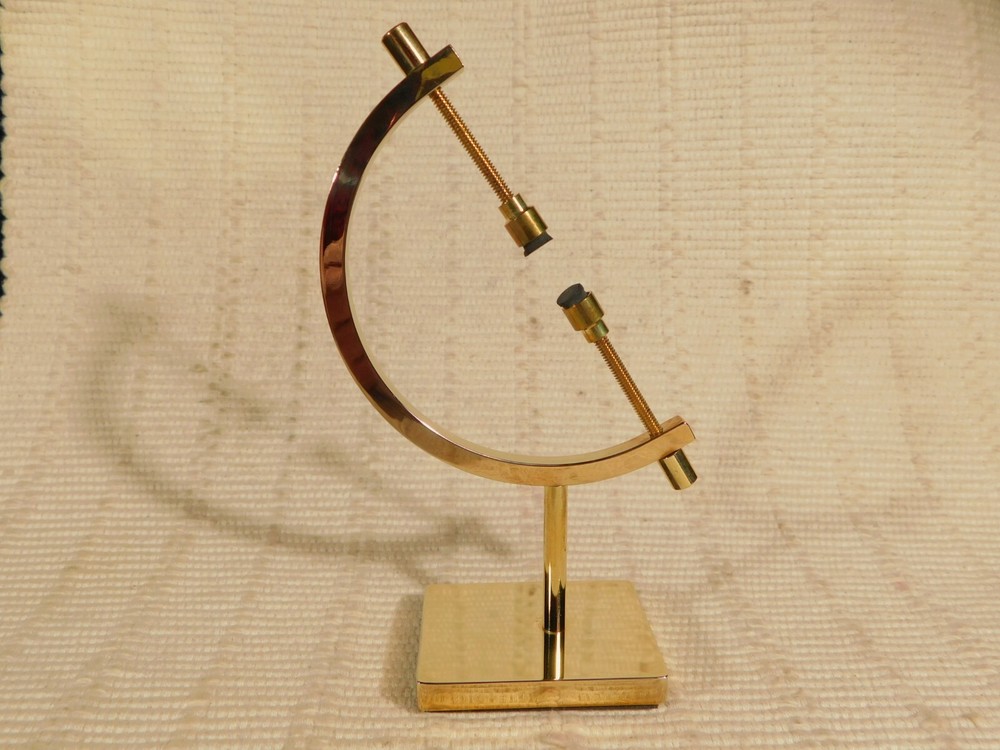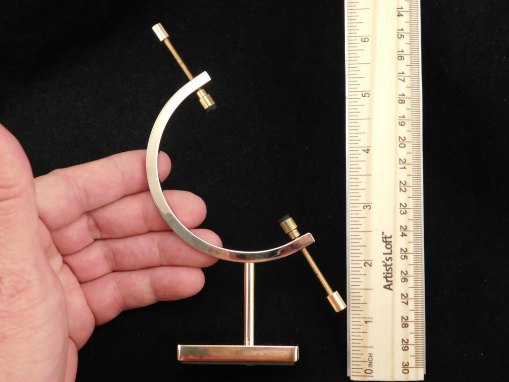 Hello, Here is a medium sized brass plated gold colored caliper type display stand! This adjustable stand has soft rubber pads to safely hold your pieces in place! Great for all kinds of meteorites, mineral specimens and any other collectibles you may have! It measures about 5" tall and the opening is adjustable from about 2.25" to 9/16" and the pyrite sphere measures 2 3/8" or 6cm wide. Combine and save on shipping! INTERNATIONAL BUYERS PLEASE NOTE: Import duties and taxes are not included in the item price or the shipping charges. These are the buyers responsibility. If you are concerned about them, please check with your country's customs office before buying. RETURN POLICY We guarantee you will be satisfied with your item or we'll refund your purchase price, less shipping charge, upon safe return of the item in original condition within 30 days. Prior to returning the item, please contact us within 48 hours of receiving item. If your item arrives damaged, please contact us within 24 hours of receiving as we will be happy to resolve any issue. Buyer is responsible for all return shipping charges.