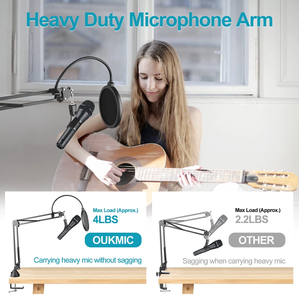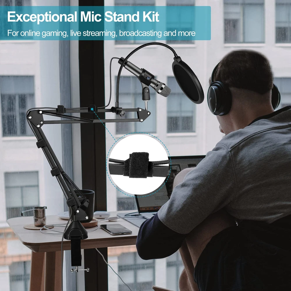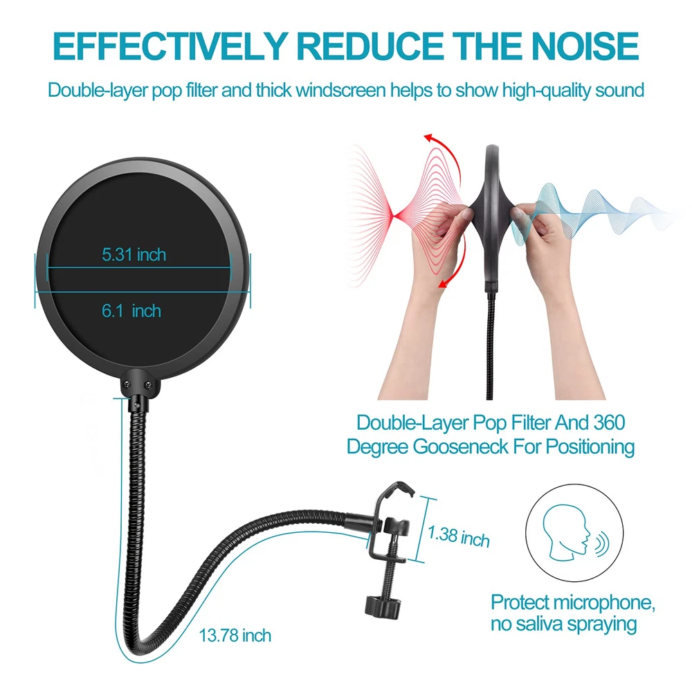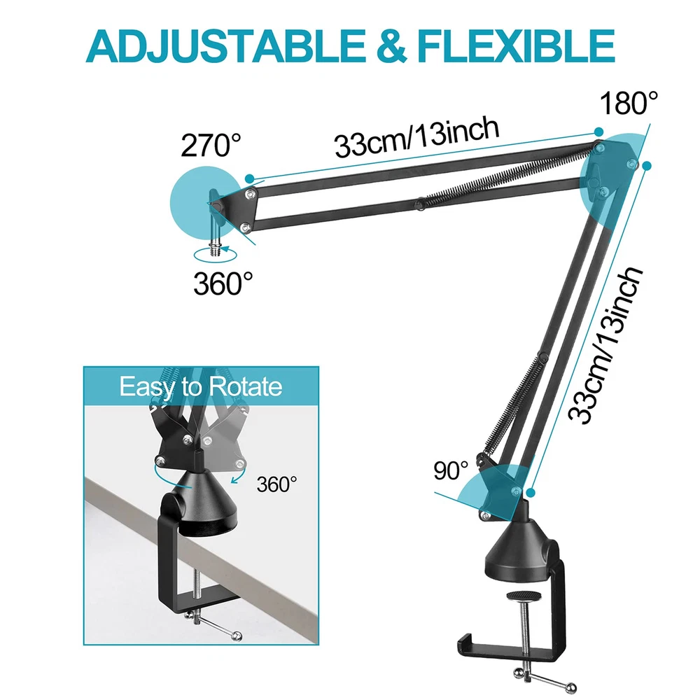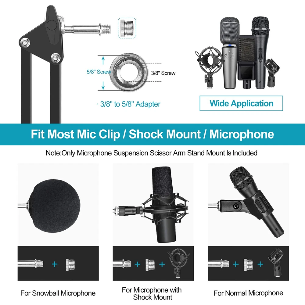 Unrivaled professionalism:2 styles universal mic holder in package are suitable for most types of microphones. Shock mount can effectively isolate most physical vibration and stand noise, it will make your broadcast or singing voice sound more pleasant and realistic. Adjustable range 43mm-47mm. The velcro to neatly route cables along the stand for an organised workspace, foam windscreen is helpful to take the sounds to a clearer and more professional level Diversity & Compatibility:microphone arm comes with a standard mic clip, two 3/8"to5/8" adapter screws and shock mount to fit most microphones such as USB condenser mic,dynamic microphones, handheld microphone and some special mics.This mic stand can work perfectly with Blue Yeti, Blue Snowball, Hyperx Quadcast,Shure SM58, etc Upgraded Desktop Mounting Clip:The redesigned desktop clip has a wider grip opening that allows it to attach to any desktop up to 2.7 inches/7 cm thick, fits most desktops and includes a headphone hook for easy headphone storage Durable & Stronger:Mic Stand is made of high quality alloy steel and double suspension springs design makes the microphone more stable,reduce shaking, sinking and noise effectively,prolong the life span of the stand .The painted steel can resists years of chips and scratches to stay looking new. (Max Support Weight is 4.4 lbs/2kg) Packaging Contents:1xMicrophone arm stand,1xReinforced metal base,1x Shock mount,1xMicrophone clip,1xWindscreen,1xPop Filter,5xVelcro,2xAdapter screws.If you have any questions after receiving this product, please contact us in time, we will help you solve it as soon as possible Flexible & Free Position:professional mic stand all parts of the boom arm are fully adjustable. you can adjust the mic to the suitable angle or height to show your voice. The microphone stand base can rotate 360 degrees left and right,180° arm shaft for up-and-down movement and 270° metal adapter to flexible position microphones Double Layer Pop Filter: This adjustable blue yeti microphone stand features a double layer blast filter that reduces poofing, wind interference, and saliva spatter, and enhances the sound to a clearer, more professional level