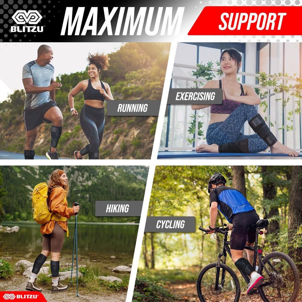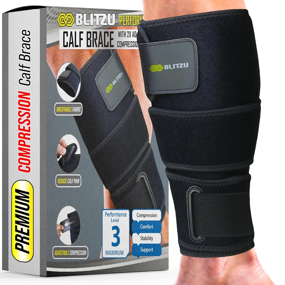 Calf Brace for Torn Calf Muscle, Adjustable Neoprene Compression Sleeve for Women, Men, Runners. Support Wrap for Shin Splints, Strain, Tear, Lower Leg Tibia Injury, and Pain Relief. S-M Effective Pain Relief: The BLITZU Calf Brace provides targeted relief from calf pain, stiffness, swelling, muscle strains, tears, cramps, tendonitis, and shin splints. Ideal for managing discomfort from injuries and overuse, it helps reduce inflammation and accelerate recovery. High-Quality Comfort: Crafted from breathable, high-quality fabric, this calf support ensures all-day comfort and flexibility. The soft, lightweight material is designed for a snug fit that contours to your calf, providing effective support without restricting Dual Adjustable Compression Straps: Features dual adjustable straps for a customizable fit and maximum support. Tailor the compression to your specific needs to stabilize your calf muscles and tendons effectively, reducing pain and preventing further injury during exercise or recovery. Versatile Use: Perfect for a wide range of activities, including running, hiking, cycling, sports, and everyday tasks. The versatile design offers reliable support for athletes and individuals seeking extra stability and comfort during physical activities and recovery. Universal Fit: Available in multiple sizes to fit various calf circumferences for both men and women. The adjustable design ensures a secure, snug fit for all body types, providing enhanced support and preventing slippage during movement. Durable & Easy to Maintain: Made from durable, long-lasting materials that can withstand regular use. The brace is easy to clean and maintain, ensuring it stays fresh and ready for your next workout or activity. Reliable Customer Support: BLITZU is committed to your satisfaction. If you encounter any issues with our calf brace, please contact us for prompt assistance. We offer a satisfactory resolution within 24 hours to ensure you receive the best service and support. Product Description The video showcases the product in use. The video guides you through product setup. The video compares multiple products. The video shows the product being unpacked. Doctor Recommended Recover with Confidence and Comfort Experience targeted relief and support with the BLITZU Adjustable Calf Brace. Designed for optimal comfort and customizable compression, this versatile brace aids in managing calf discomfort, swelling, and muscle strains, helping you stay active and recover faster. Targeted Relief for Shin and Calf Discomfort Durable Design Built with high-quality materials to withstand rigorous use and frequent wear. Enhanced Stability Stabilizes the upper arm muscles, minimizing the risk of further injury and aiding recovery. Adjustable Pressure Straps Extra compression straps allow you to adjust the pressure for optimal support, reducing swelling and adding stability. Breathable Fabric Crafted with lightweight, breathable material for all-day comfort and effective moisture control. Trusted and Approved by Professional Runners! Support That Keeps You Running Strong. "The support it provides is unmatched—I can feel the difference in muscle stability and reduced fatigue, especially during long runs and interval training. It fits perfectly and stays in place without sliding down, even during intense workouts. Plus, my recovery time has noticeably improved, making it easier to train back-to-back days. If you're serious about running and want reliable calf support, I can’t recommend this brace enough!" Trusted and Approved by Store Workers! All-Day Support for On-Your-Feet Strength. "I'm constantly on my feet, lifting, bending, and moving for hours on end. My calves used to ache by the end of the shift, but since I started using the Blitzu calf brace, the difference is night and day. It provides excellent support, reduces fatigue, and makes my legs feel stronger and more comfortable even during the busiest days. I can finally end my shifts without soreness! Highly recommend for anyone in a physically demanding job." 6.0 inches x 9.0 inches x 0.6 inches. Weight: 7.37 oz Color Black Product Dimensions 9 x 6 x 0.6 inches; 7.37 ounces Country of Origin China Specific Uses For Product Sprain Use for Calves Age Range (Description) Adult Size Small/Medium