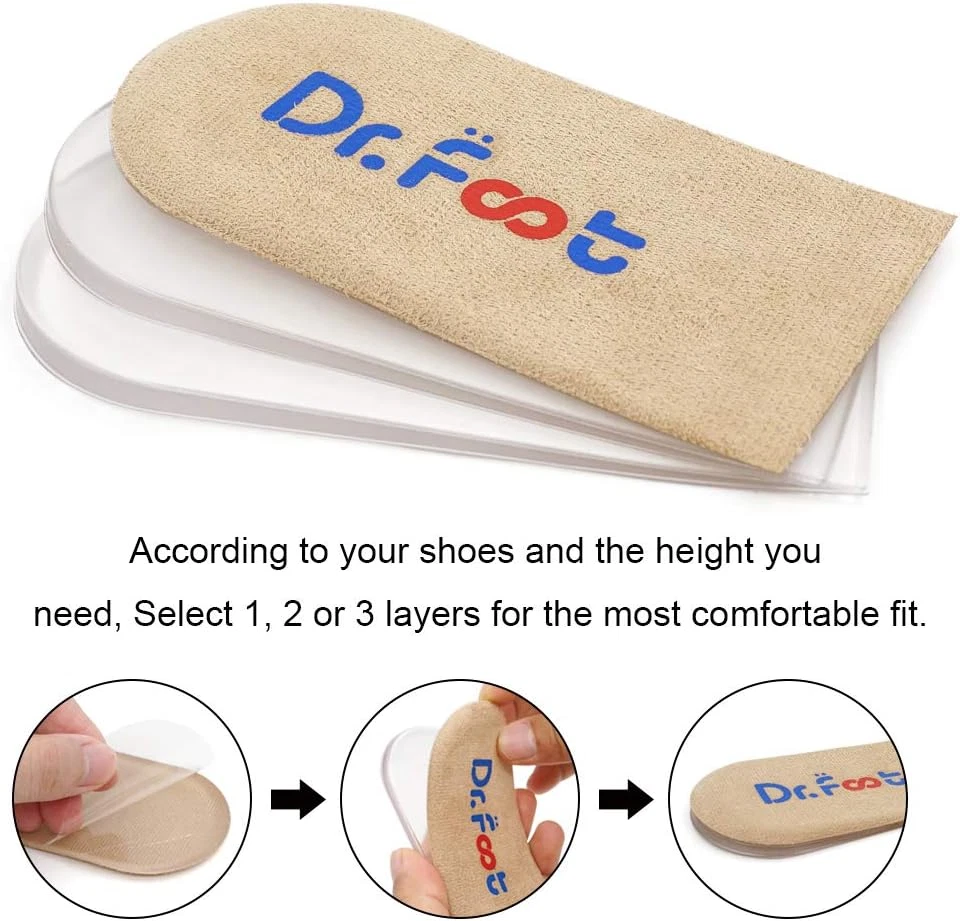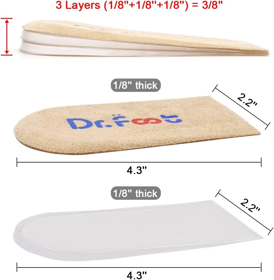 HEEL PAIN RELIEF: The heel lift inserts are great For Leg Length Discrepancies, Heel spurs, Heel Pain, Sports Injuries, Achilles tendonitis and other clinical conditions. ADJUSTABLE DESIGN: Adjustable layers allow you to build up the height by adding layers yourself; Strong self-adhesive that firmly stays in place for lasting comfort; if they lose stickiness, just tear off and wash them, air dry then they can be used again. HIGH-QUALITY MATERIAL: The heel lift inserts are made of soft and durable medical-grade PU gel. And the fabric is breathable, moisture wicking, durable, and washable. FIT MOST SHOES: These heel cushion inserts are easy to apply, stay in place, and don’t cause crowding in your shoes. They are available for both men and women and fit all types of shoes, such as running shoes, dress shoes, boots, sneakers, work shoes, leather shoes, etc. Risk Free: If you are not satisfied with this purchase, please feel free to with your order ID and tell us how would you like us to help, we will try our best to offer the most responsible solution. Moreover, we do not want your used products to be returned to warehouse and sold to other customers. Thank you very much for your time. Product Description ADJUSTABLE DESIGN Dr. Foot's Adjustable Orthopedic Heel Lift Inserts allow you to build up the height by adding layers yourself; Strong self-adhesive that firmly stays in place for lasting comfort; If they lose stickiness, just tear off and wash them, air dry then they can be used again. Great for Heel Pain and Leg Length Discrepancies Dr. Foot's heel lift inserts are great For Leg Length Discrepancies, Heel spurs, Heel Pain, Sports Injuries, Achilles tendonitis and other clinical conditions; Correction or adjustment of Leg Length Discrepancies are caused by amputation, stroke, hip or knee replacement, fractures, or ankle equinus. Wear Dr. Foot's Heel Lift Inserts to enjoy your sports: running, MMA, basketball, volleyball, baseball, climbing, football, soccer, walking, hiking, tennis, golf, kickboxing, gymnastics, jogging, exercise workouts, martial arts, dancing, cycling, and more.