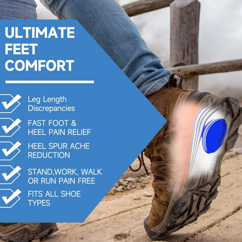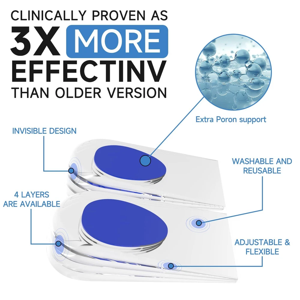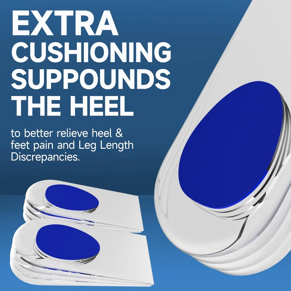 UPGRADED DESIGNED :Everyone knows the trick of applying a heel lift layer for feet pain repair. But upgrading your method with Poron heel lift insert to another level of relief. The high-density PORON foam and TPE Gel can provide maximum cushioning & shock absorption,provides added heel protection,3X heel pressure relief than older product. HEEL PAIN RELIEF-The heel lift inserts are great for leg length discrepancies,heel spurs,heel pain, sports injuries, achilles tendonitis and other clinical conditions. Excellent padding provides comfortable support when shopping,walking,standing all day. Soft material repliates heel shape with a snug fit. After repeating test and research,shaped ergonomically for a comfortable fit even for those with sensitive feet. To fit for most US feet. THE EASIEST CORRECT LEG LENGTH DISCREPANCIES:These incredible heel lifts allow you to correct leg length discrepancies in just a blink. The best part is,such that no one ever knows the secret inside your shoe. The unique process provides ultra soft cushioning for all-day comfort and a strong foundation to maintain stability and Fixed position. Maintain the best condition throughout the day. 4 LAYER ADJUSTABLE DESIGN - ONLY design by . Smooth, well-crafted edges help to avoid rubbing your foot. 4 removable 1/4" thick layers for optimum Heel lift customization. Adjustable layers allow you to build up the height by adding layers yourself. These layers can be used individually or as a combination. Each lift for help relief the pains of your feet. It won't be noticed when put in shoes. Reusable and washable.Lightweight and shaped ergonomically for a comfortable fit even for those with sensitive feet.Your results are our top priority. It's part of who we are as Profession shoe insole Experts. We ensure all our products are designed to the highest standard, we base our ethos on customer need. Help you Get Back to the Original You.