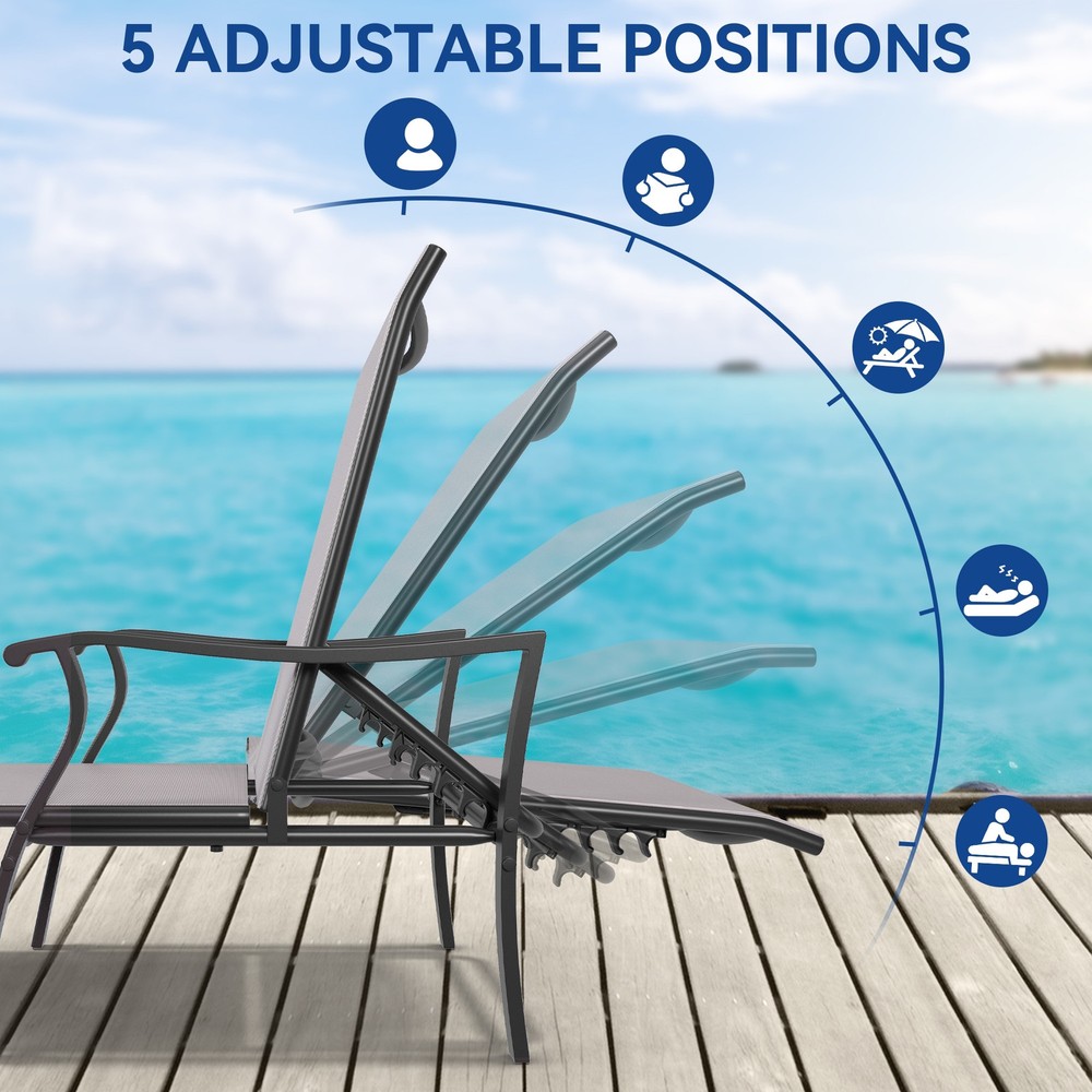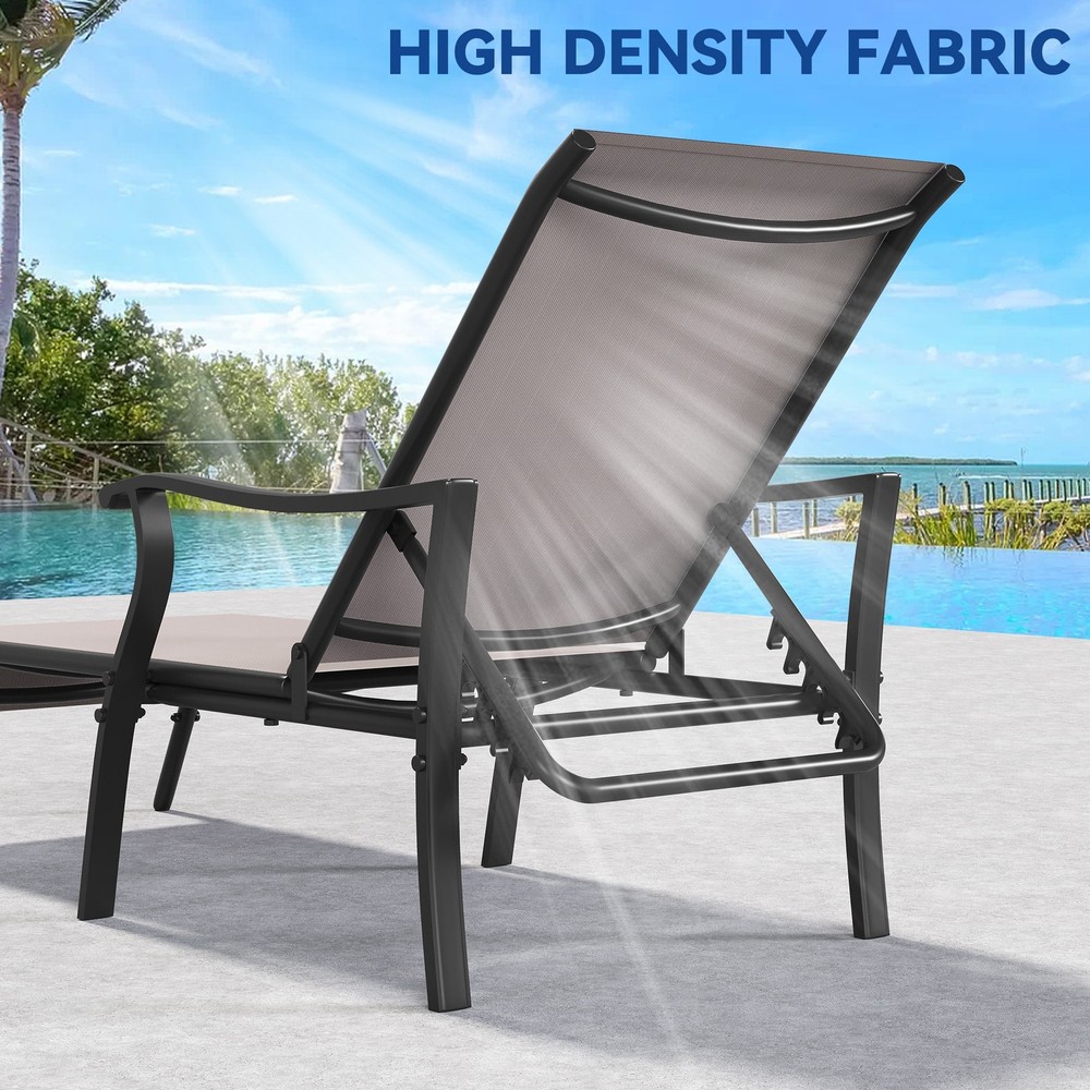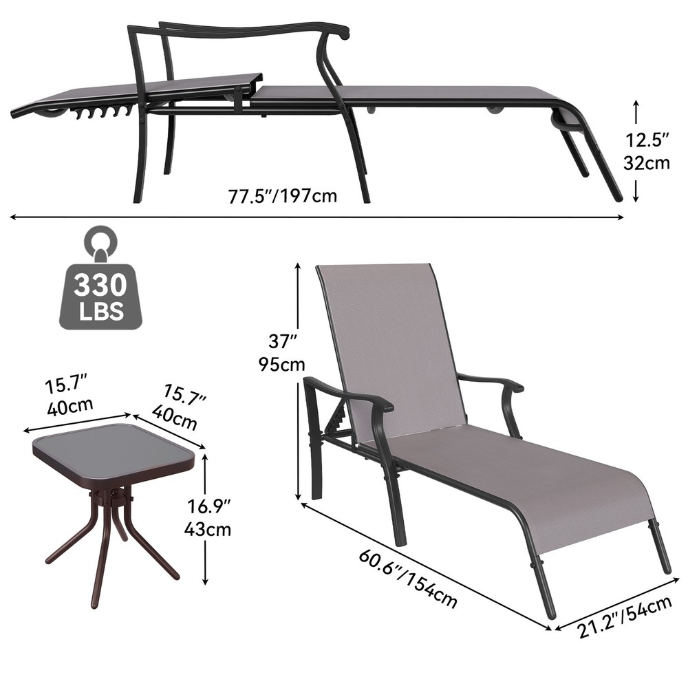 Weather-Resistant Textile Fabric: Our chaise lounge chairs are upholstered in high-quality, weather-resistant textile fabric that effectively withstands erosion from sunlight and rain. The breathable material ensures cool and comfortable relaxation, making it perfect for hot summer days.Features Rustproof Aluminum Frame: The outdoor chaise lounge chairs feature sturdy aluminum frames coated with anti-rust paint for durability and stability. Each chair is capable of providing reliable support for up to 330 pounds, ensuring a secure seating option for outdoor lounging.Sleek Coffee Table: The chaise lounge set comes complete with a stylish coffee table that offers both convenience and aesthetic appeal. Use it to place your drinks, snacks, or decorations while enjoying the comfort of the Free Shipping Over $49.99* Details Outdoor Recliner With Side Table And 5 Adjustable Positions (Set Of 2) - N/A Product Description: Weather-Resistant Textile FabricOur chaise lounge chairs are upholstered in high-quality, weather-resistant textile fabric that effectively withstands erosion from sunlight and rain. The breathable material ensures cool and comfortable relaxation, making it perfect for hot summer days. Features Rustproof Aluminum FrameThe outdoor chaise lounge chairs feature sturdy aluminum frames coated with anti-rust paint for durability and stability. Each chair is capable of providing reliable support for up to 330 pounds, ensuring a secure seating option for outdoor lounging. Sleek Coffee TableThe chaise lounge set comes complete with a stylish coffee table that offers both convenience and aesthetic appeal. Use it to place your drinks, snacks, or decorations while enjoying the comfort of the loungers. The set is perfect for various outdoor settings such as yards, balconies, and patios. DimensionsThe package includes two outdoor lounge chairs, each measuring 77.56''L x 25.98''W x 37.4''H, and a side table with dimensions of 15.75''L x 15.75''W x 16.93''H. With simple, easy-to-follow instructions included, assembly is quick and hassle-free, allowing you to start enjoying your outdoor relaxation space in no time.