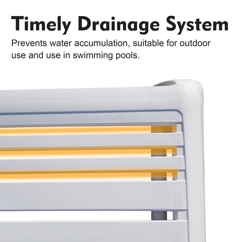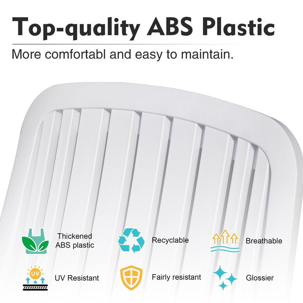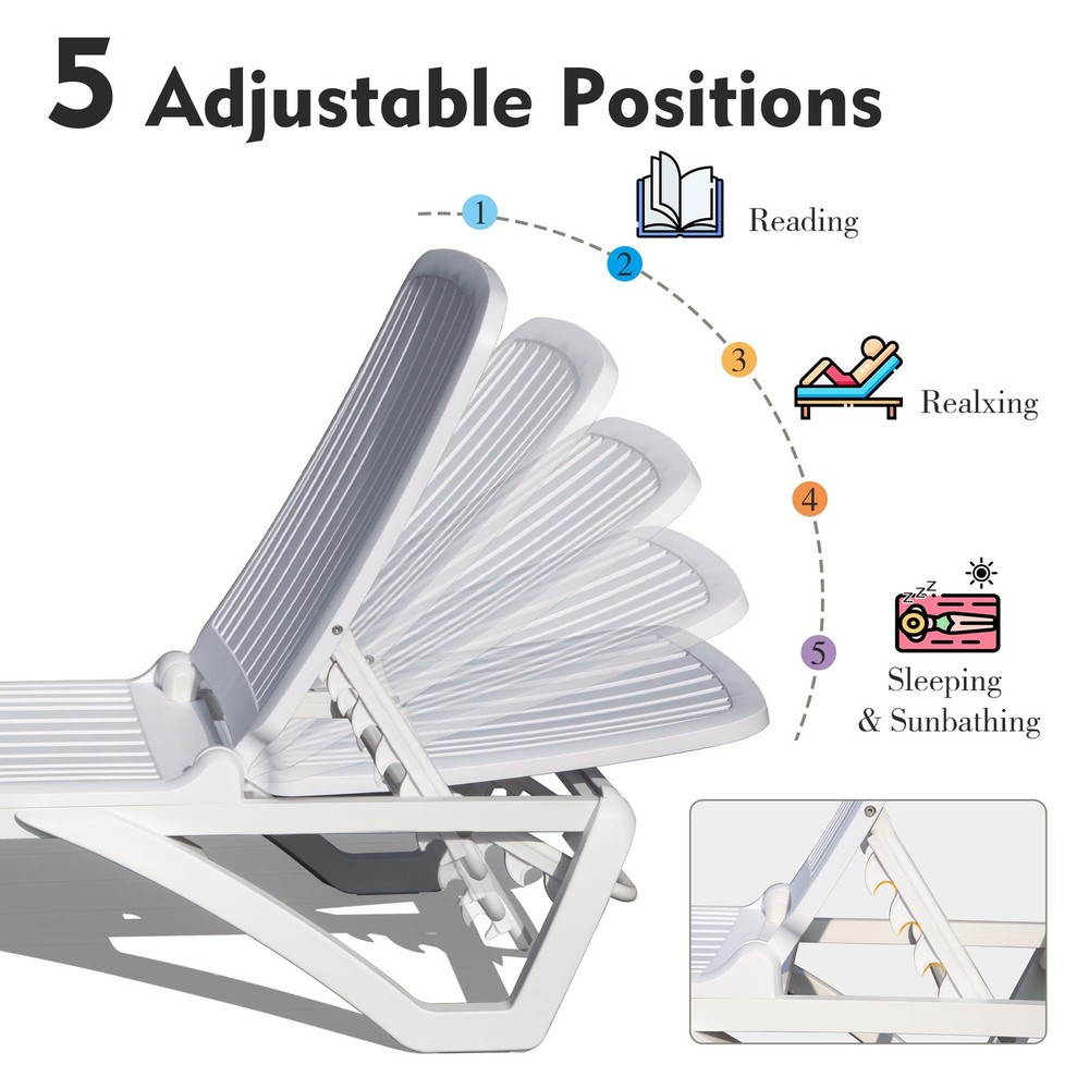 Specifications Place of Origin #originPlace# Main Color White Main Material Plastic Dangerous Goods #dangerFlag# Dimensions & Weights Assembled Length (in.) 67.05 Assembled Width (in.) 27.09 Assembled Height (in.) 32.05 Weight (lbs) 30.64 Product Features Premium & Durable Material: This pool lounge chair is made of high-quality ABS plastic, which offers remarkable resilience against the elements. The chaise lounges are weather-resistant and stain-resistant, ensures durability and lightweight portability for your outdoor relaxation needs. 5 Adjustable Positions: The outdoor chaise lounge is equipped with 5-position adjustable backrests for ultimate relaxation, including a fully flat option. Different angles can meet your different needs for reading, resting, sleeping, sunbathing, etc. Sturdy & Stable Structure pool loungers boast a stable structure with 4 triangular legs, ensuring enhanced stability for the frame. Each lounger can support up to 350 lbs., providing reliable support for your lounging comfort. Easy to Move: Comes with 2 movable wheels on the chaise lounge chair legs, you can easily move to any place you want. It is convenient for your outdoor activities. Safety Design: Featuring curved corners and a non-slip grid pattern, chaise lounge provides maximum protection for you and your family, ensuring a worry-free lounging experience. Stacking Design: You can simply stack patio lounge chair together to save space when not in use. Choose this lounge chair to maximize the use of your outdoor space and keep it tidy. Package Includes: Come in one package. Package includes 1 chaise lounge chair, hardware, tool kits and instruction. Description