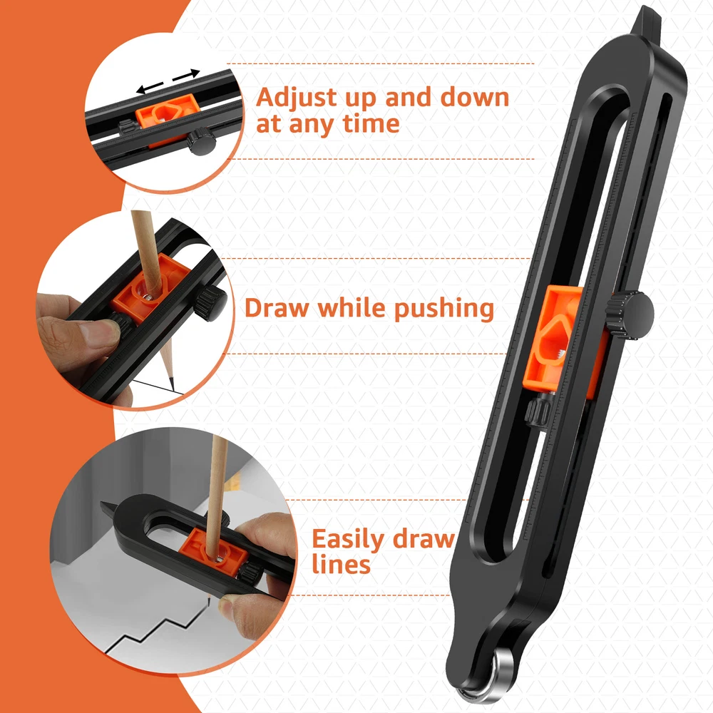 [---Welcome TO Our Store! Happy Shopping! Happy Life---] Highlight description: [Precision Contour Marker] Equipped with a creative pulley and pointer design at both ends, this marker glides effortlessly on the pulley side, while offering easier and more precise outlining on the pointer side. The pen holder's adjustable height allows for quick and convenient switching between styling end [Adjustable and Lockable] Tailor the tool's grip to your liking with easily adjustable tightness. Our contour gauge excels in tracing the intricate and irregular shapes of any object. Once adjusted, the tool locks firmly in place to guarantee precision [Easy to Operate] Designed for single-handed adjustments. Simply secure the pencil at the center and glide to draw flawless lines with ease [Widely Used] This contour scribe tool simplifies the task of replicating diverse shapes, making it an ideal choice for tasks like tile setting, laminate and carpet trimming, as well as ceramic and tool mold making [After-sales] Should you have any queries, don't hesitate to reach out. Our dedicated service team is here to deliver professional and satisfactory assistance Detailed description: Description The Precision Contour Scribe is an easy tool for copying various shapes. Designed with a pulley and pointer, it can be used at either end and is particularly useful for drawing the contours of irregular and complex objects. Key Features Adjustable: Adjustable tightness as needed. Ideal for drawing the contours of irregular and complex objects. Versatile: One-handed adjustment for easy operation. The Contour Marker is perfect for tile bonding, laminating and carpet cutting, ceramic and tool mould making etc. Specification Product name: Contour Scribe Tool Material: ABS Color: Black Size: 24 x 3.5CM Notes: 1.There may be slight differences between the picture and the actual color of the commodity. We will try our best to show you the exact color. 2.Please allow slight dimension difference due to manual measurement. Parts List: 1 x Contour Gauge Scribe Tool 2 x Log Pencils 1 x Pencil Roller We accept Payoneer/Mastercard/VISA/Google Pay/American Express etc. Immediate payment is needed, so that we can finish your orders, then dispatch and post them in time. We really appreciate your business with us, and hope to keep it lasting. Orders will be processed and dispatched within 1-5 working daysafter payment received from Monday to Friday. Saturday and Sunday orders will be posted in the following Monday. when items are in peak period, the time will be prolonged according to certain situations, which may beyond our control, but we are always ready to help you track the delivery info. Returns: 1.Defective goods must be returned within 30 days from the delivery date. The buyer is responsible for the return shipping fee. We will not reimburse the return shipping fee unless when we have shipped the wrong item. 2.We reserve the right to refuse any returns for our reasons. Contact Us: 1) We are committed to provide you with great service. If you are in any way dissatisfied with your purchase: Please DO NOT open eBay case immediately. Please DO NOT open PayPal Dispute immediately. Please DO NOT leave us a low score for DSR immediately. Please DO NOT leave us a neutral/negative feedback immediately. Always communicate first. Please contact us via eBay message. We will work with you to resolve any problem. 2) We always reply messages within 2 business days, please check your Spam Inbox or eBay Message Box if you do not receive a response within 2 business days. We are always making efforts to providing better products and service. if you feel satisfied with us, please leave us a 5-Star on the Detailed Seller Ratings.