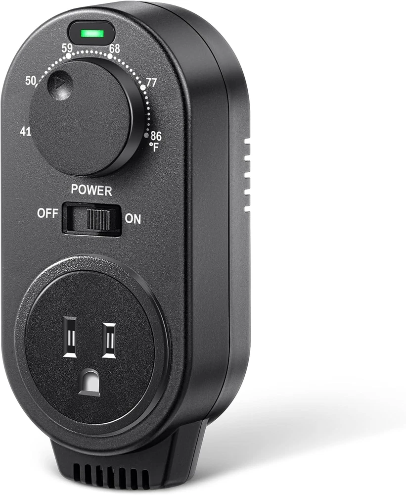 Thermostat Control: this non digital plugin thermostat comes with an adjustable temperature dial; Provide heat and cool 2 modes for you to choose, the thermostat will automatically turn on or off your heating or cooling equipment according to the target temperature you set, you can set the appropriate temperature (41-86 degrees Fahrenheit), maintain a stable room temperature for your greater comfort; Warm tips: please disconnect the power supply before switching the heat or cool mode Easy to Operate: plug and play design; No need to use other tools, just open the heat or cool mode button manually; Plug your heating or cooling device into the thermostat outlet, turn POWER switch to On and you're ready to go; Just set your ideal temperature, the scale is clear, even the elderly can simply operate it; The LED light let you easily see if it is on or off too Safe and Reliable: this 3 prong thermostat plug into a standard socket is ETL listed; Temperature control range is 41-86°F; Rated voltage is 125VAC 60Hz; Max Loading: 15A 1875W and has a recoverable overload short circuit; Dimensions: 5 x 2.5 x 2.5 inches; Do not immerse controller or probe into water Save Your Time: the thermostat will make your life comfortable; The adjustable thermostat turns on and off appliances connected to outlet based on the target temperature; It uses power only when necessary, brings convenience to your life Wide Usage: suitable for most portable space heaters, window air conditioners and circulating fans; Can also be applied for greenhouse, reptiles breeding, pet feeding, wine cellar, swamp cooler, evaporative cooler, electric fireplace heater, garage, RV and so on Product Description Specifications: Quantity: 1 piece Dimensions: 5 x 2.3 x 1.5 inches Input: 125VAC 60Hz Load (max): 125VAC@15A 1875W -- resistive load 1/2HP@125VAC, TV-5 -- inductive load Temperature control range: 41-86 °F Note: It cannot be controlled remotely, it is manually adjusted. Package includes: 1 x Plug in heating and cooling thermostat