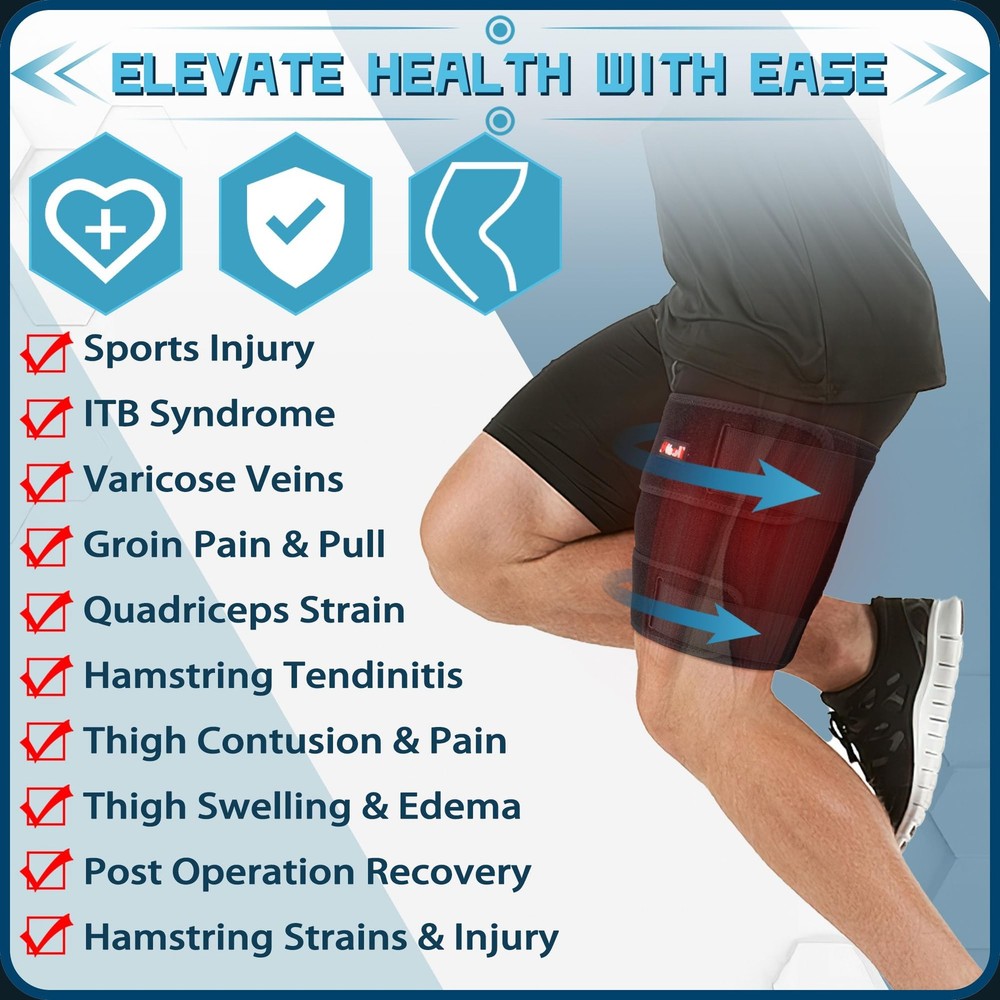π£π₯ππ©ππ‘π§ & π₯πππππ©π: hamstring brace is designed to provide targeted support for thigh muscles, effectively promoting blood circulation & increasing oxygen supply. This helps alleviate and prevent tendinitis, quadriceps strain, sciatica pain, Iliotibial band syndrome, thigh bursitis, cellulitis, varicose veins, swelling, hamstring strains & injury, thigh contusion & pain, inflammation, and groin pull & pain. It is the ideal choice for post-surgical & sports injury recovery ππ‘π‘π’π©ππ§ππ©π πππ¦πππ‘: Unlike other loose thigh compression sleeve designs, upper thigh compression wrap features four adjustable elastic bands. Two wider elastic straps are designed to secure the thigh padded sleeve, stabilizing muscles & tendons for optimal comfort and support, ensuring a customized fit. The other two inner pull-out elastic pressure bands are utilized to adjust pressure levels for varying demands. Widened nylon buckles ensuring maximum adhesion and stability π¨ππ§ππ ππ§π ππ’π ππ’π₯π§: Our hamstring & thigh support brace is made of 80% neoprene and 20% nylon, making it lightweight, flexible, soft, comfortable, skin-friendly, with great concealment. Internal ventilation holes keep your thigh dry and fresh. The anti-slip silicone strip ensures that the thigh compression wrap stays in place at all times. The hook and loop straps make it easy to put on & take off. The excellent and unique design makes it perfect for comfortable wear all day long πππππ πππ’πππ: Boost your performance and reduce the risk of injury with the thigh pressure brace, the ideal choice for athletes, fitness enthusiasts, and outdoor sports lovers. Our hamstring wrap is universal to fit a range of teens to older people, including working professionals, pregnant women, travelers, nurses, and teachers who can all benefit from professional support and protection. Experience the benefits of experiencing enhanced support and flexibility in any setting ππ₯πππ§ π¦ππ₯π©πππ: thigh compression wrap is the perfect gift for family and friends and the best choice for relieving discomfort. Refer to our size chart to determine the best size for you. We also offer hip brace, calf brace, and full arm compression sleeve. Let be your trusted partner! If you have any question, please us in time, we will do our best to provide you with the most satisfactory solution