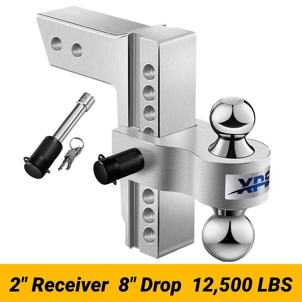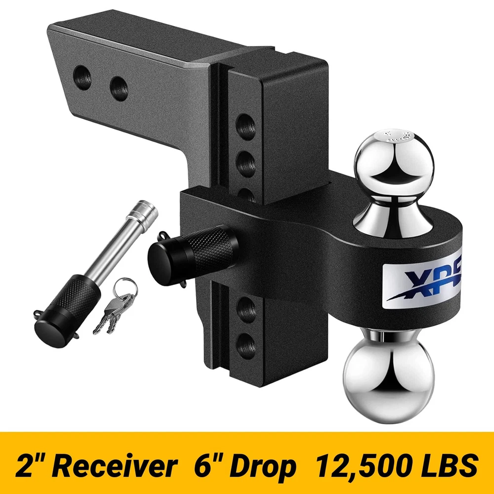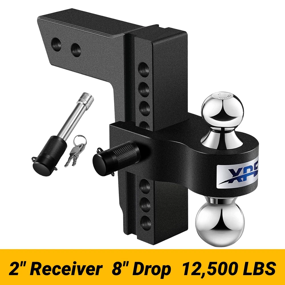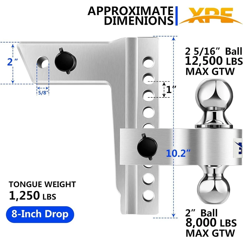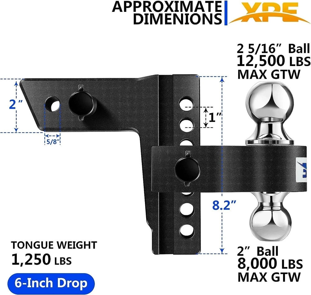 Item Description Material: Aluminum Ball Size: 2" and 2-5/16" Adjustable Height: 3" / 6"/ 8" Drop Distance (Adjusts in 1" Increments) Loading capacity: 2" Ball-8,000 LBS, 2-5/16" Ball -12,500 LBS Pin Hole Diameter: 5/8" Compatible with: Vehicles with 2 " Hitch Mounts Package Includes: Adjustable Steel Tailer Shank, Hitch Ball ( 2" And 2-5/16"), 2 Pin Lock