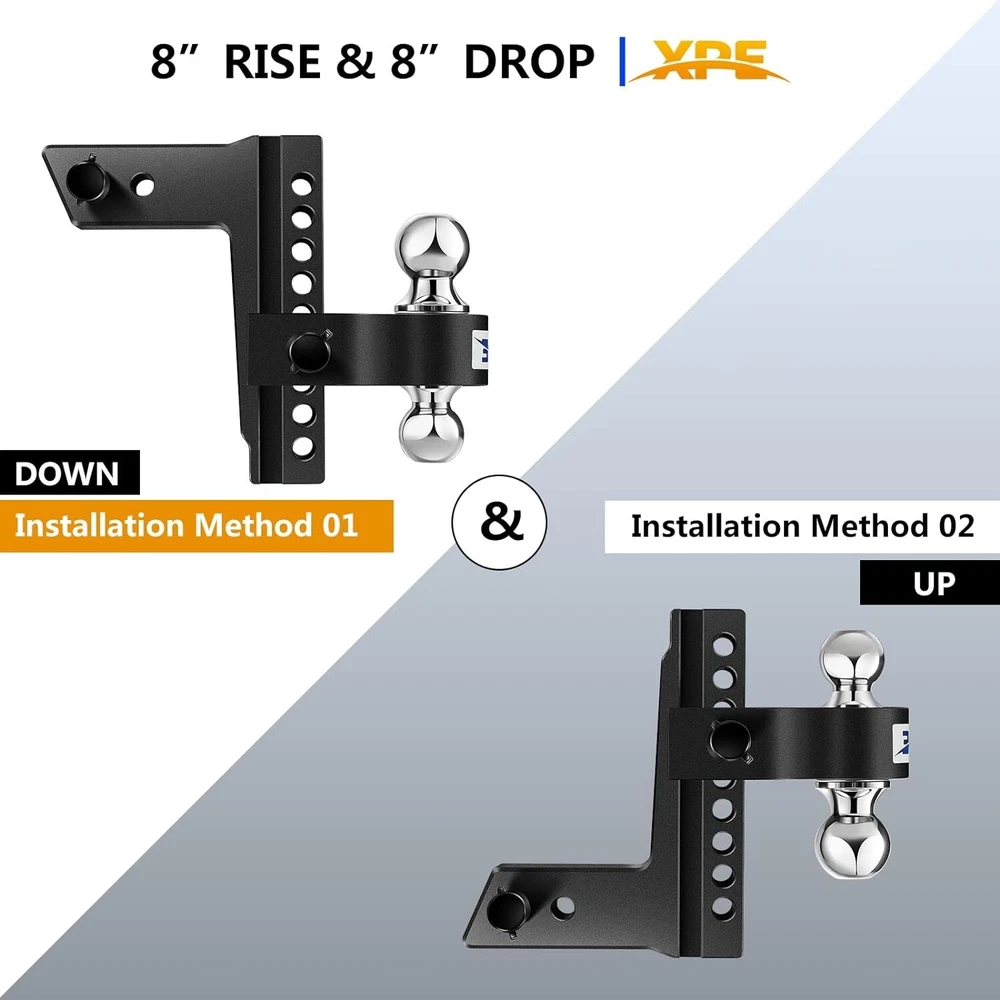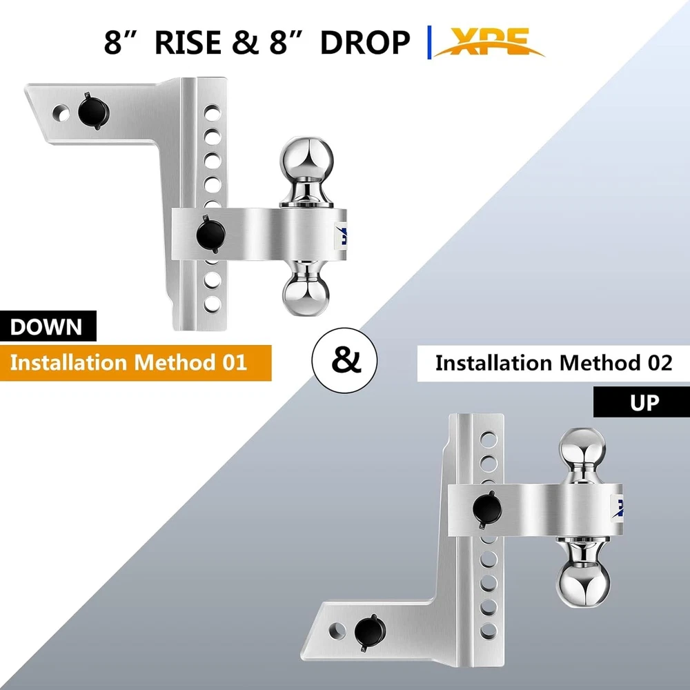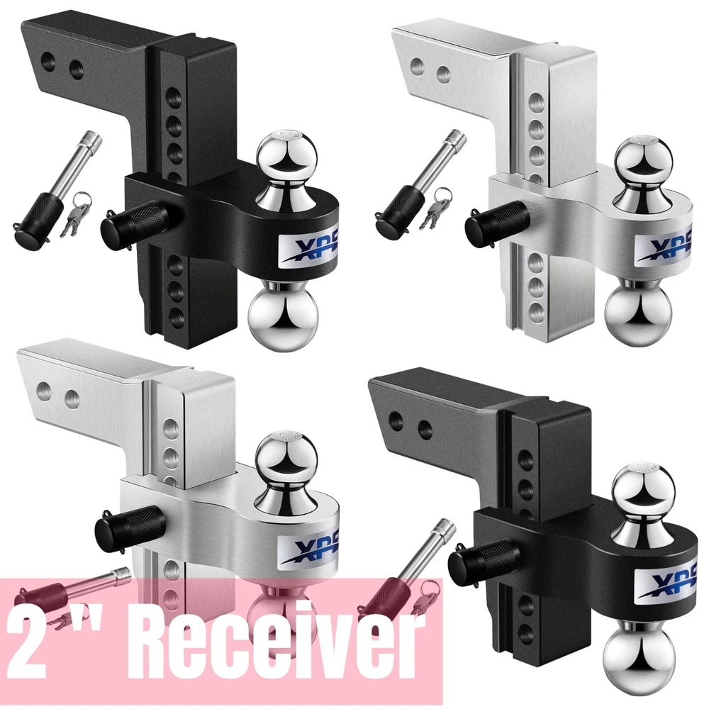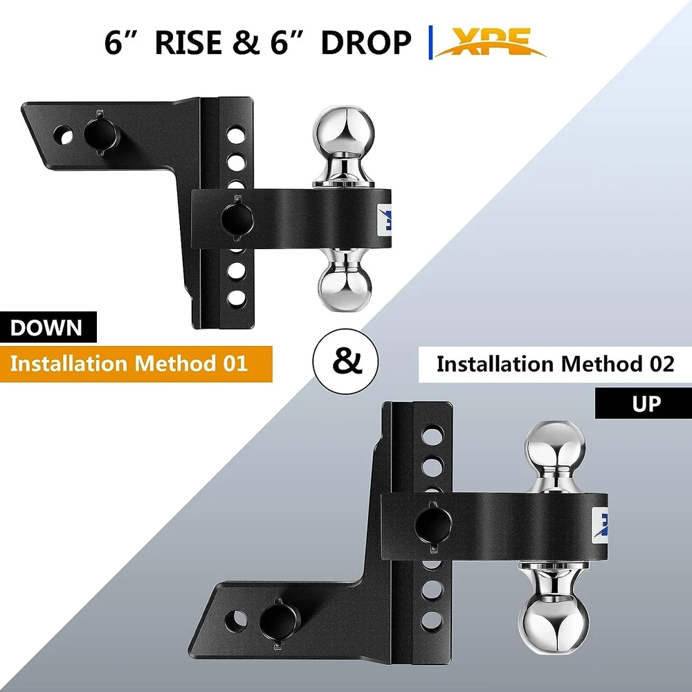 Item Description Material: Aluminum Ball Size: 2" and 2-5/16" Adjustable Height: 3" / 6"/ 8" Drop Distance (Adjusts in 1" Increments) Loading capacity: 2" Ball-8,000 LBS, 2-5/16" Ball -12,500 LBS Pin Hole Diameter: 5/8" Compatible with: Vehicles with 2 " Hitch Mounts Package Includes: Adjustable Steel Tailer Shank, Hitch Ball ( 2" And 2-5/16"), 2 Pin Lock