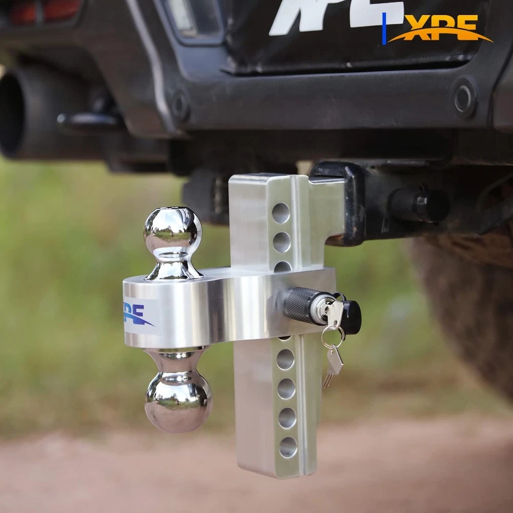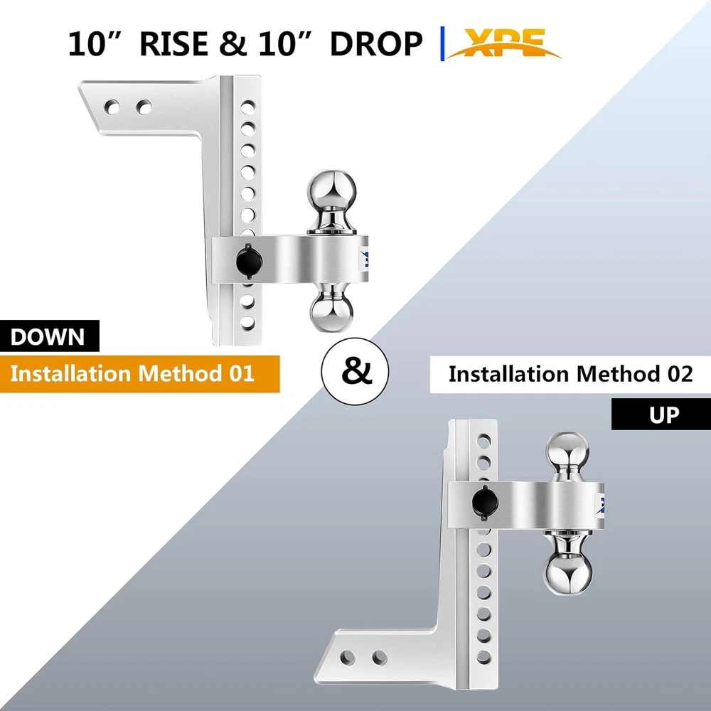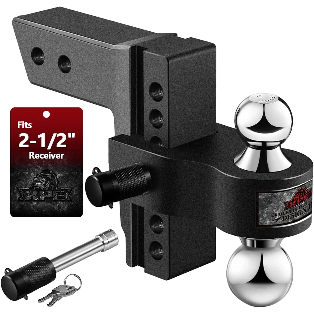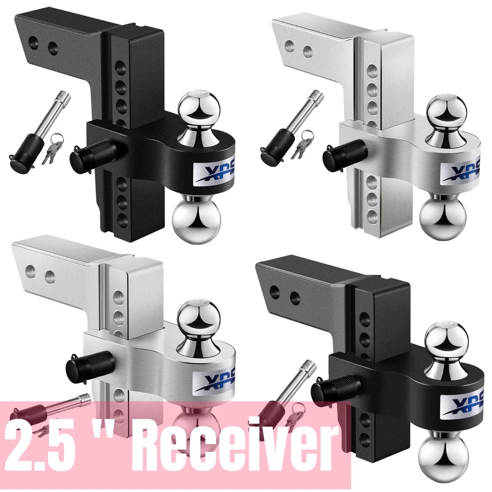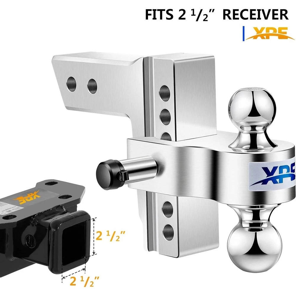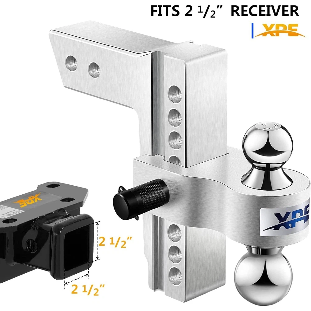 Item Description Material: Aluminum Ball Size: 2" and 2-5/16" Adjustable Height: 10" / 6"/ 8" Drop Distance (Adjusts in 1" Increments) Loading capacity: 2" Ball-8,000 LBS, 2-5/16" Ball -18,500 LBS Pin Hole Diameter: 5/8" Compatible with: Vehicles with 2.5 " Hitch Mounts Package Includes: Adjustable Steel Tailer Shank, Hitch Ball ( 2" And 2-5/16"), 2 Pin Lock