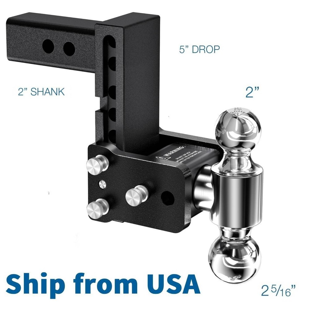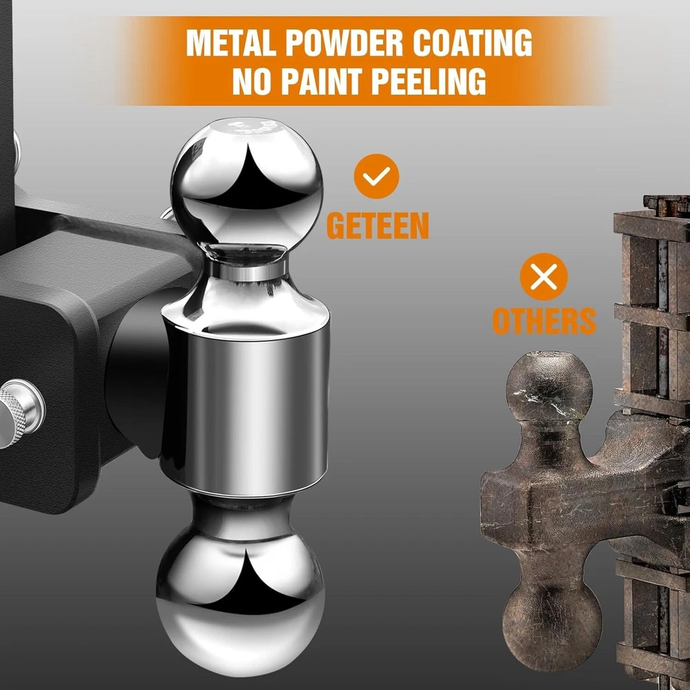 Item Description ⚠️NOTE:Please m easure your receiver hitch to ensure you choose the right item GETEEN Adjustable Ball Mount Trailer Hitch Ideal for safe, stable, and convenient towing—built for performance, durability, and everyday practicality. Adjustable Height for Level Towing Our ball mount trailer hitch is fully height-adjustable to deliver perfectly level towing. Simply pull the two stainless steel adjustment pins to raise or lower the hitch to the ideal position for your vehicle and trailer setup. The ball assembly rotates smoothly, letting you quickly swap between different ball sizes for versatile use. Convenient Stowable Design Keep your hitch handy but out of the way when not towing. Just rotate the hitch under your vehicle, reinsert the pins, and it stays safely tucked away—protecting your shins from bumps and avoiding damage to garage doors. Built for Maximum Safety & Durability Safety and durability come first with the GETEEN drop hitch. Forged from high-strength thick steel , it’s lightweight yet extremely sturdy, providing superior strength and toughness to handle heavy loads without bending or breaking. The surface is protected with a premium metal powder coating to resist rust and corrosion, standing up to harsh weather and extending the service life of your hitch. Better Quality, Half the Price Produced in Ohio, this GETEEN adjustable drop hitch delivers the same excellent quality, strength, and reliability as top premium brands—at a much more affordable price. Precision-engineered for wide vehicle compatibility, it fits seamlessly and installs easily. Every hitch passes strict quality testing to meet the highest industry standards, ensuring reliable performance in all towing situations. Dual Anti-Theft Protection The heavy-duty anti-theft lock is made from high-grade metal, making it extremely difficult to pry or cut with standard tools. The adjustable arm and ball assembly use an integrated anti-disassembly design —even if the lock is damaged, the hitch cannot be easily separated, greatly reducing theft risk. High Towing Capacity This adjustable tow hitch provides a 5-inch vertical adjustment range to achieve stable, horizontal towing. Only compatible with 2.5-inch receiver devices. 2" hitch ball: 8,000 lbs towing capacity 2‑5/16" hitch ball: 15,000 lbs towing capacity