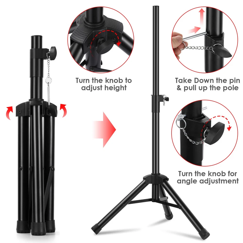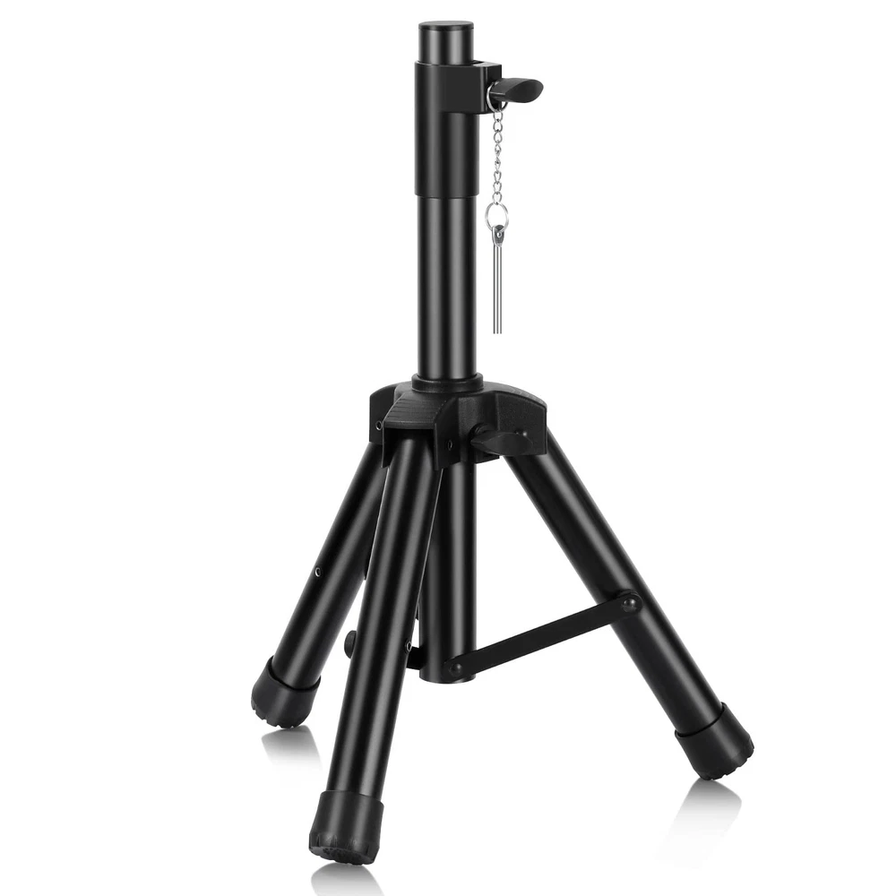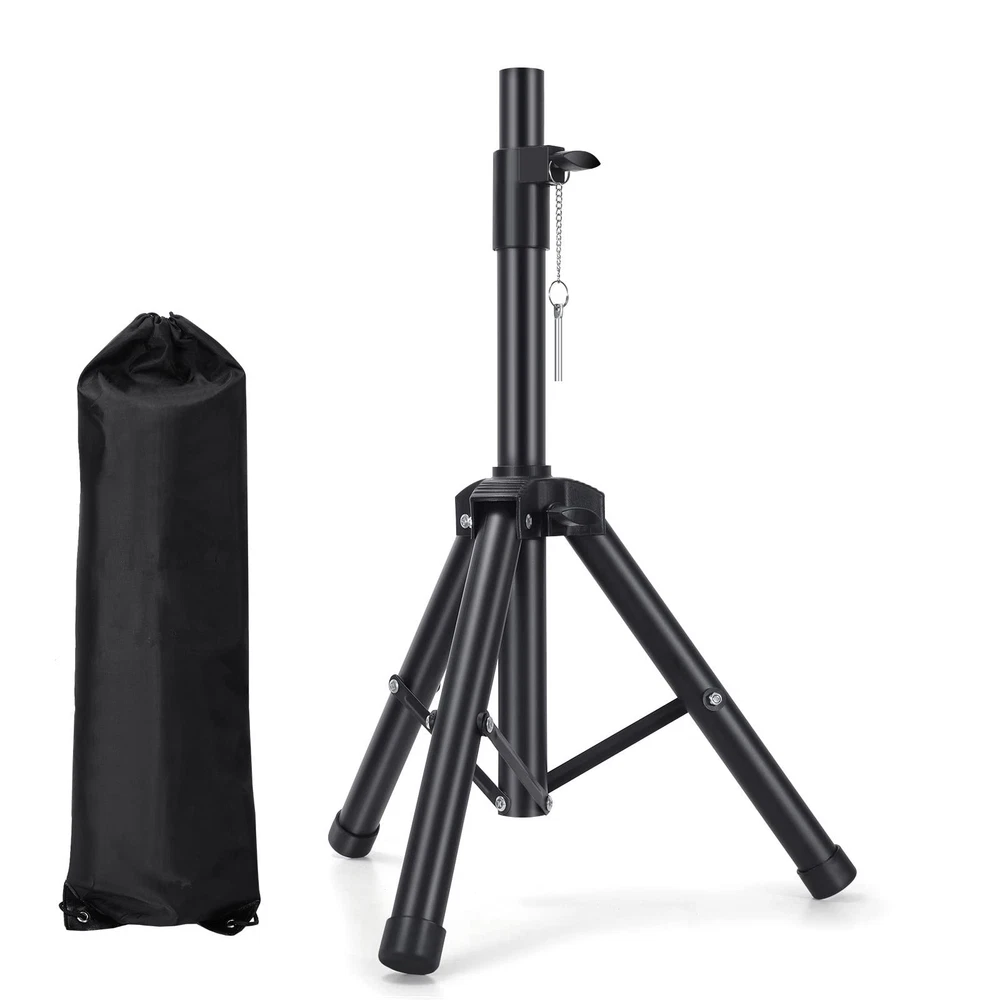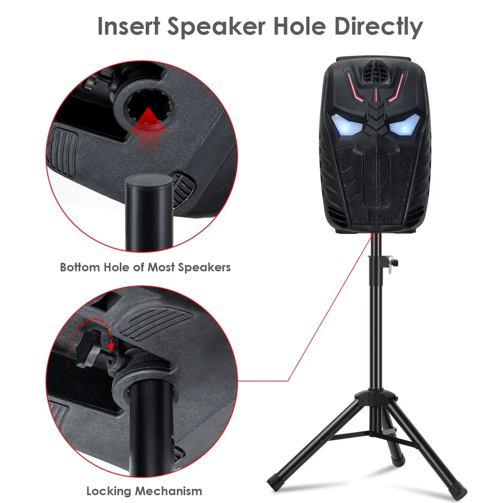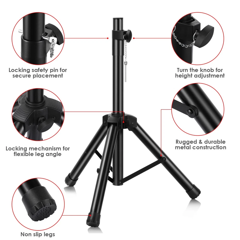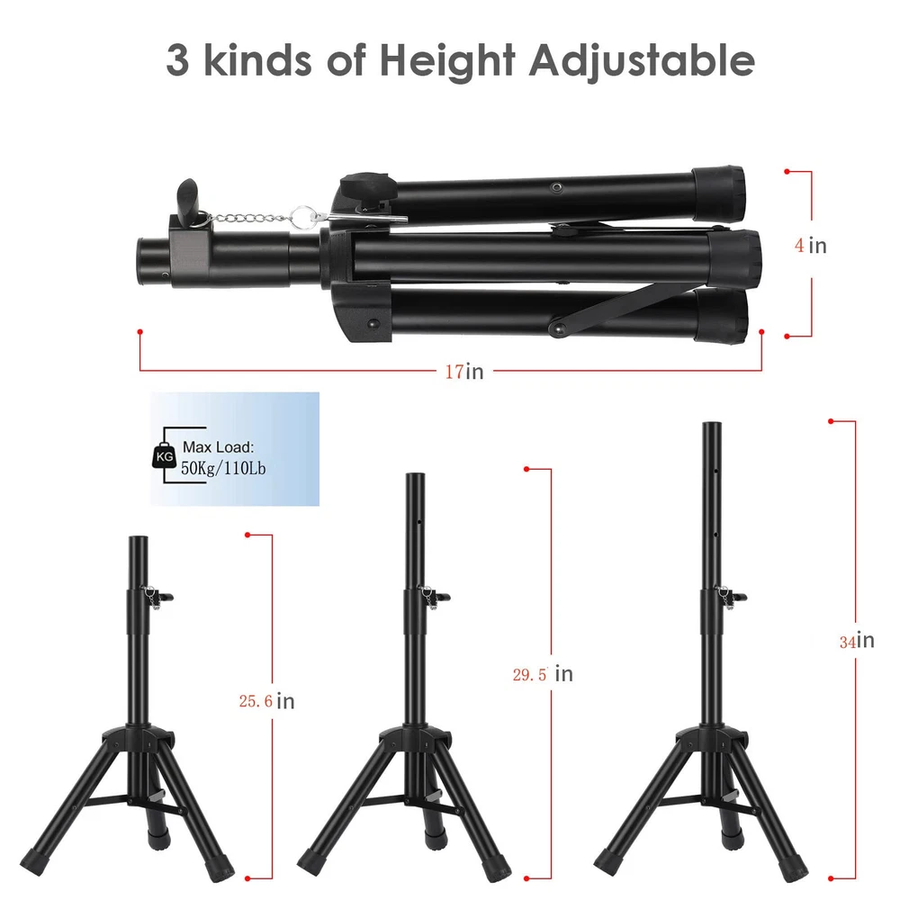 1.Adjustable Height:20inches-33inches 2.Load capacity up to 80 lbs 3.Heavy Duty Steel Construction,Weight Capacity: 1.4 lbs. 4.Includes: (1) Tripod Speaker Stands. (2) Carry bag for the stands 1.Adjustable Height:20inches-33inches(small size) 2.Load capacity up to 80 lbs 3.Heavy Duty Steel Construction,Weight Capacity: 1.4 lbs. 4.Includes: (1) Tripod Speaker Stands. (2) Carry bag for the stands 5.Can hold small speaker, recommended size of speaker under 10 inches