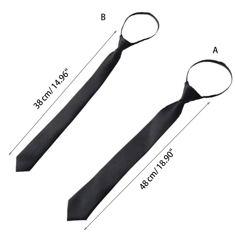 brand new and high quality Features: The stylish zipper and black color more convenient and quick to use. The appearance is solemn and for noble, using high-quality materials, soft and smooth. Pre-tied and use a comfortable zipper closure to keep the ties in place, easy to wear. Perfect for weddings, proms, semiformal formal important business meetings and Two sizes optional, suitable for most women and men. It can be a decent gift, or a graceful present for self use. Specification: Material: Polyester Silk Color: Black Optional A Men, B Women Men's Necktie Length: approx. 48cm/18.90in Women's Necktie Length: approx. 38cm/14.96in Quantity: pc Note: 1cm=10mm=0.39inch No retail package. Please allow 1-3mm error due to manual measurement. pls make sure you do not mind before you bid. Due to the difference between different monitors, the picture may not reflect the actual color of the item. Thank you! Package includes: x Neck Tie(other accessories in the picture is not included.)